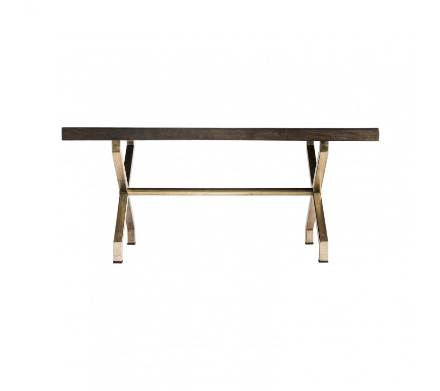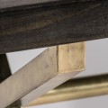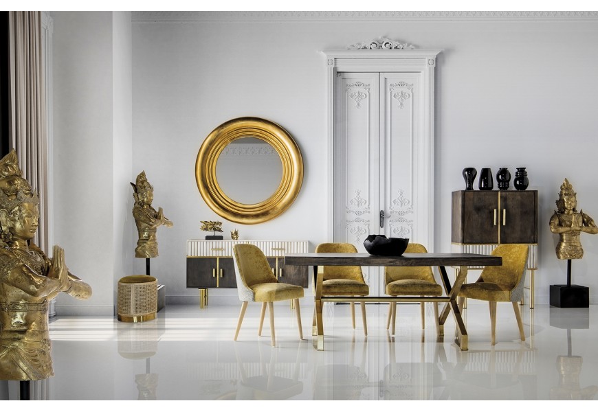 Luxusný jedálenský stôl Krai s výraznou dekoratívnou doskou sa stane stredobodom pozornosti každej jedálne s nádychom obľúbeného Art-deco štýlu. Hrubá drevená doska z kvalitného mangového dreva je na pohľadovej časti tvorená množstvom kusov, ktoré sú usporiadané do dynamického obrazca hviezdice a priťahujú zrak vašich hostí. Rozmer stolovej dosky je dostatočný pre pohodlné stolovanie až osem osôb. Tmavý odtieň masívnej časti je doplnený kovovými nohami v zlatom odtieni s jemnou patinou, ktorá umocňuje pôvab a eleganciu stola. Môžete ho kombinovať s luxusnými produktmi z našej širokej ponuky nábytku a doplnkov. Ak máte radi štýlovú čistotu, odporúčame ho doplniť prvkami z rovnomennej kolekcie Krai, v ktorej nájdete ladiaci príborník či zariadenie do obývačky v rovnakom prevedení.