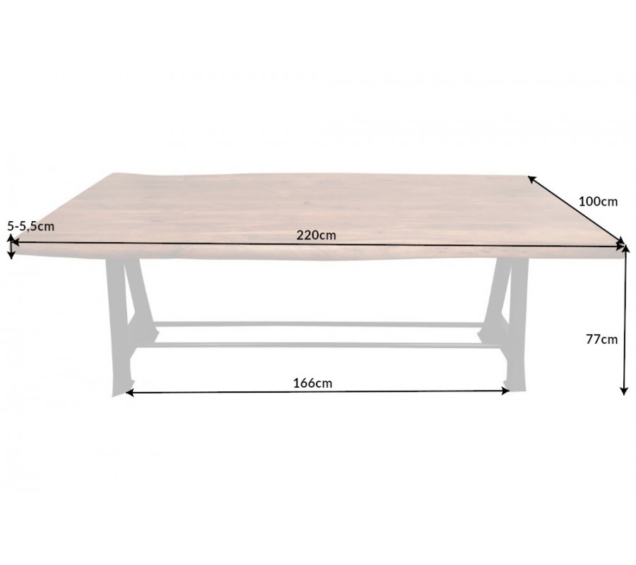 Jedinečná kombinácia masívnej hranatej dosky jedálenského stola Mammut z dreva akácie a výraznej kovovej konštrukcie sa stane neprehliadnuteľnou v každom interiéri. Masívna akáciová doska je ošetrená a lakovaná, drobné nedokonalosti dreva sú zámerne ponechané a prispievajú k celkovému industriálnemu vzhľadu stola. Výrazným prvkom je kovová konštrukcia v typicky industriálnom štýle, ktorý dokonale vynikne vo vzdušných priestoroch s vysokými stropmi. Jedálenský stôl Mammut môžete kombinovať so stoličkami z dreva kovu či čalúnenými prvkami, skvele vynikne doplnený ďalšími kúskami z našej rovnomennej kolekcie. Rozmer stolovej dosky je dostatočný pre pohodlné stolovanie až osem osôb.