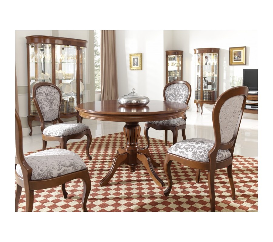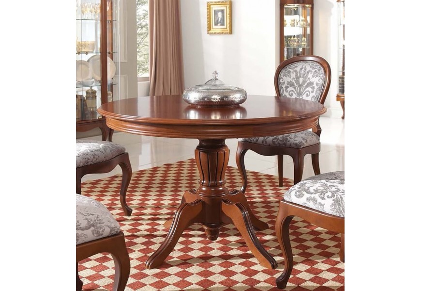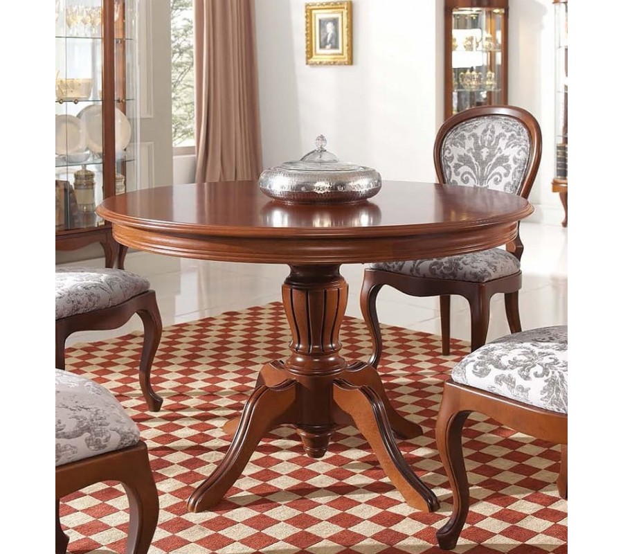 Okrúhly rustikálny jedálenský stôl Chippendale CASTILLA predstavuje vysokokvalitný a nadčasový kúsok do Vašej jedálne v klasickom štýle. Konštrukciu stola, ktorá je vyrobená z kvalitného bukového masívu je možné vyhotoviť s vrchnou doskou o priemere 90 alebo 115 cm. Vyrezávané dekoratívne prvky v kombinácii s masívnym drevom predurčujú tento stôl najmä do rustikálne zariadených priestorov. Rovnako ako všetok nábytok tejto kolekcie, je možné aj tento luxusný jedálenský stôl vyhotoviť vo farebných variantoch podľa vzorkovníka dreva.