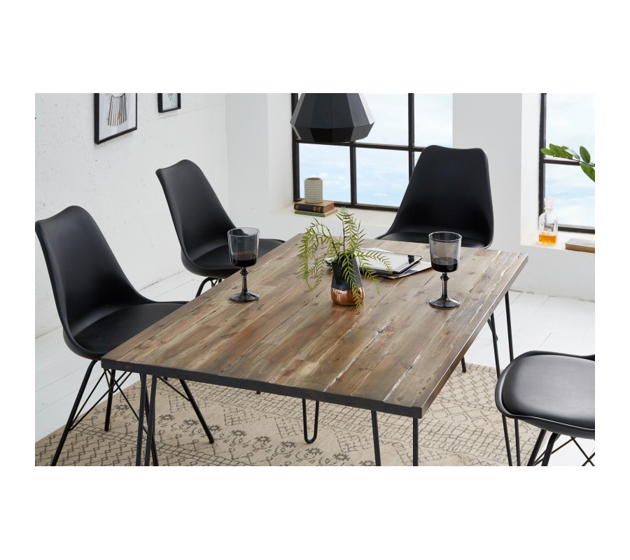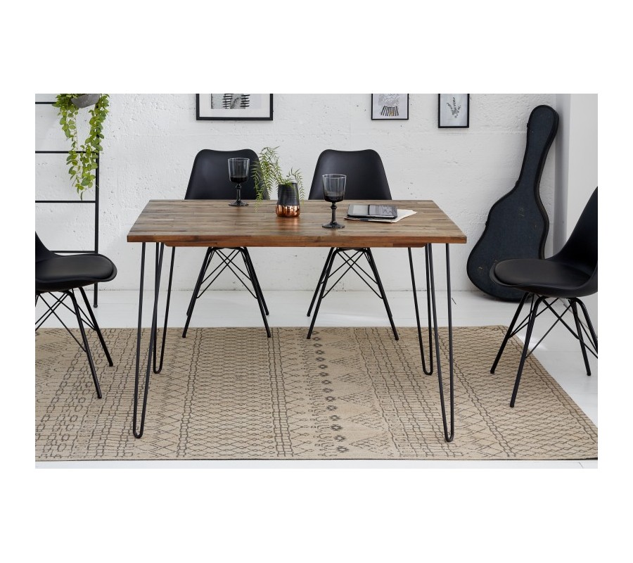 Industriálne ladený jedálenský stôl je vyrobený z masívneho trvanlivého akáciového dreva doplnený štýlovými kovovými nohami v čiernej farbe, ktoré mu dávajú industriálny vzhľad. Horná drevená doska tohto stola je z dyhovanej exotickej akácie a má na povrchu zachovanú štruktúru dreva ošetrenú kvalitným lakom. Nerovnosti na štruktúre dosky tohto stola navodzujú tomuto kúsku opotrebovaný vzhľad, ktorý spolu s tvarom nožičiek tohto jedálenského stola navodzujú dojem retro štýlu. Za tento jedálenský stôl sa zmestí maximálne 6 osôb. Vhodný je do industriálne ladených priestorov a odporúčame ho doplniť stoličkami tak isto na kovových nožičkách ako má tento stôl.