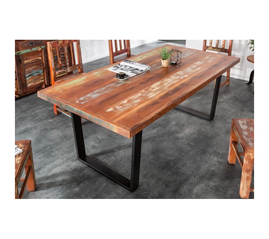 Jedinečný dizajnový jedálenský stôl Sevii vás zaručene zaujme najmä vďaka svojmu inovatívnemu dizajnu a vďaka využitiu recyklovaného masívneho dreva. Doska v prírodných odtieňoch pôsobí originálne a netradične, v kombinácii s čiernymi kovovými nohami tvorí príjemný kontrast. Keďže ide o ručne spracovávaný, prírodný produkt, na dreve sa môžu vyskytnúť farebné či tvarové odchýlky, vďaka ktorým je každý kúsok originál. Skvelo vynikne v moderných či alternatívne zariadených interiéroch v kombinácii s masívnym nábytkom a prírodnými farbami.