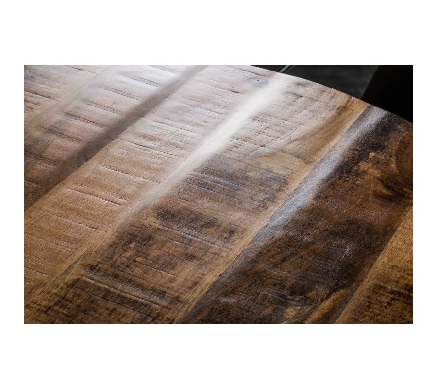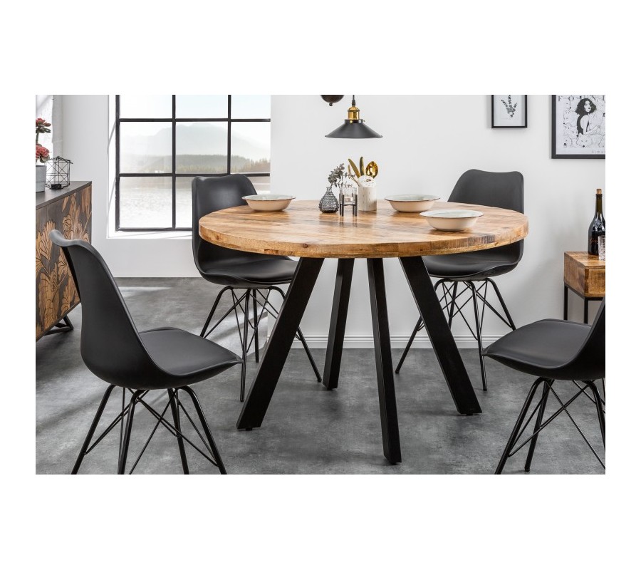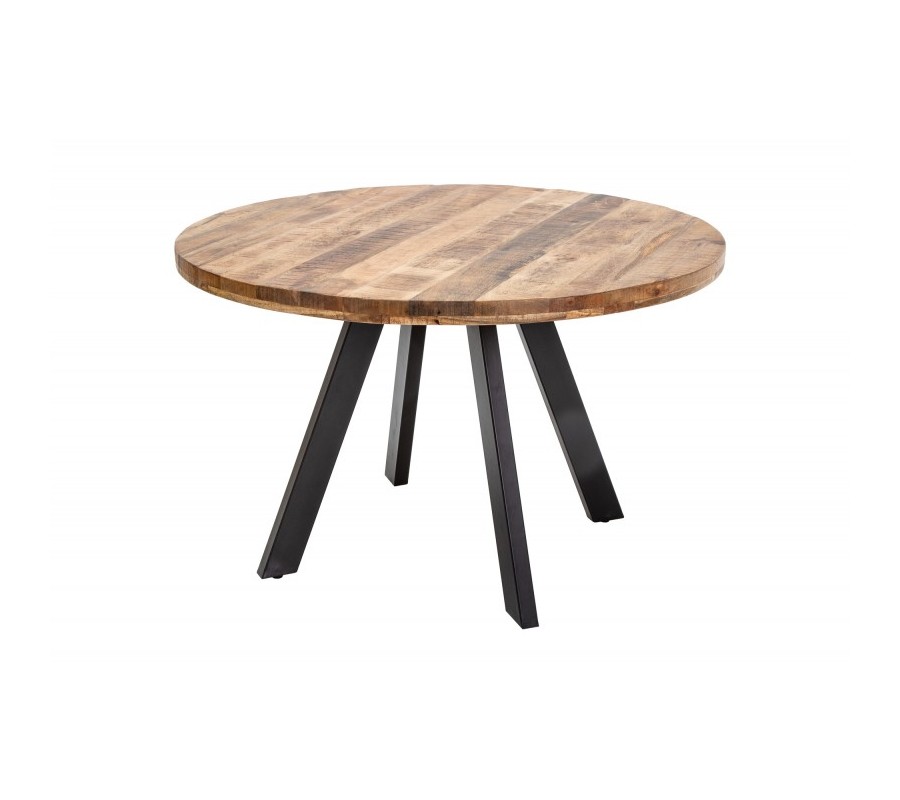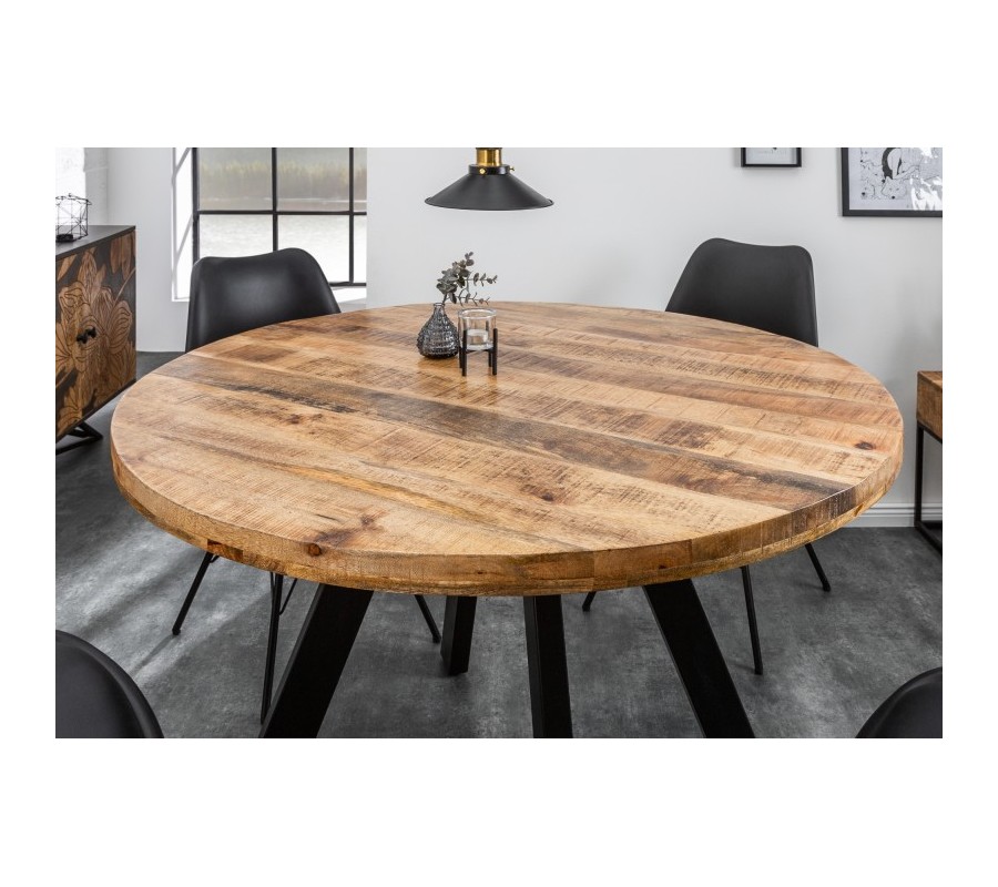 Okrúhly jedálenský stôl z kolekcie Steele Craft krásne vynikne v industriálne či moderne ladenom interiéri. Jeho zaujímavý kruhový tvar je praktický a poslúži pre pohodlné stolovanie štyroch osôb. Povrchová doska je vyrobená z kvalitného masívneho mangového dreva a jeho prírodná svetlohnedá farba vytvára príjemnú kombináciu s čiernymi kovovými nohami. Je zámerne opracovaná tak, aby sa zvýraznila štruktúra dreva, ktorú možno cítiť aj na dotyk. Skvelo zapadne do svetlých industriálnych či škandinávskych priestorov v kombinácii s masívnym nábytkom, taktiež vynikne v kombinácii s jemnými, prírodnými farbami.