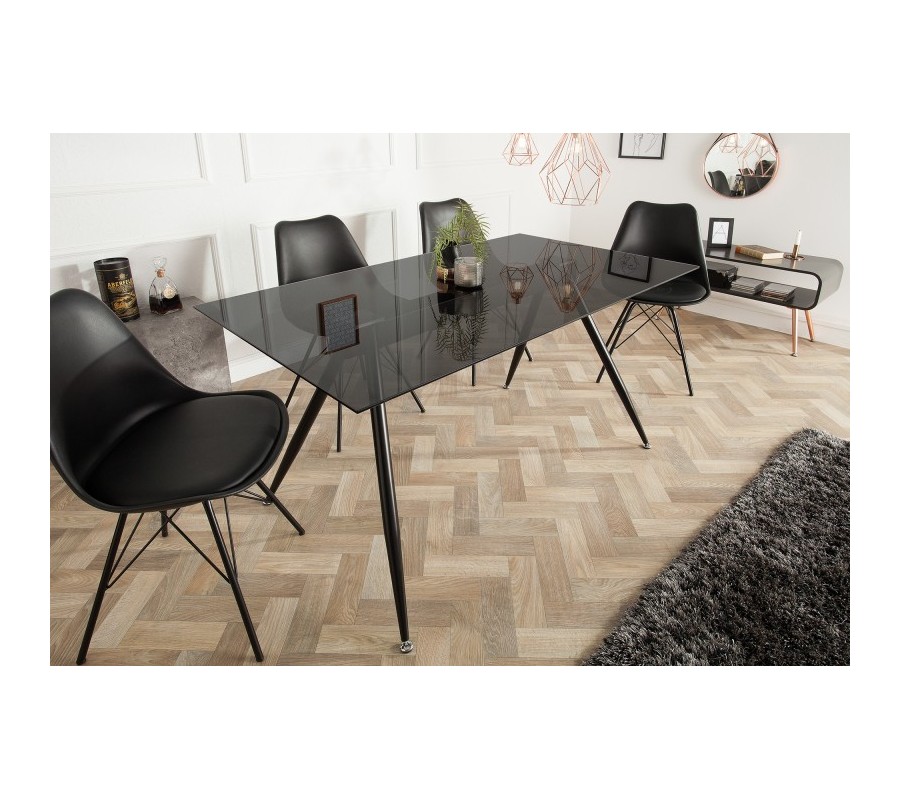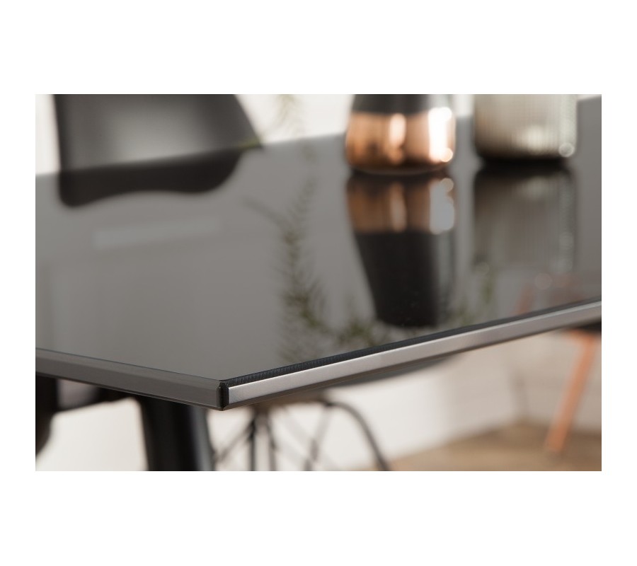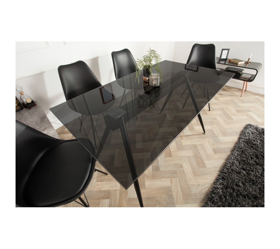 Moderný sklenený jedálensky stôl Ghost je vyrobený zo skla a štyroch kovových nožičiek. Vhodnou kombináciou sú interiéry zladené v modernom štýle. Dokonalo sa kombinuje s inými prvkami v čiernom farebnom vyhotovení. Výrobok je vyhotovený ručnou prácou, preto je unikátny. Dominantným na tomto jedálenskom stole je jeho horná doska vyrobená z tvrdeného bezpečnostného skla, ktoré je po jeho hranách a rohoch vkusne zabrúsené. Sklenená horná doska mu dodáva nádych luxusu. Originálny dizajn a unikátny tvar vytvára interiéru výnimočnosť a osobitnosť. Obohaťte si svoj interiér o tento nový kúsok.