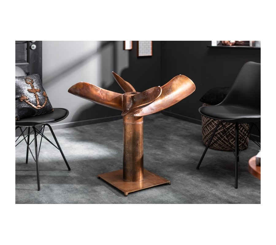 Industriálny bronzový jedálenský stôl Helice v tvare lodnej skrutky s okrúhlou doskou zo skla 94cm