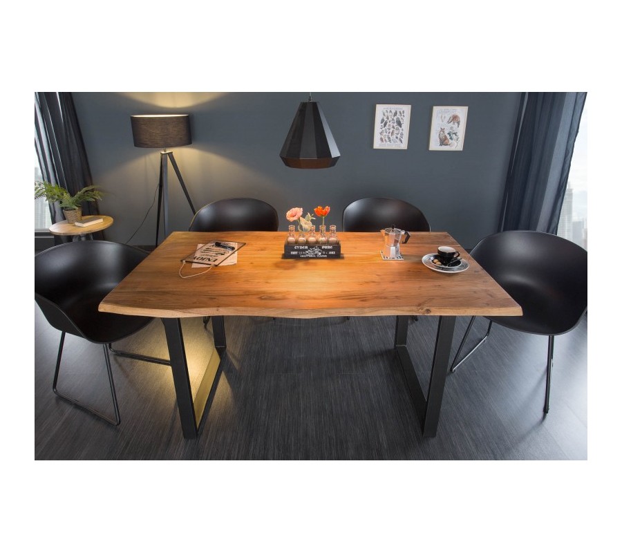Jedálenský stôl Mammut z našej rovnomennej kolekcie je štýlovým kúskom, ktorý vynikne najmä v industriálne alebo alternatívne ladených interiéroch. Povrchová doska je vyrobená z kvalitného masívneho akáciového dreva s úpravou, ktorá navnadí prírodný dojem, rovnako ako jeho zaujímavý organický tvar. Vďaka ručnej výrobe je každý kúsok jedinečný a originálny. Naturálnej doske kontrastujú kovové nohy v čiernej farbe, ktoré stolu dodávajú industriálny nádych. Jedálenský stôl Mammut skvelo poslúži v moderných jedálňach pri stolovaní v kombinácii s tmavými farbami a masívnym nábytkom. Hrúbka dosky stola 26mm.