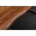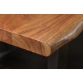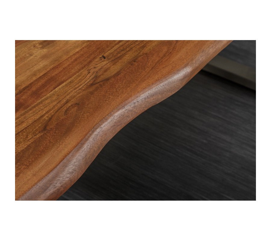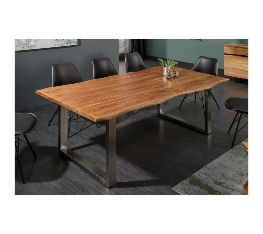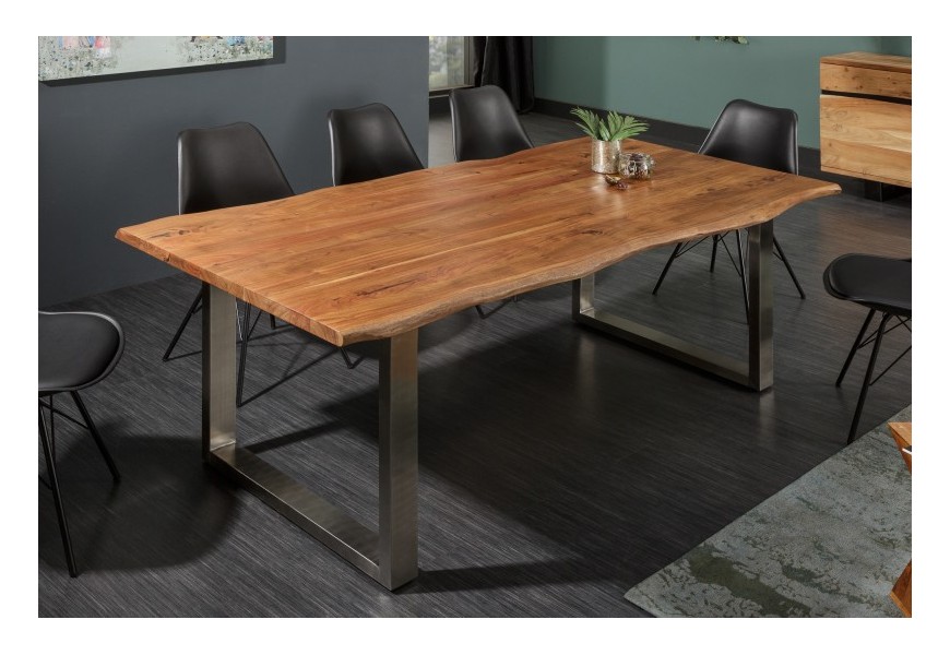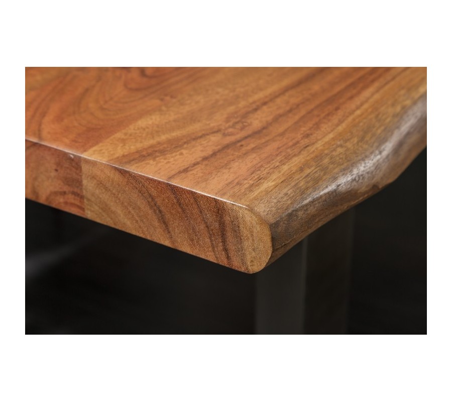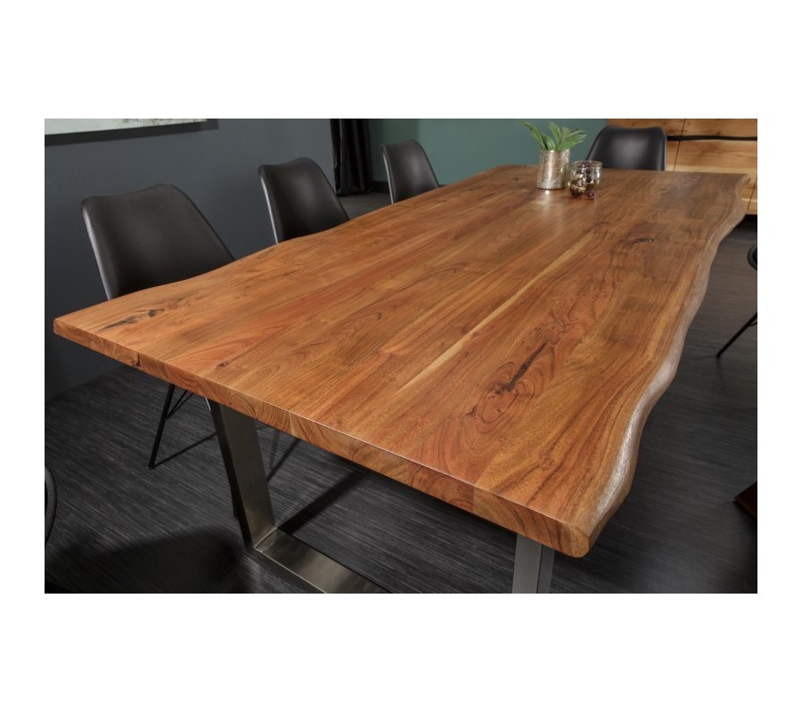 Dizajnový jedálenský stôl z našej kolekcie nábytku Mammut je štýlovým kúskom, ktorý vynikne najmä v industriálne alebo moderne ladených interiéroch. Povrchová doska je vyrobená z kvalitného masívneho akáciového dreva s úpravou, ktorá navnadí prírodný dojem. Na doske taktiež možno vidieť zaujímavú kresbu dreva, a prírodný dojem umocňuje aj organický tvar jednotlivých hrán. Naturálnej doske kontrastujú kovové nohy v čiernej farbe, ktoré stolu dodávajú industriálny nádych. Jedálenský stôl Mammut skvelo poslúži v moderných jedálňach pri stolovaní v kombinácii s tmavými farbami a masívnym nábytkom. Hrúbka dosky je 35mm.