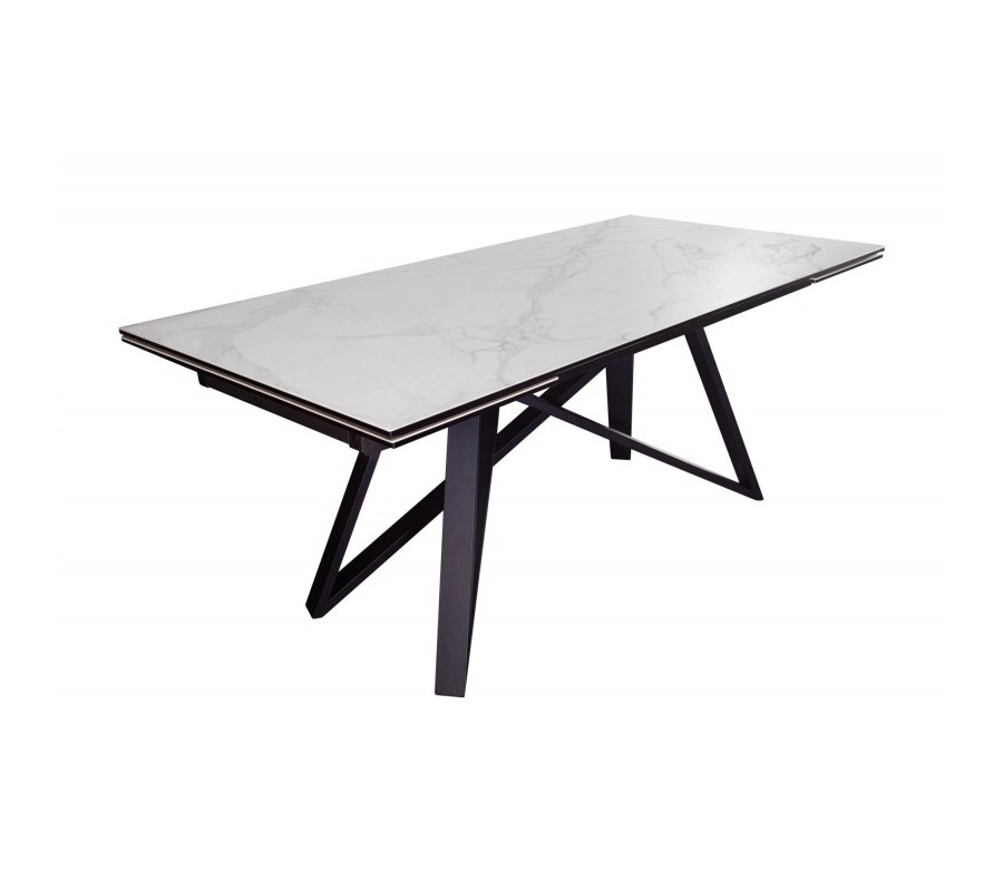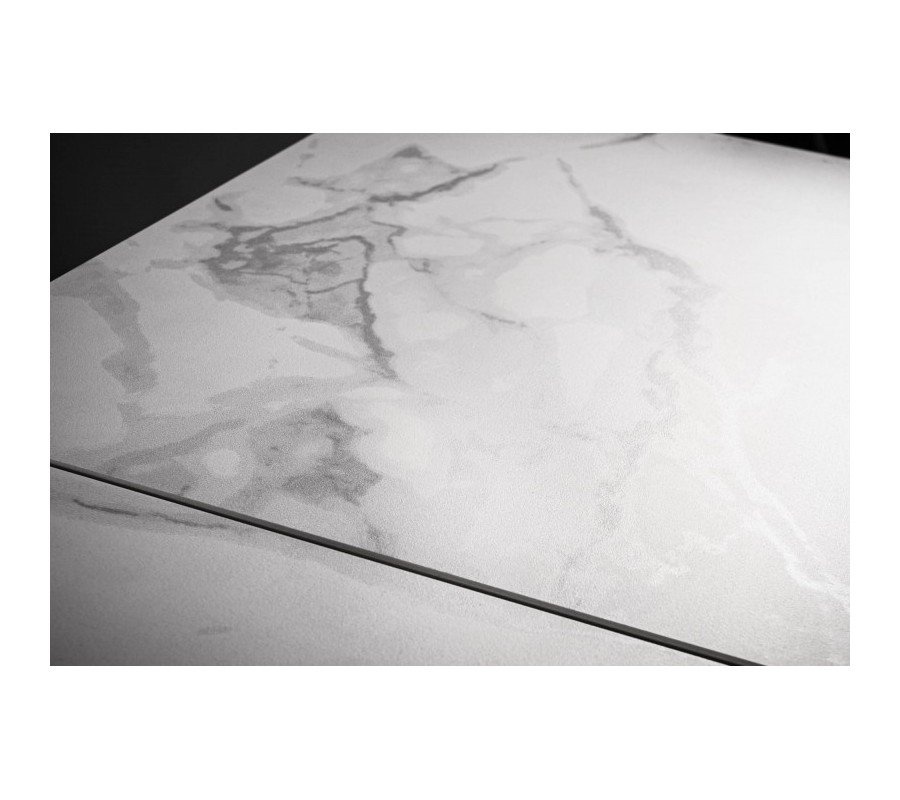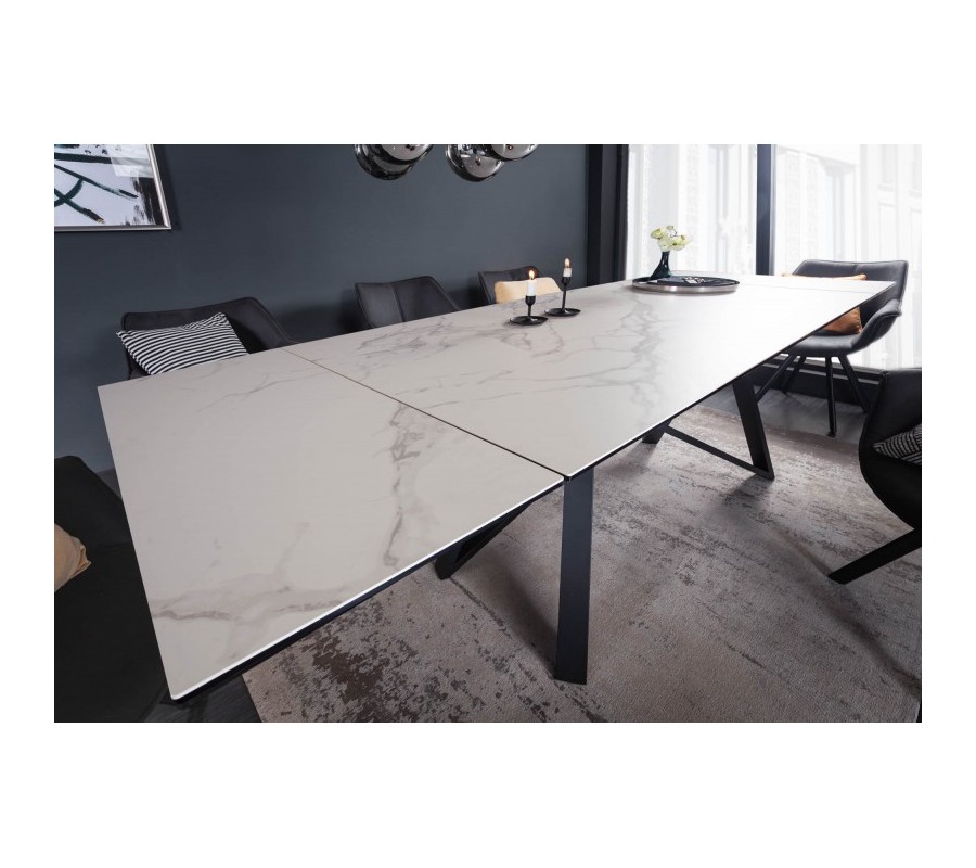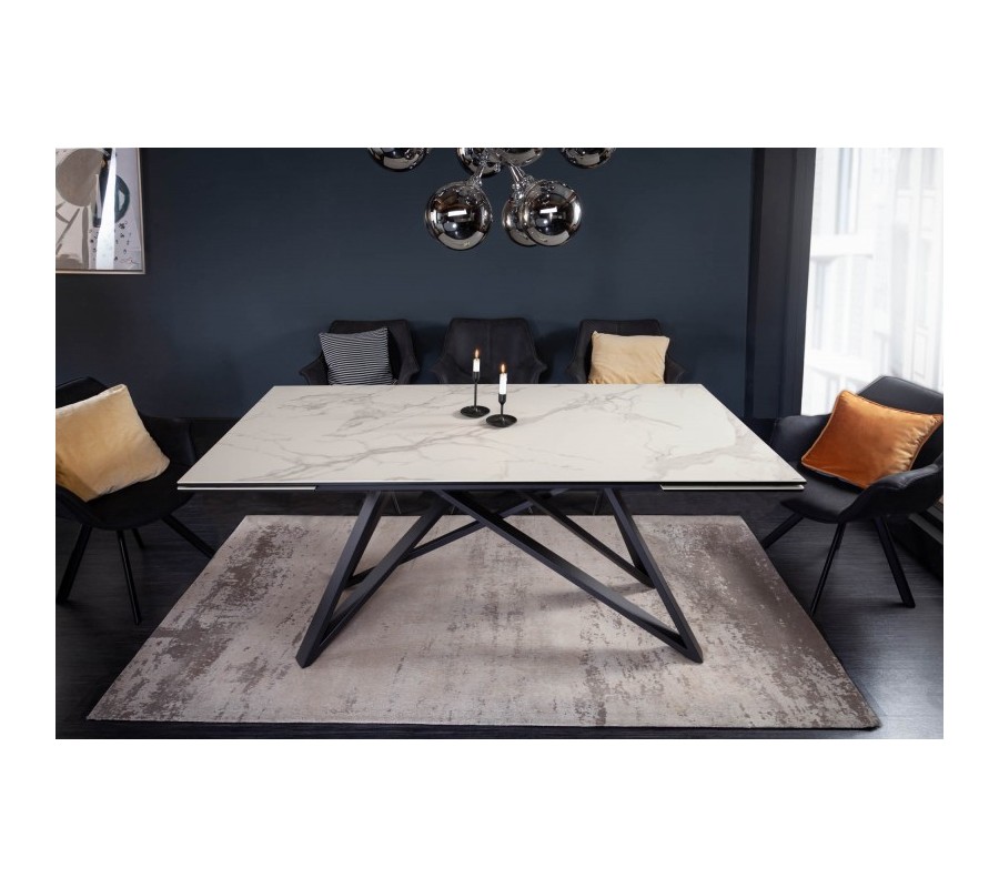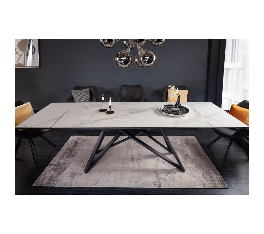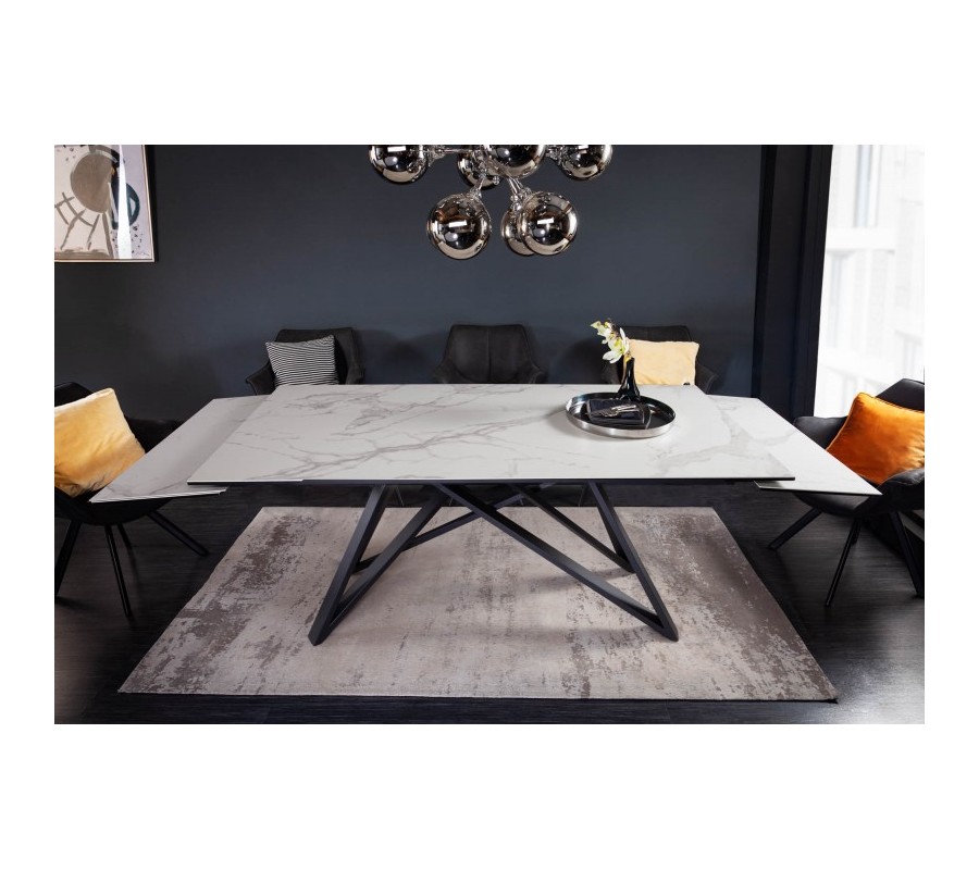 Keramická doska jedálenského stola Epinal s hrúbkou len 13 mm je vďaka vlastnostiam tvrdeného skla bezpečná a mimoriadne moderná. Tenká doska vytvára minimalistickú líniu a podľa potreby je možné ju zložiť. Vďaka svojej hrúbke doska využíva praktický systém vysúvania a zasúvania, čím je možné stôl rozložiť až do troch rozličných dĺžkových rozmerov - 180 cm, 220 cm a 260 cm. Keramická doska s mramorovým efektom je doplnená nadčasovou kovovou konštrukciou v dynamickom tvare prekríženej hviezdice. Tento štýlový kúsok dokonale doplní vašu priestrannú jedáleň s kovovými či kamennými modernými prvkami. Môžete ho doplniť stoličkami z kovu, ktoré sa harmonicky doplnia s nohami stola alebo jeho tvrdý povrch zjemniť pridaním mäkkých čalúnených kúskov.