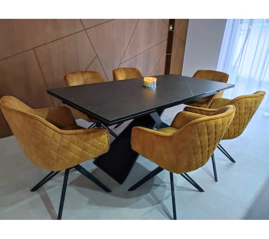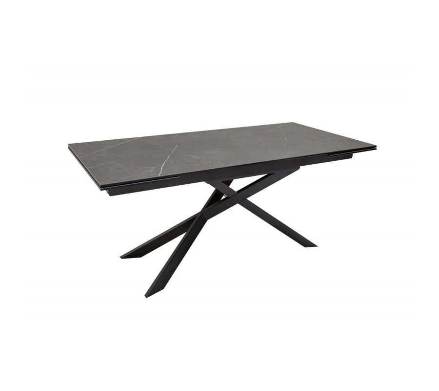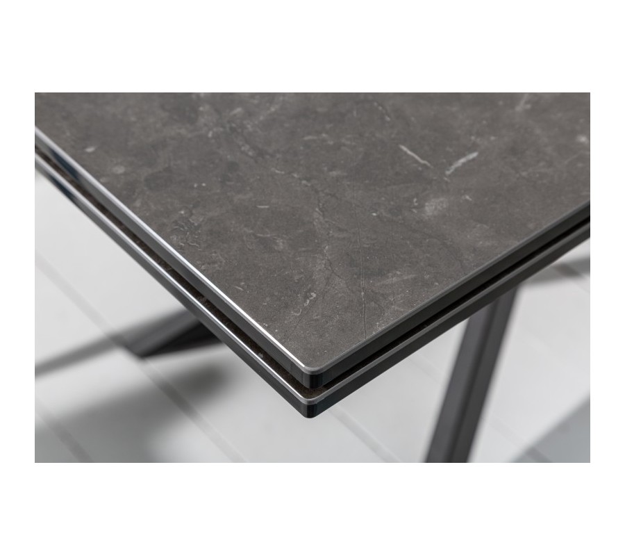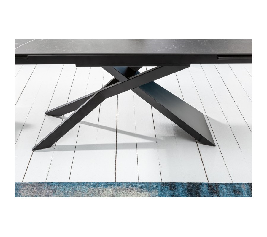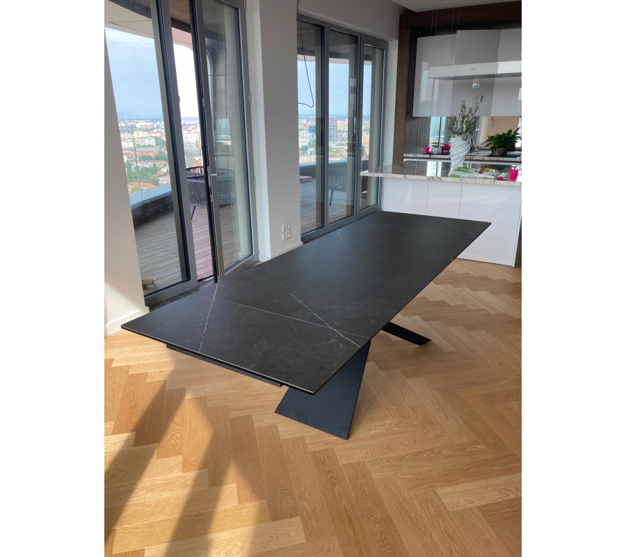 Moderný jedálenský stôl Marmol spája mramorový vzhľad dosky s hrubými industriálnymi nohami. Nadčasová línia stolovej mdf je doplnená vrstvou keramického povrchu a bezpečnostného skla, ktoré sú hrubé len 13 mm. Podľa potreby stolujúcich je možné dosku jednoducho zasúvať. Pomocou výsuvného mechanizmu môžete dĺžkové rozmery stola v závislosti od počtu osôb meniť až v troch rozličných veľkostiach - 180 cm, 220 cm a 260 cm. Výrazným prvkom sú čierne kovové nohy v prekríženom asymetrickom tvare, ktoré s patinou na povrchu dosky vytvárajú zaujímavý kontrast. Jedálenský stôl Marmol môžete doplniť stoličkami z kovu, ktoré sa harmonicky doplnia s nohami stola alebo jeho tvrdý povrch zjemniť pridaním mäkkých čalúnených kúskov. Skvele vynikne v modernom interiéri s masívnymi, kovovými či prvkami z kameňa.