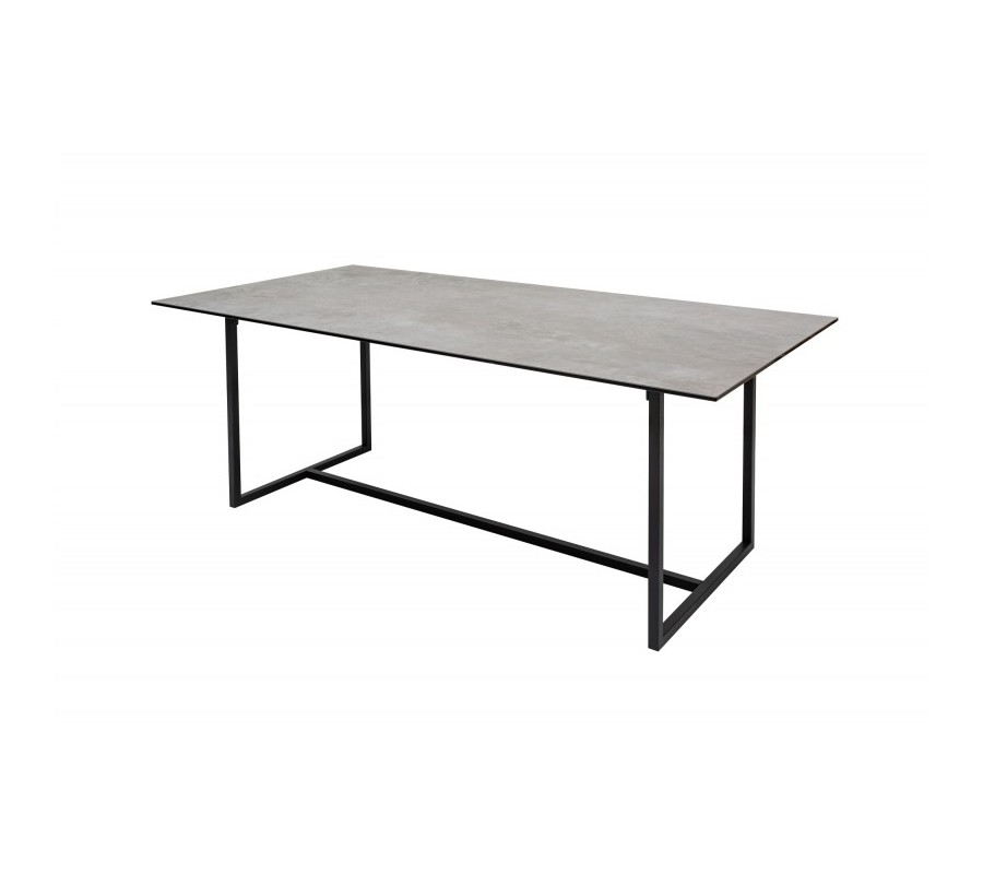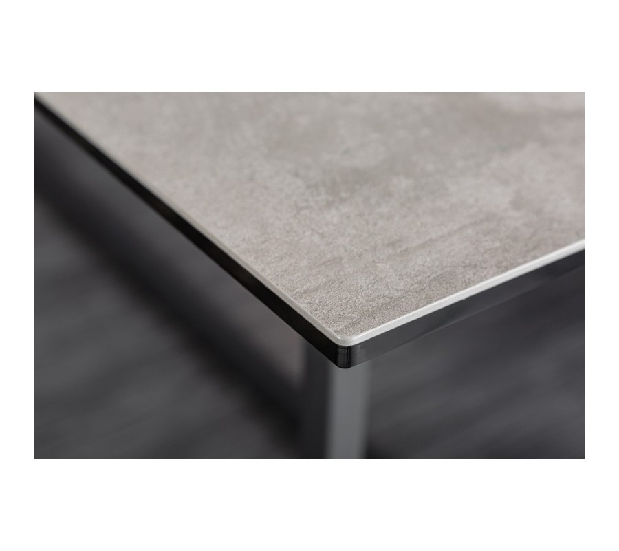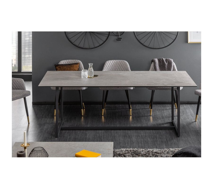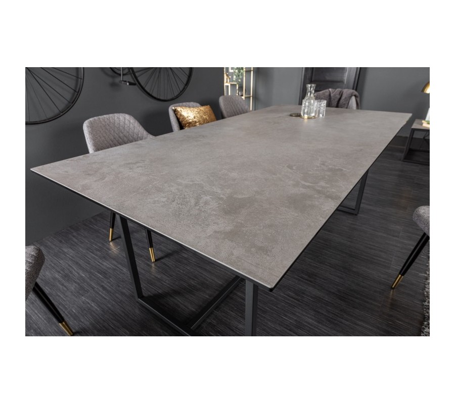 Štýlový a jedinečný dizajn jedálenského stola Collabor je tvorený kombináciou elegantnej keramickej dosky s betónovým efektom a kovovej konštrukcie v univerzálnej čiernej farbe. Stolová doska je vďaka kombinácii bezpečnostného skla a keramickej doky hrubá len 13cm a vytvára tak jedinečnú tenkú a elegantnú líniu. Kovové nohy v nadčasovom geometrickom tvare sú dokončené čiernou práškovou povrchovou úpravou a s betónovou doskou vytvárajú zaujímavý kontrast. Tento štýlový kúsok môžete kombinovať so stoličkami s príjemným textilným či koženým čalúnením. Okrem moderných domácností s industriálnym nádychom dokonale zapadne do priestorov s luxusnými kamennými povrchmi a Art-deco prvkami.