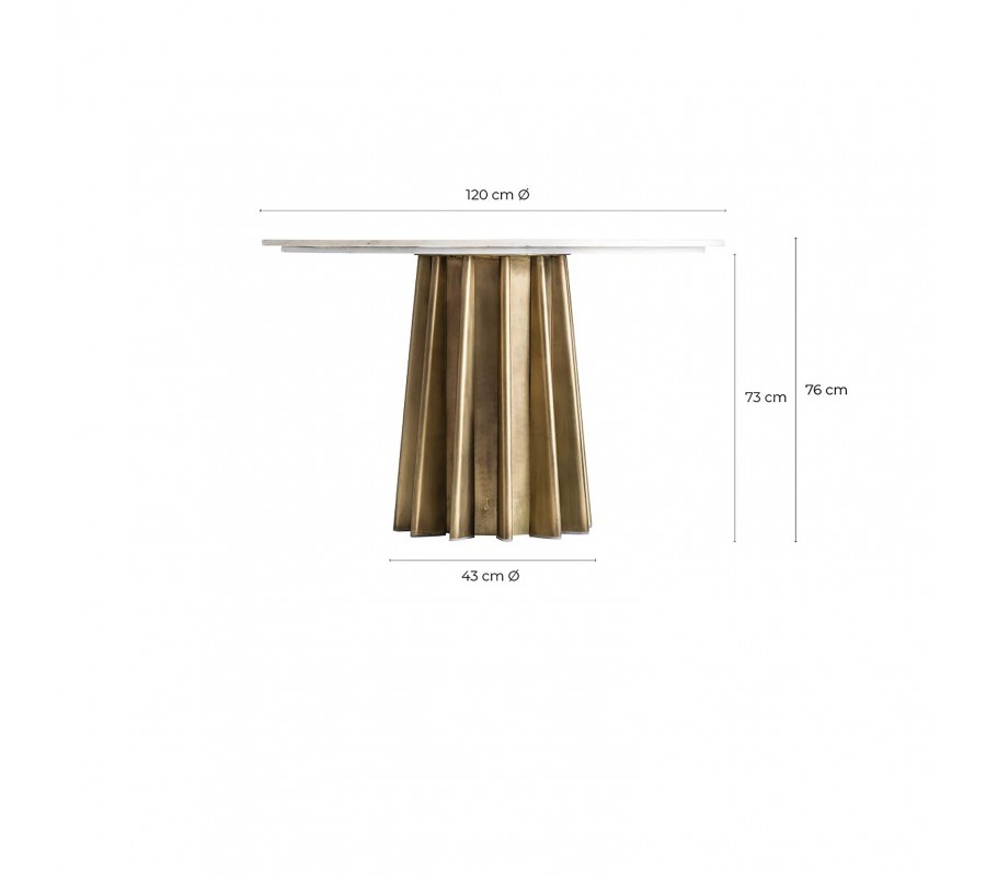 Okázalý dizajn okrúhleho jedálenského stola Lezey sa stane stredobodom pozornosti v každom interiéri. Dekoratívna noha stola pôsobí skutočne skulpturálnym dojmom. Je vyrobená zo železa v zlatom odtieni, ktoré je tvarované v jemnej krivke pripomínajúcej hviezdicu. Jedinečná podstava stola je kombinovaná s luxusnou mramorovou doskou v bledom odtieni, ktorá sa vďaka kruhovému tvaru s podstavou dokonale dopĺňa a pôsobí pôvabným elegantným dojmom. Luxusné povrchy stola dokonale vyniknú v kombinácii so stoličkami so zlatými kovovými nohami a mäkkým čalúnením so zamatovým leskom. Rozmer stolovej dosky je dostatočný pre pohodlné stolovanie až šiestich osôb. Jedálenský stôl Lezey sa bude vynímať s doplnkami v lesklom Art-deco štýle, nemusíte sa báť ani kombinácie so vzormi a výraznými farbami.