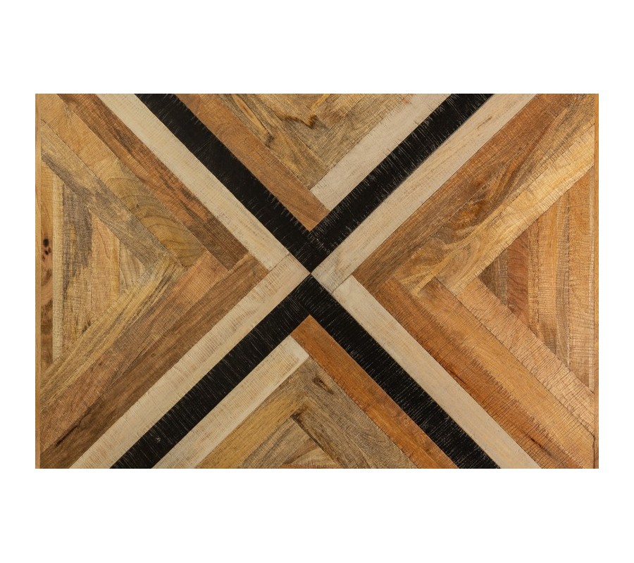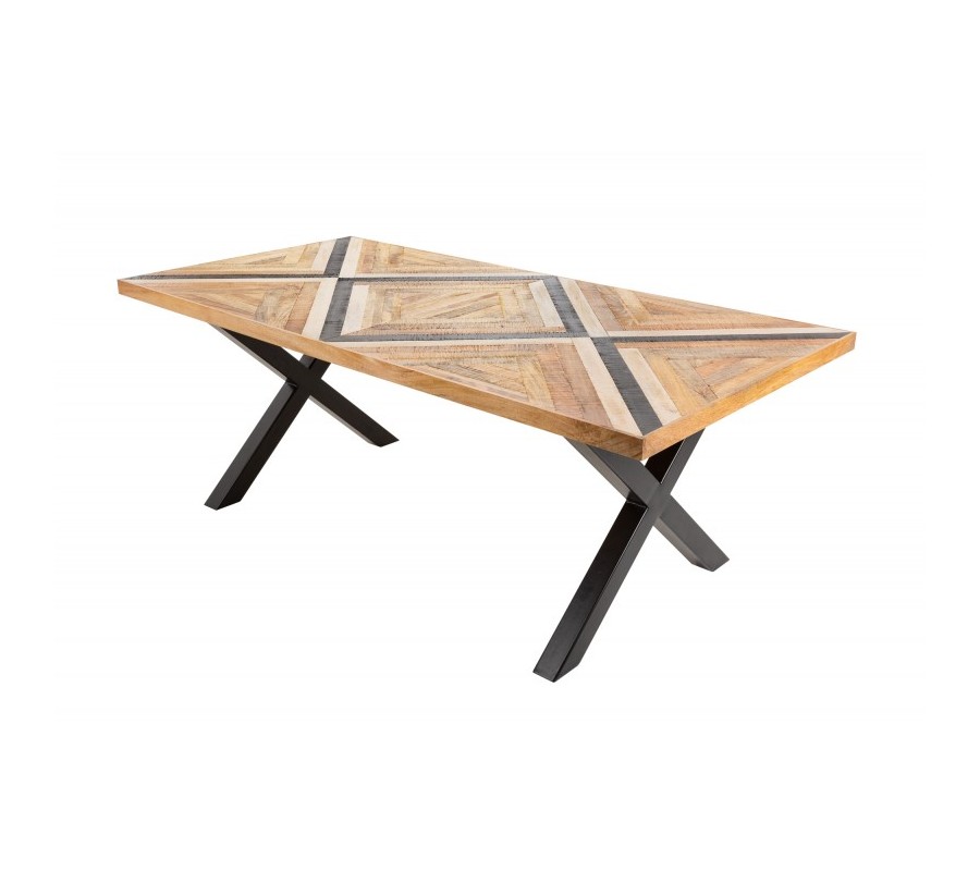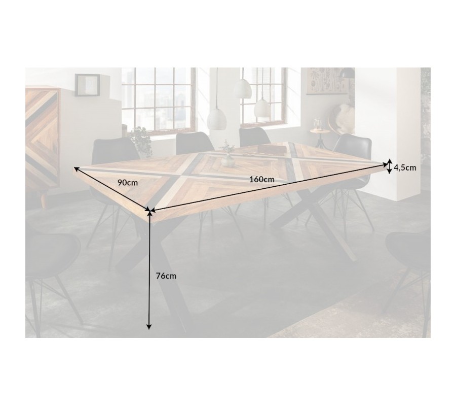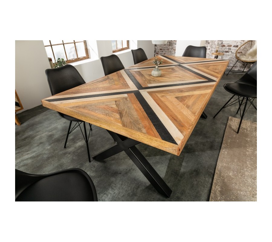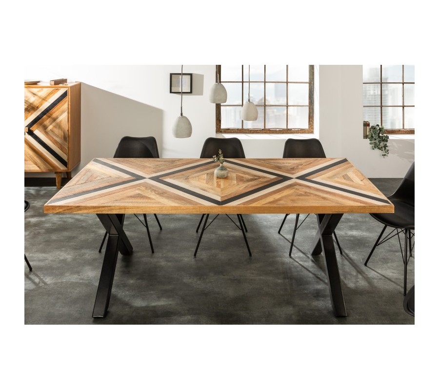 Dizajnový jedálenský stôl Frida Blanca je štýlovým doplnkom každého industriálne či alternatívne ladeného interiéru. Zaujme predovšetkým svojím zaujímavým geometrickým zdobením, ktoré je tvorené rôznymi odtieňmi dreva v tvare písmena x. Prírodná hnedá farba masívneho mangového dreva kontrastuje s mohutnými čiernymi kovovými nnohami. Jedálenský stôl Frida Blanca krásne vynikne v moderne i alternatívne ladených priestoroch a dá sa vhodne doplniť stoličkami s koženým poťahom. Stôl je vhodný pre pohodlné usadenie 6 až 8 ľudí.
