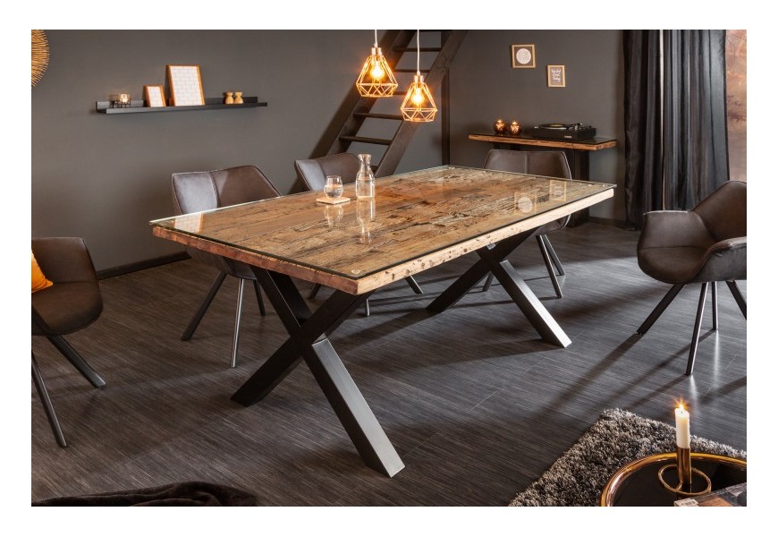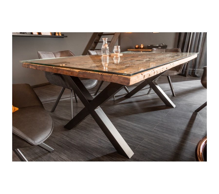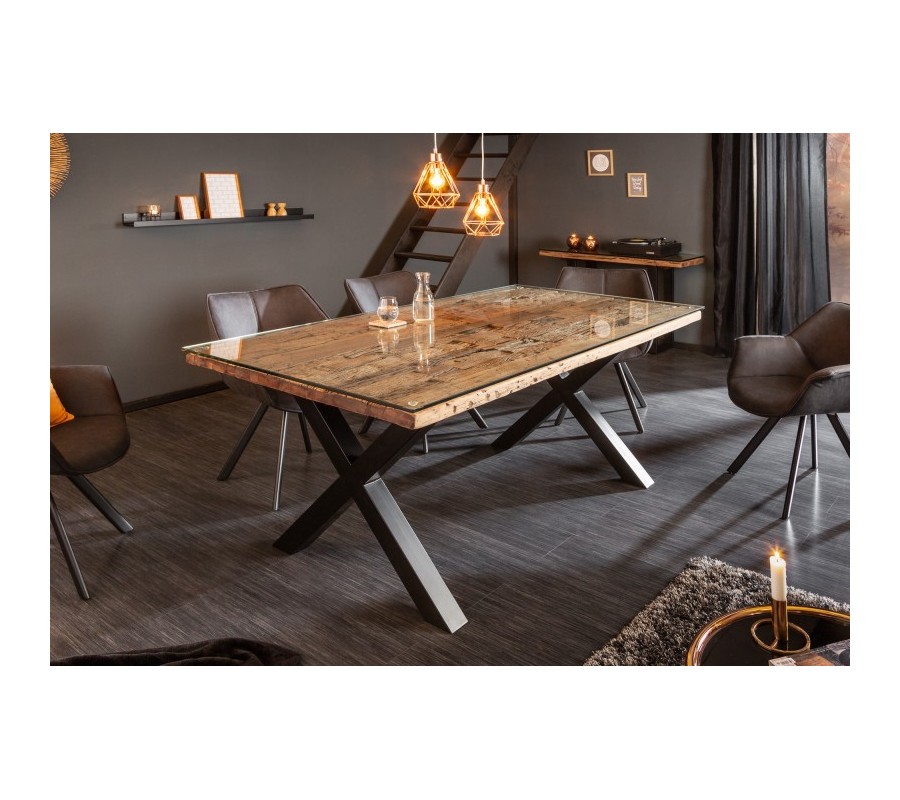 Štýlový jedálenský stôl Barracuda sa vyznačuje svojím hrubo opracovaným povrchom z recyklovaného masívneho dreva. Prírodný materiál kontrastuje s mohutnými prekríženými čiernymi kovovými nohami, ktoré dotvárajú celkový industriálny vzhľad stola. Naturálna hnedá farba povrchovej dosky vnesie do vášho príbytku nádych domova a vďaka ručnej výrobe bude váš kúsok naozaj jedinečným. Povrchová doska je chránená bezpečnostným sklom. Odporúčame stôl Barracuda a doladiť o moderne, vidiecky či industriálne ladených jedální. Je ideálnym pre stolovanie 6-8 ľudí.