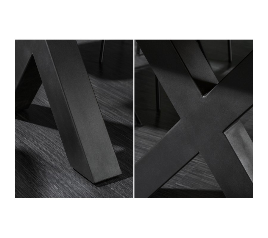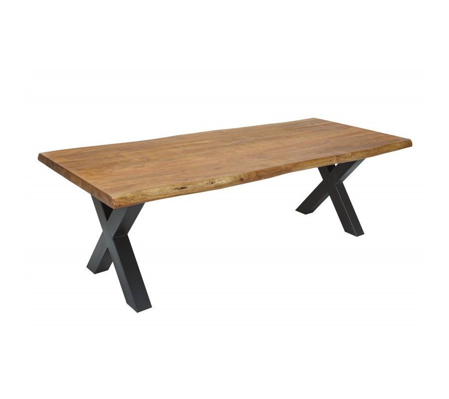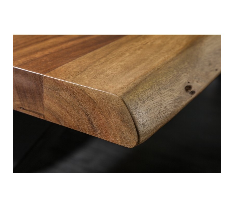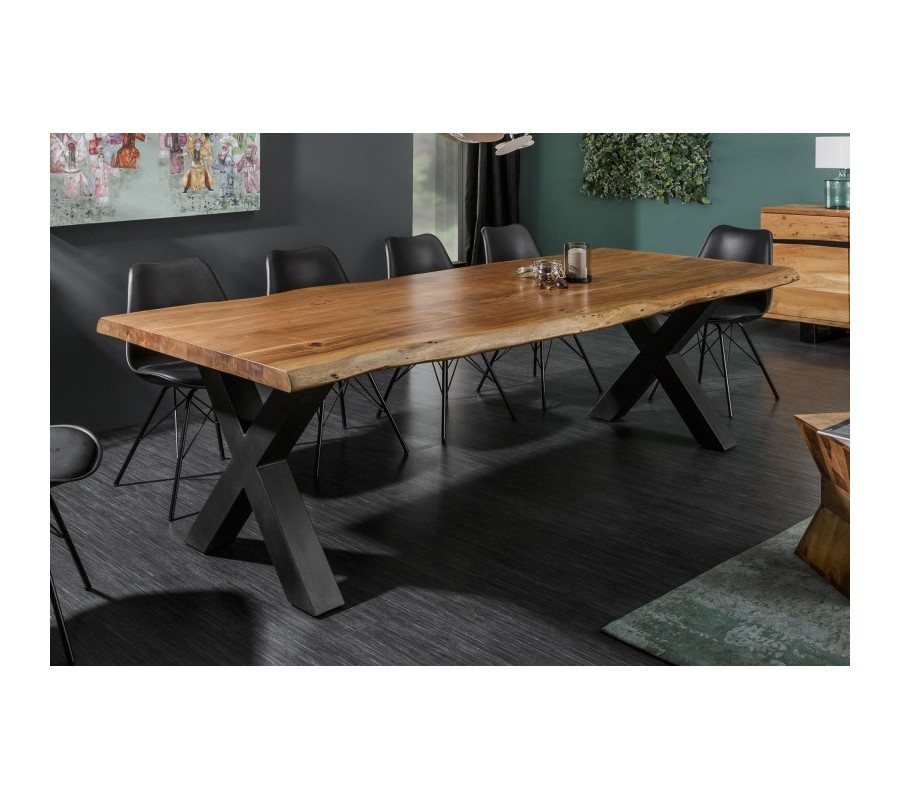 Luxusný jedálenský stôl z našej kolekcie nábytku Mammut je štýlovým kúskom, ktorý vynikne najmä v industriálne alebo moderne ladených interiéroch. Povrchová doska je vyrobená z kvalitného masívneho akáciového dreva s prirodzenou povrchovou úpravou, ktorá u vás doma navodí naturálny dojem. Na doske taktiež možno vidieť zaujímavú kresbu dreva, a prírodný dojem umocňuje aj organický tvar hrán stola. Naturálnej doske kontrastujú kovové nohy v čiernej farbe v tvare x, ktoré stolu dodávajú industriálny nádych. Jedálenský stôl Mammut skvelo poslúži v moderných jedálňach pri stolovaní v kombinácii s tmavými farbami a masívnym nábytkom. Stôl je ideálny pre stolovanie 10 ľudí.