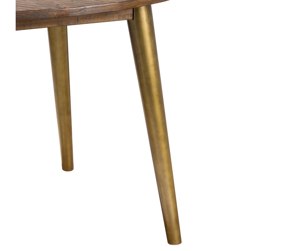 Exkluzívny kruhový jedálenský stôl z našej kolekcie nábytku Havana Oro je ručne vyrábaným kúskom, ktorý je typický svojím štýlovým parketovým vzorom v kombinácii s antickou zlatou farbou, čo stolu dodáva jemný rustikálny nádych. Stôl zaujme predovšetkým milovníkov retro či art-deco štýlu, ktorí si túžia svoj interiér obohatiť o výnimočný a dominantný kúsok. Masívne drevo v prírodnej hnedej farbe je doplnené naturálnymi ornamentami,. Hrubé rezané borovicové dosky použité na vytvorenie povrchu mu dodávajú jedinečnú textúru a osobitosť. K stolu sa komfortne usadia štyri osoby. Celkový dojem dotvárajú šikmé zlaté nohy typické pre retro štýl, ktoré vašej miestnosti dodajú moderný a sofistikovaný dojem. Stôl Havana Oro krásne vynikne v svetlých priestoroch priestranných jedální, obývačiek či kuchýň v kombinácii s ďalším masívnym nábytkom a doplnkami v zlatej farbe.