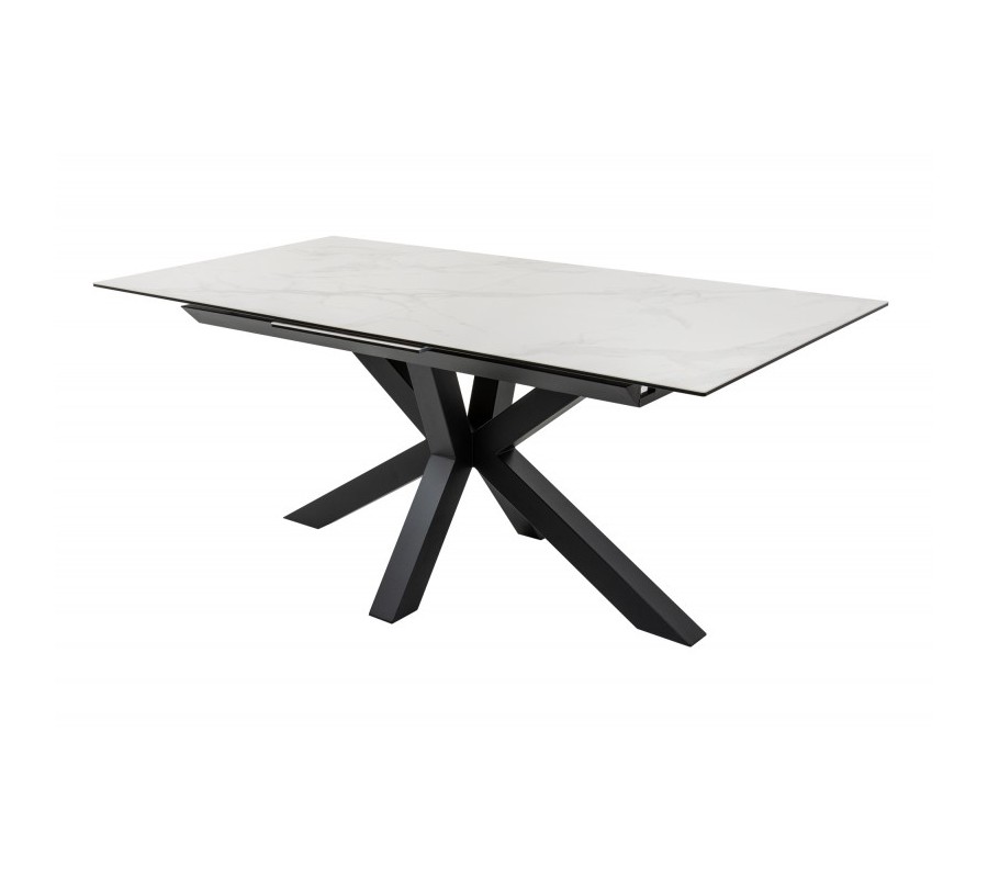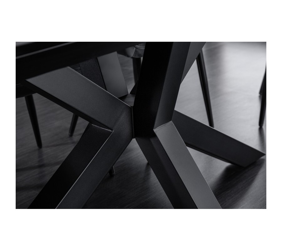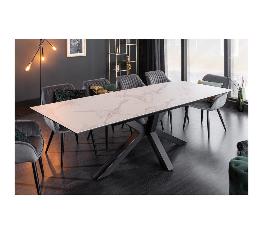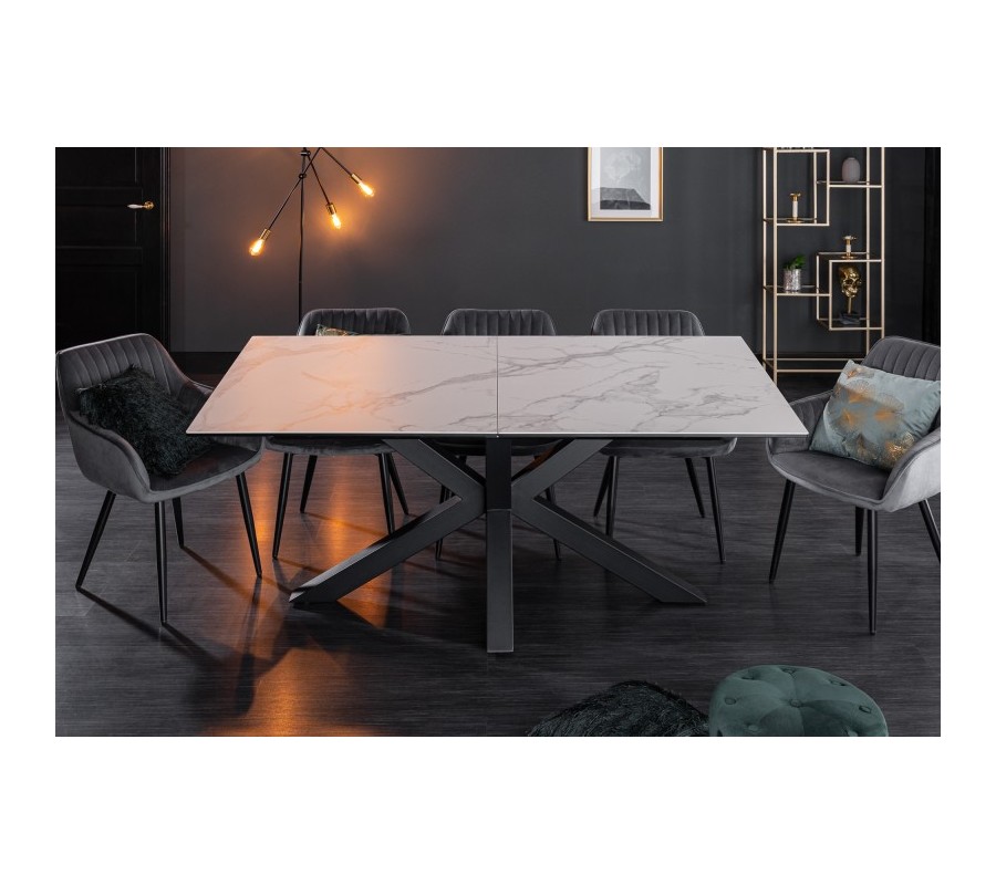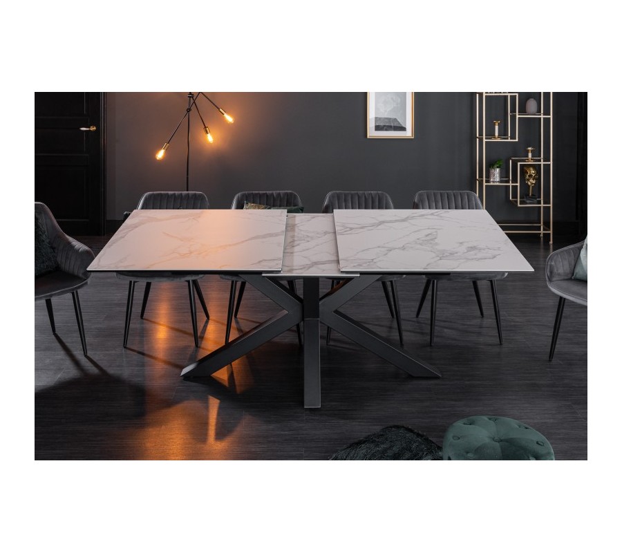 Štýlový jedálenský stôl Calandra Marmol je špecifický svojím originálnym čiernym kovovým základom, ktorý vytvára zaujímavý a nevšedný tvar pod strednou časťou vrchnej dosky v podobe hviezdice, čo dodáva stolu jedinečný priemyselný vzhľad. Vrchná doska je špeciálna nielen svojou povrchovou úpravou, vďaka ktorej nadobúda prirodzený mramorový vzhľad, ktorý sa dá jednoducho kombinovať do moderných, retro alebo industriálnych interiérov, ale taktiež aj možnosťou vysunutia a predĺženia samotnej dosky do dĺžky 225cm, za ktorou sa dokáže pohodlne usadiť 6-8 ľudí. Vynikajúco vynikne v kombinácií s retro zamatovými stoličkami, a taktiež sa dá kombinovať do svetlých aj tmavých interiérov.