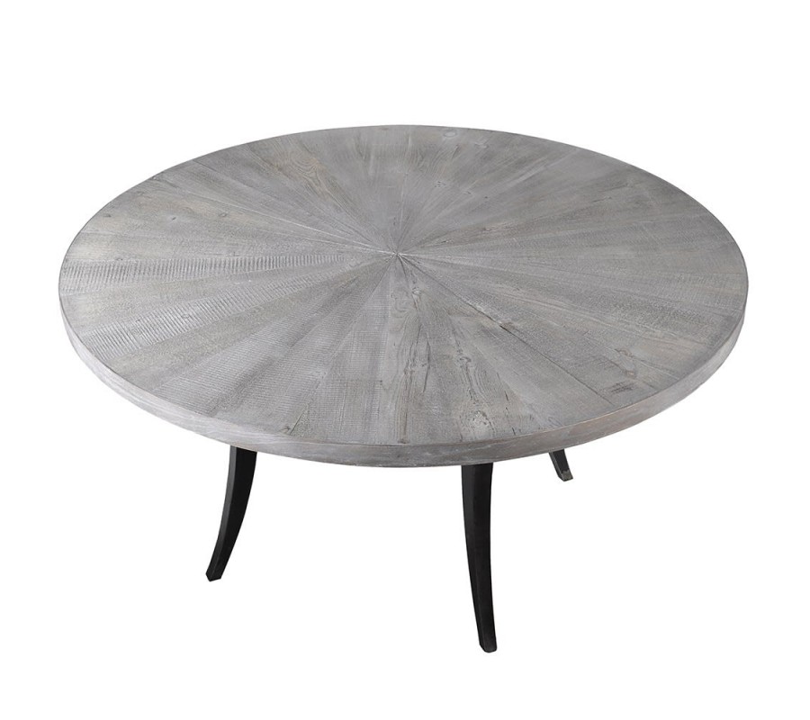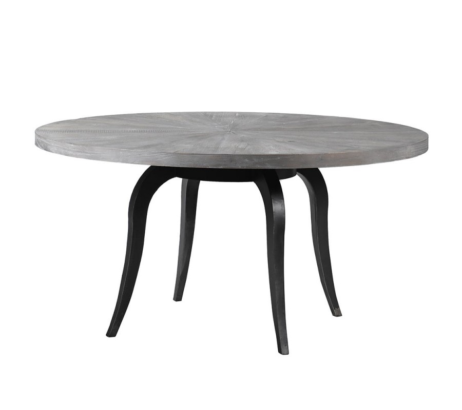 Luxusný okrúhly jedálenský stôl vo vintage štýle Vás osloví svojim jedinečným dizajnom, vkusnými a jemnými líniami. Zaujímavé sú pre oči čierne kovové nohy s oblúkovým tvarom, ktoré dodávajú nábytku jemný historický nádych. Povrchová doska jedálenského stola má jednoduchý dizajn a je vyrobená z masívneho dreva. Povrchová úprava v sivej farbe nechá vyniknúť štruktúru dreva a miestami sa vyobrazia aj letokruhy, ktoré oživia povrchovú dosku jedálenského stola. Vďaka svojej dizajnovej kombinácii bude pôsobiť v miestnosti dominantne a kvôli neutrálnej farebnosti sa bude hodiť do kuchyne, či jedálne s výbavami, ktoré majú sýtu, alebo pastelovú farebnosť. Jedálenský stôl odporúčame taktiež kombinovať so stoličkami s čiernymi, alebo sivými nohami.
