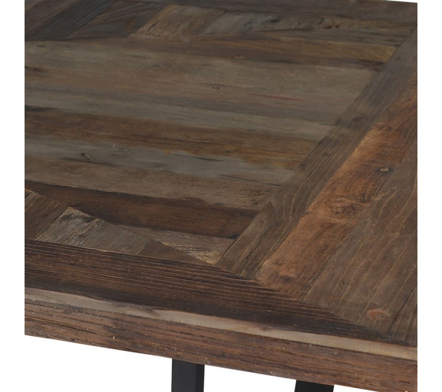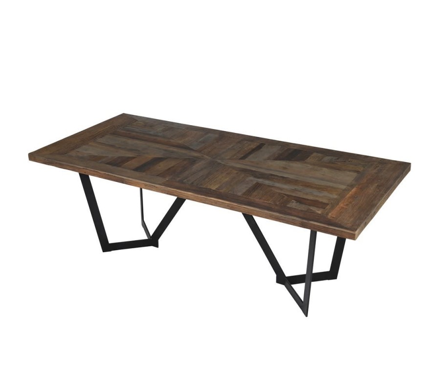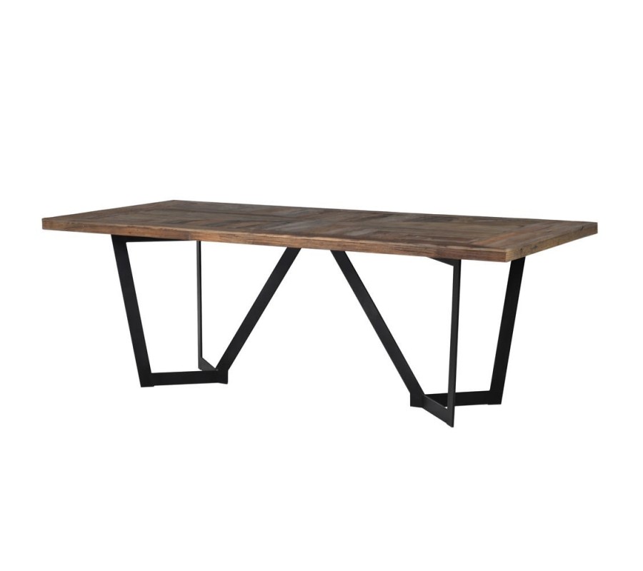 Industriálny jedálenský stôl má obdĺžnikový tvar, skladá sa z drevenej povrchovej dosky a z atypických kovových čiernych nôh. Povrchová doska stola je vyrobená z masívneho brestového dreva. Na jej povrchu je viditelná štruktúra tmavších drevených dosiek, ktoré vytvárajú trojuholníkové vzorce. Čierne kovové nohy industriálneho jedálenského stola sú atypické kvôli dizajnérskemu návrhu nôh, ktoré majú geometrický nepravidelný tvar. Rozmer stola je dostatočný pre pohodlné stolovanie osem osôb. Jedálenský stôl sa hodí do moderne a industriálne zariadených priestorov, ktoré sú zariadené doplnkami a nábytkami v neutrálnych, alebo kontrastných farbách. Odporúčame stôl kombinovať so stoličkami s pohodlným čalúnením v ktorých sa objavujú čierne kovové prvky, alebo prvky z brestového dreva. Jedálenský stôl určite zaujme každého už pri prvom pohľade svojim jedinečným dizajnom.
