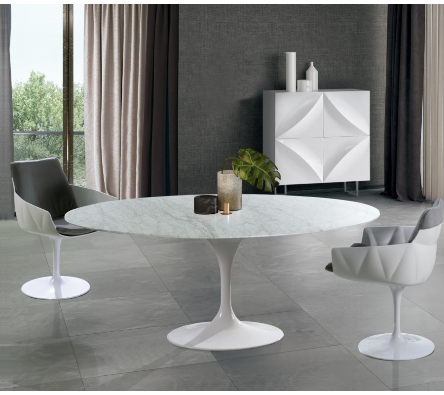 Mramorový jedálenský stôl Henning Marble v oválnom tvare je kúsok, ktorý zaručene podčiarkne prepychový nádych vo vašej moderne ladenej luxusnej domácnosti vďaka svojmu jedinečnému dizajnovému prevedeniu. Spomenuté prevedenie nájdete na veľkej, mramorovej vrchnej doske, ktorá na seba zaručene upúta pozornosť a stane sa dominantným kúskom vo vašej jedálni, a taktiež zaručí moderný a nadčasový vzhľad. Mramorová vrchná doska jedálenského stola Henning Marble je posadená do lesklej bielej podstavy v tvare pripomínajúceho stopku vínového pohára s plochým základom, čo zaručí stabilné stolovanie a vďaka svojím rozmerom 200x120cm sa za stolom pohodlne usadí šest až osem stravníkov. Vďaka svojmu exkluzívnemu vzhľadu a prevedeniu odporúčame luxusný jedálenský stôl Henning Marble kombinovať s lesklým bielym nábytkom a stoličkami vo svetlo ladených jedálňach.