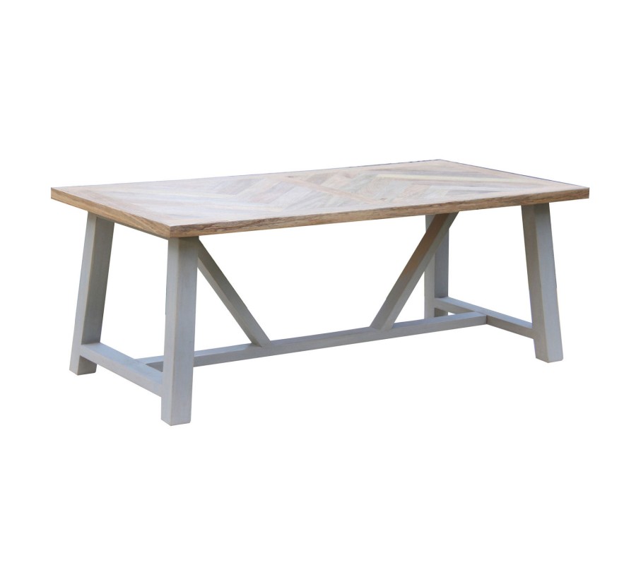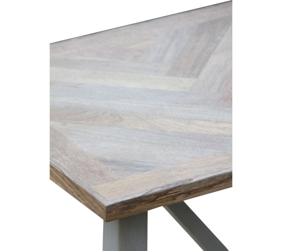 Štýlový jedálenský stôl z kolekcie industriálneho nábytku Nyakim je zaujímavý svojím prevedením v podobe svetlo sivých nožičiek, ktoré pripomínajú kov, a taktiež aj podstavou v tvare písmena V. Spomenutý drevený základ jedálenského stola Nyakim je taktiež obohatený o dizajnový prvok v podobe povrchovej úpravy nožičiek pripomínajúcej prirodzené opotrebovanie dreva, čo dodáva jemný nádych vintage štýlu. Vrchná doska stola Nyakim zo svetlo hnedého masívu je vyzdobená parketovým vzorom vytvoreným z viacerých dosiek čo dodáva industriálny dojem a vďaka jeho rozmerom sa za stôl zmestia šiesti členovia domácnosti. Odporúčame kombinovať do škandinávskych alebo svetlých industriálnych interiérov.