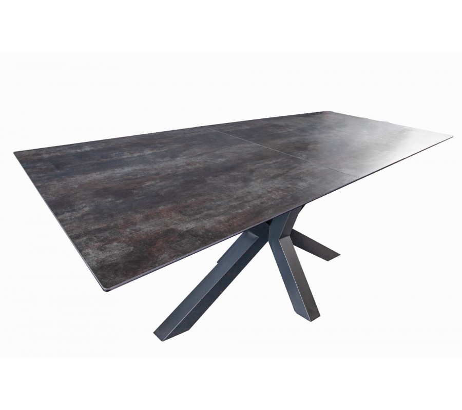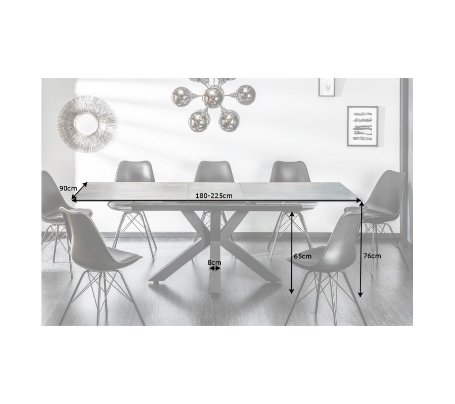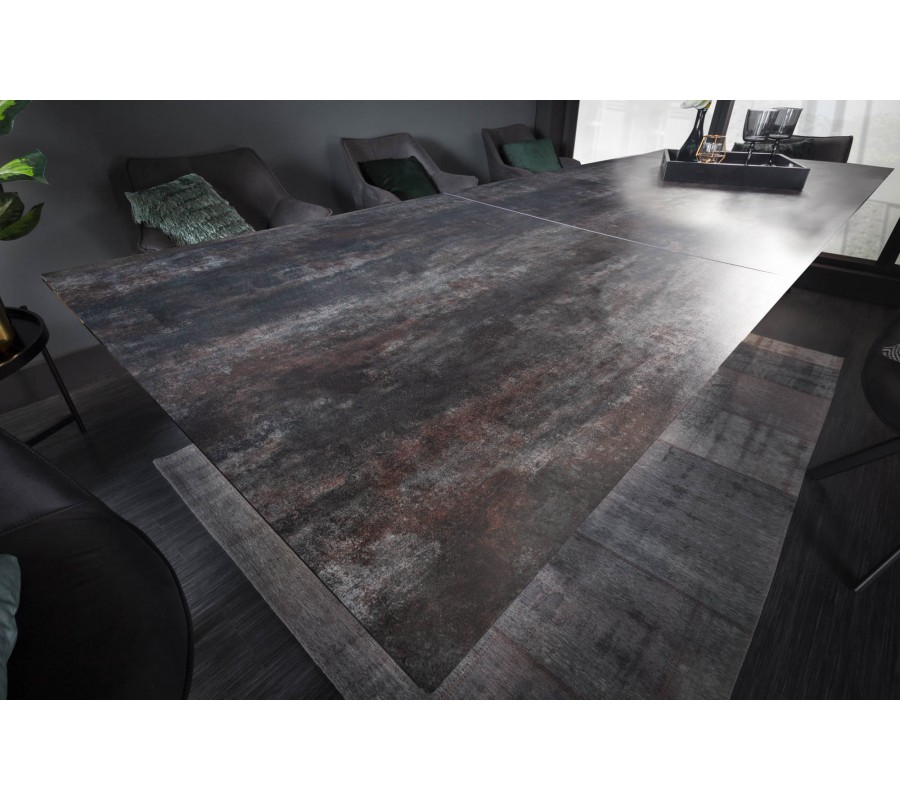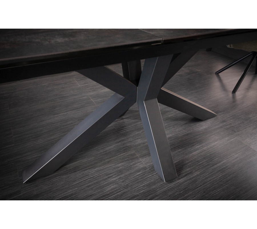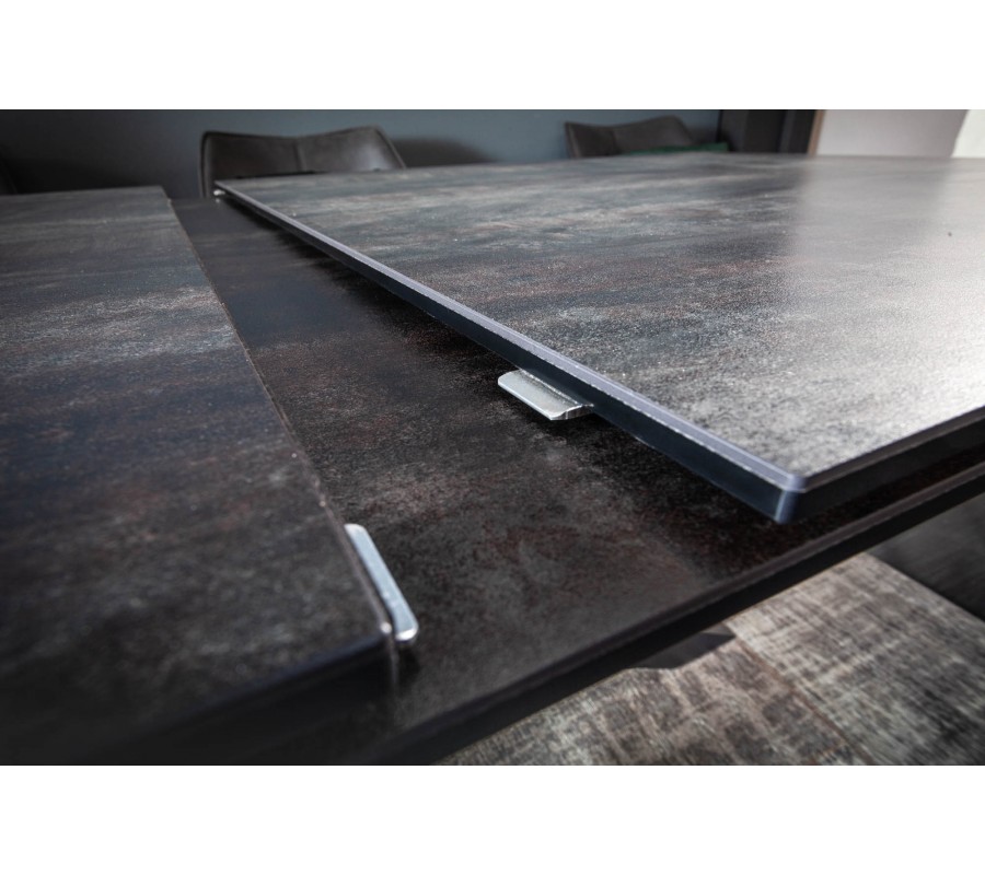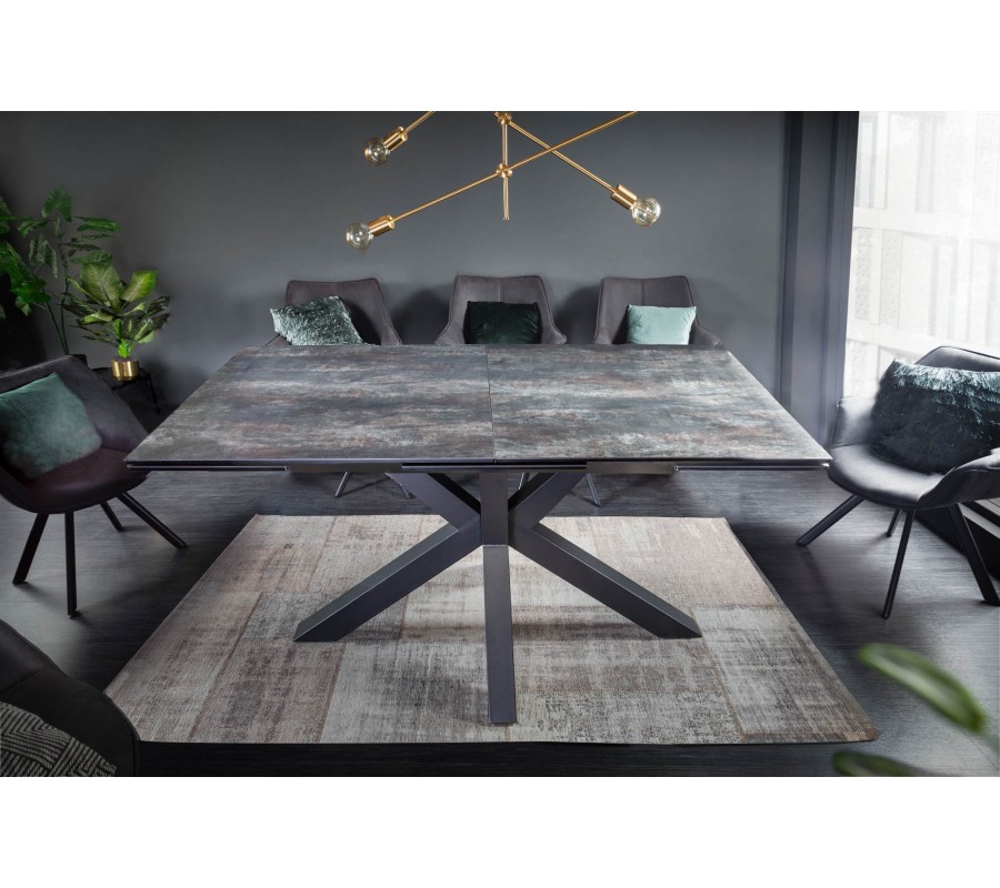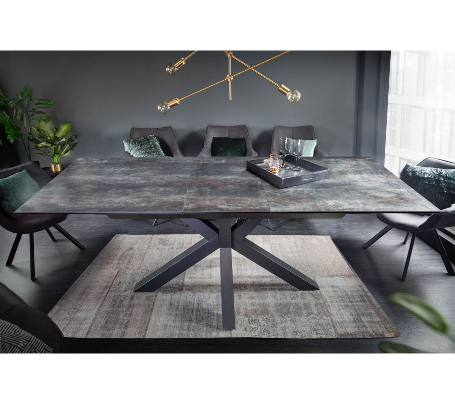 Nadčasový industriálny jedálenský stôl Infinidad príjemne obohatí vašu kuchyňu či jedáleň o nádych industrializmu a poskytne priestor pre vychutnanie jedla a kvalitných spoločných chvíl pri roztiahnutí stola až desiatim ľuďom. Hroná doska jedálenského stola je vyrobená z troch plátov, čo dáva možnosť stôl rozťahovať a zväčšíť tak jeho úžitkovú plochu. Povrchová doska Infinidad je vyrobená z keramiky s abstraktnou kresbou popolovej a olovenej sivej farby a na jej povrchu sa nachádza sklenené ochranná vrstva. Jedálenský stôl Infinidad disponuje centrálnou opornou nohou, ktorá sa rozvetvuje na štyri smery a vytvára tak ilúziu bežnej podpornej nohy stola. Noha stola je tvorená kovom s povrchovou úpravou metalickej čiernej farby, umiestnenie nôh poskytuje miesto pre zasunutie stoličiek pod jedálenský stôl i priestor nohám stolujucich. Stôl Infinidad odporúčame zasadiť do dizajnových kuchýň a jedální s prevažujúcou tmavšou farebnosťou a kombinovať ho so zamatovými jedálenskými stoličkami či vankúšmi na nich.