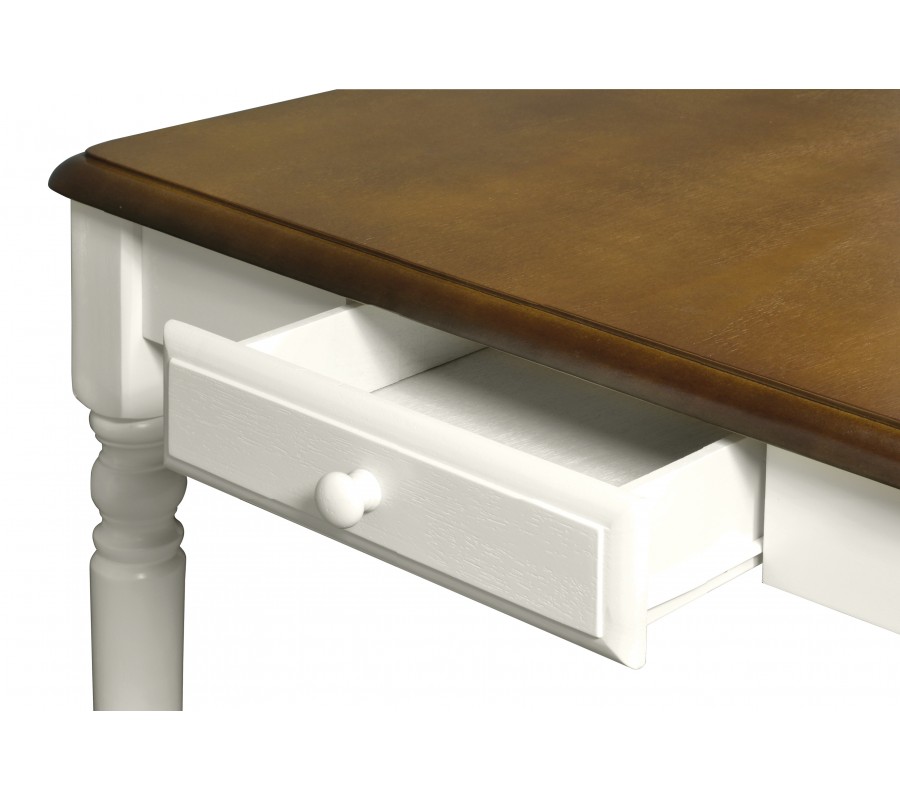 Jedinečný jedálenský stôl Felicita je kúskom, ktorý v sebe prepája jednoduchosť čistých geometrických línií a eleganciu klasického nábytku. Nesie sa v nezameniteľnom provensálskom štýle, ktorý je dosiahnutý najmä kvalitným masívnym materiálom a farebnou kombináciou prírodnej hnedej a krémovej bielej farby, ktorá spríjemní priestor každej jedálne či kuchyne. Povrchovú úpravu hnedej dosky zdobí nádherná kresba dreva a biele nožičky zasa jemné ručné vyrezávanie. Dokonalý provensálsky efekt dosiahnete kombináciou s ďalšími kúskami z kolekcie Felicita, prípadne iným masívnym nábytkom v jemných prírodných odtieňoch s dôrazom na bielu farbu.