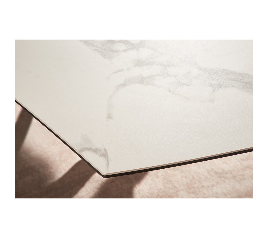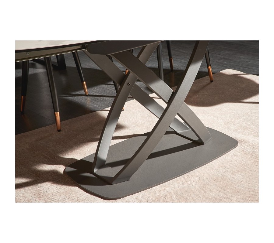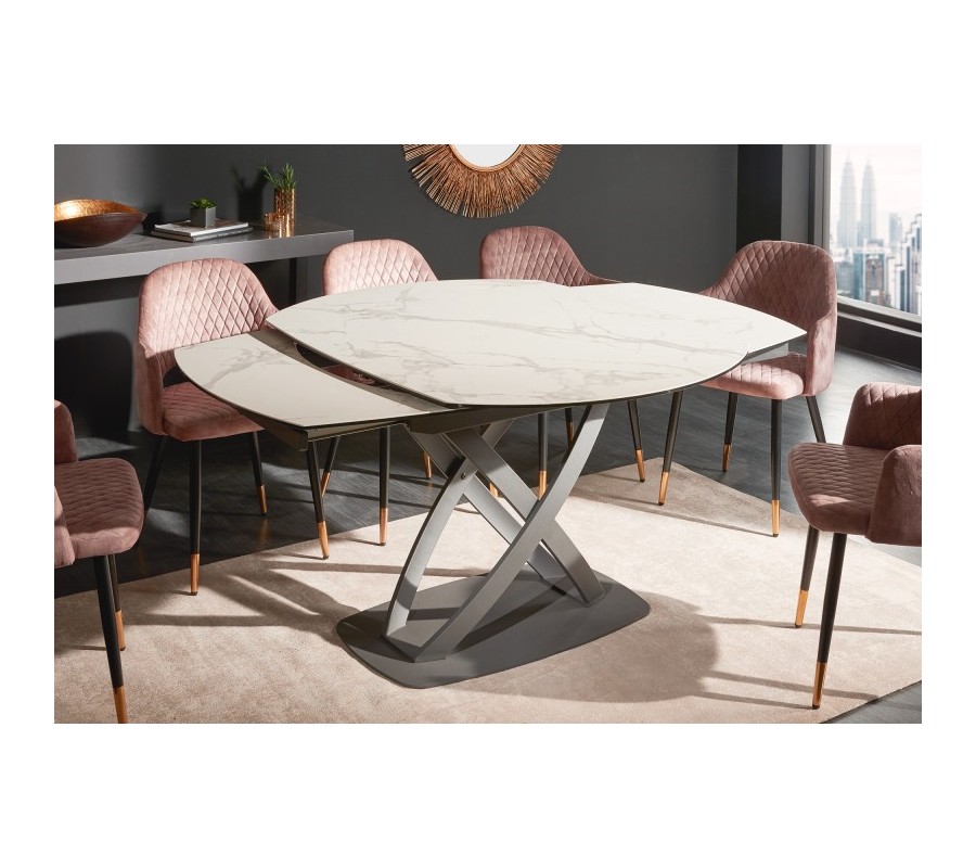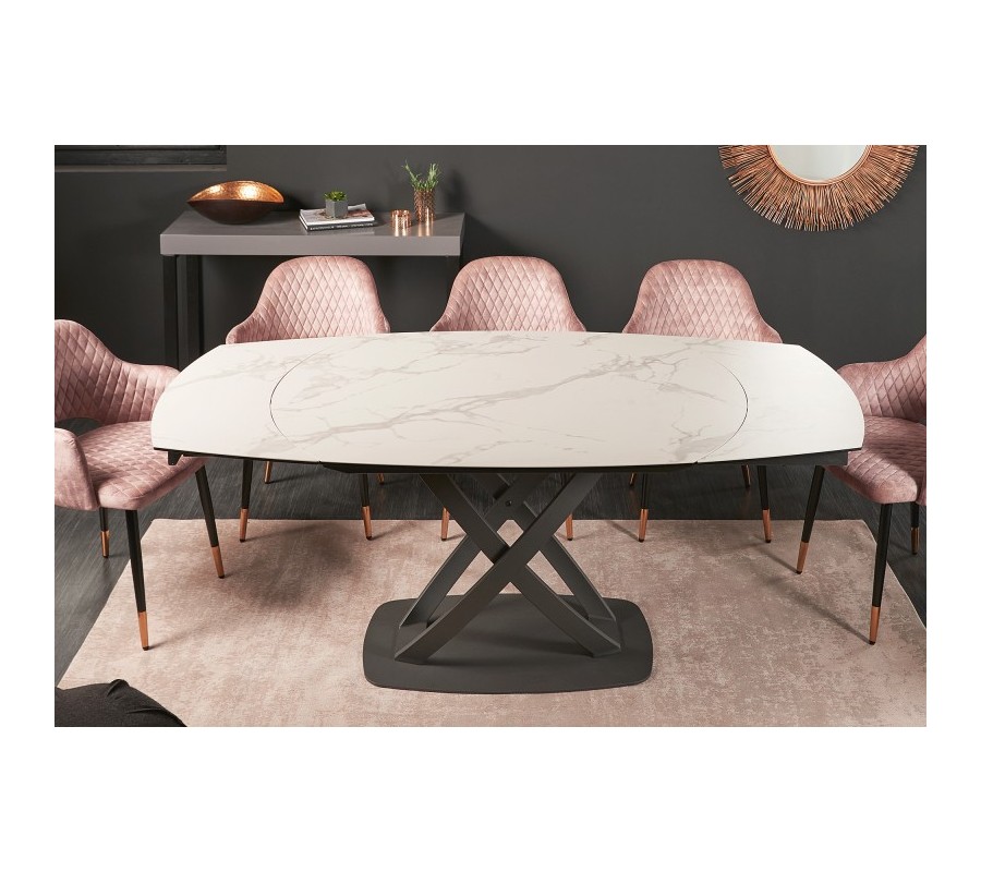 Jedálenský stôl Lutz vás môže očariť svojím nadčasovým dizajnom, ktorý kombinuje moderný vzhľad s nádychom štýlu art-deco. Vrchná doska jedálenského stola vynikne nielen svojím oválnym tvarom, či rozkladacím mechanizmom, ale najmä svojím dizajnom, ktorý disponuje moderným mramorovým vzhľadom. Vrchnú dosku chránenú bezpečnostným temperovaným sklom držia nožičky v podstave v tvare písmena X, vďaka čomu tento elegantný kúsok naberá na svojej výnimočnosti. Čierne kovové prevedenie podstavy jedálenského stola Lutz vytvára nádych industriálneho štýlu, vďaka čomu sa tento dizajnový kúsok nestratí ani v moderných industriálnych jedálňach. Vďaka rozmeru dosky 190cm sa za jedálenským stolom Lutz pohodlne usadí až šesť stravníkov. Dizajn jedálenského stola Lutz vynikne v moderných jedálňach s bielym nábytkom a stoličkami, pričom celkový vzhľad stola môže byť taktiež kombinovaný aj so stoličkami v štýle art-deco, pri ktorých sa ľahko kombinuje čierna podstava stola a vyniká biela vrchná doska s mramorovým vzhľadom.