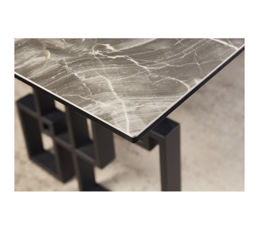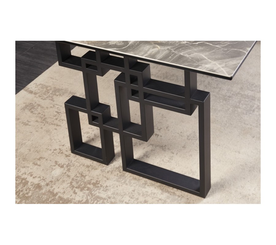 Jedálenský stôl Ariana v obdĺžnikovom tvare disponuje nezameniteľným dizajnom, ktorý sa stane stredobodom pozornosti vo vašej jedálni. Vrchná doska jedálenského stola chránená bezpečnostným temperovaným sklom vás môže očariť svojím dizajnom s mramorovým vzhľadom, ktorý je unikátne doplnený čiernou antracitovou podstavou z kovu. Samotná podstava je veľmi atypická vďaka svojmu dizajnu. Po bokoch podstavy sú nožičky formované do piatich symetrických štvorcov, ktoré sa vzájomne prepájajú. Dôraz na geometrické tvary a ich presnosť, najmä pri podstave jedálenského stola Ariana je priam ukážkovým príkladom štýlu art-deco. Vďaka rozmeru vrchnej dosky 200 cm sa za jedálenským stolom Ariana pohodlne usadí šesť až osem stravníkov. Jedálenský stôl Ariana odporúčame kombinovať v art-deco štýlových jedálňach v kombinácií so svetlo čalúnenými stoličkami s čiernymi nožičkami, a taktiež s nábytkom s čiernymi prvkami.