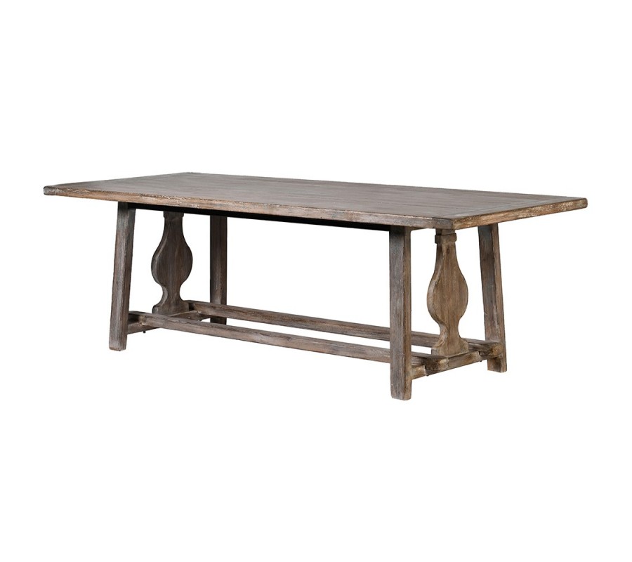 Masívny jedálenský stôl Merlin v tvare obdĺžniku vo vidieckom štýle predstavuje základný kameň funkčnosti a unikátneho dizajnu opotrebovaného masívneho nábytku typického pre sedliacke obydlia. Unikátna povrchová úprava drevenej konštrukcie v studenej hnedej farbe s nádychom tmavej tyrkysovej a bielej necháva vyniknúť dekor v podobe vretenovito vyrezávaných podpier po oboch stranách stola postaveného na štyroch mierne šikmých nohách. Okrem šikovného dizajnérskeho riešenia priečneho prepojenia nožičiek vám spoj poskytne dokonalú stabilitu a pevnosť jedálenského stola Merlin. Za vidieckym stolom si budete môcť vychutnávať spoločné večere so svojimi najbližšími aj v šestici. Zažiari v spoločnosti vidieckych a provensálskych jedálenských stoličiek s podobným dekorom operadla v tmavej hnedej alebo off white bielej farbe. Jeho atmosféra vás pohltí a vaša vidiecka jedáleň či kuchyňa vám určite poďakuje za kvalitný a masívny stôl so štedrými rozmermi, kde poholdne usadíte 8-10 osôb.