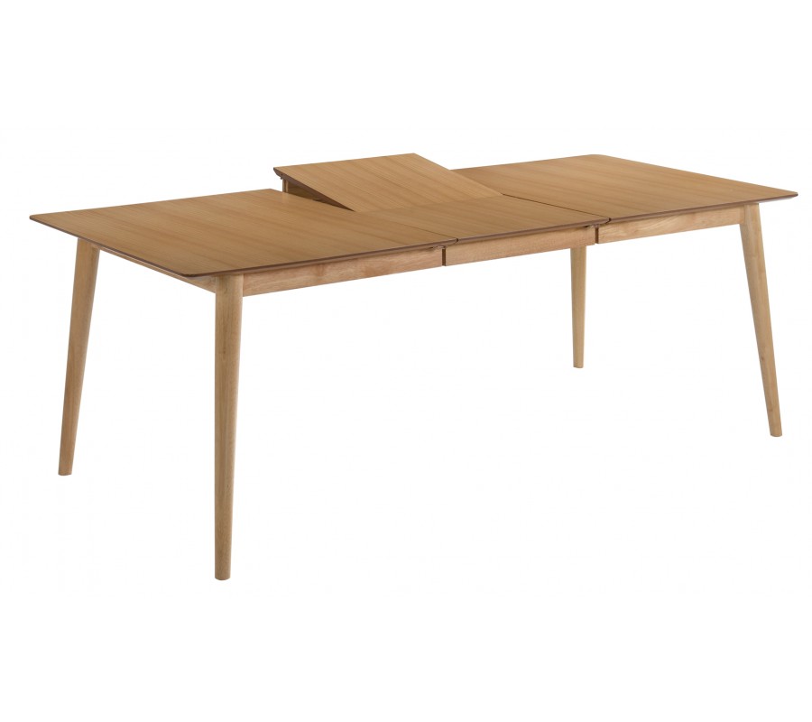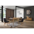 Jedálenský stôl z kolekcie nábytku v modernom štýle Nordica Clara sa pýši minimalistickým dizajnom, ktorý vás zaujme svojím kvalitným a praktickým prevedením. Škandinávsky jedálenský stôl Nordica Clara je vyrábaný z dreva svetlo hnedej farby, obohatenom o dyhovanie z dubového dreva. Vrchná doska stola Nordica Clara sa nesie v obdĺžnikovom tvare, pričom spomenutá dubová dyha vytvára na povrchu modernú kresbu dreva v priamych líniách. Povrchovo upravená vrchná doska disponuje rozkladacím mechanizmom s odnímatelným stredom, vďaka ktorému si môžete jedálenský stôl upraviť podľa potrieb na šírku 150 až 200cm, čo zaručí pohodlné stolovanie pre šesť až osem ľudí. V neposlednom rade sa pýši jedálenský stôl Nordica Clara štyrmi pevnými masívnymi nožičkami z dubového dreva, ktoré sú jemne šikmo tvarované. Svetlo hnedá farba jedálenského stola Nordica Clara sa veľmi ľahko kombinuje v moderných a škandinávskych jedálňach, v kombinácií so svetlo alebo sivo čalúnenými stoličkami, s nábytkom s čiernymi kovovými prvkami, a taktiež najmä s bielymi dekoráciami