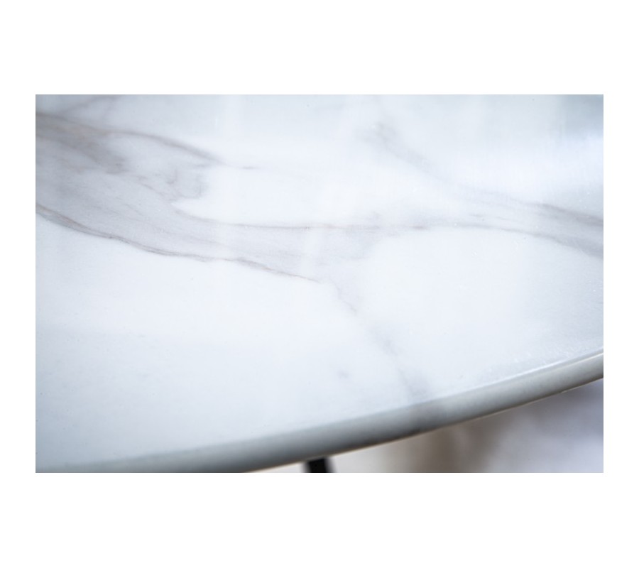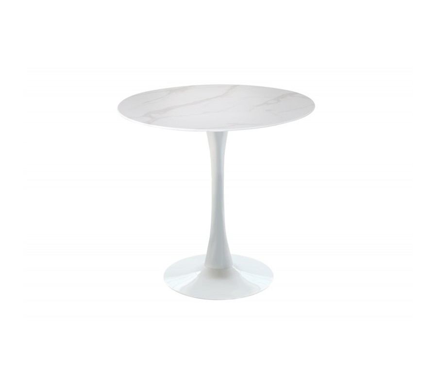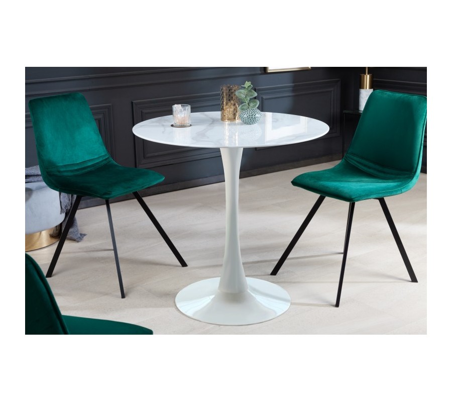 Moderný okrúhly jedálenský stôl Velma v bielej farbe s mramorovou povrchovou doskou a kovovou podstavou 80cm