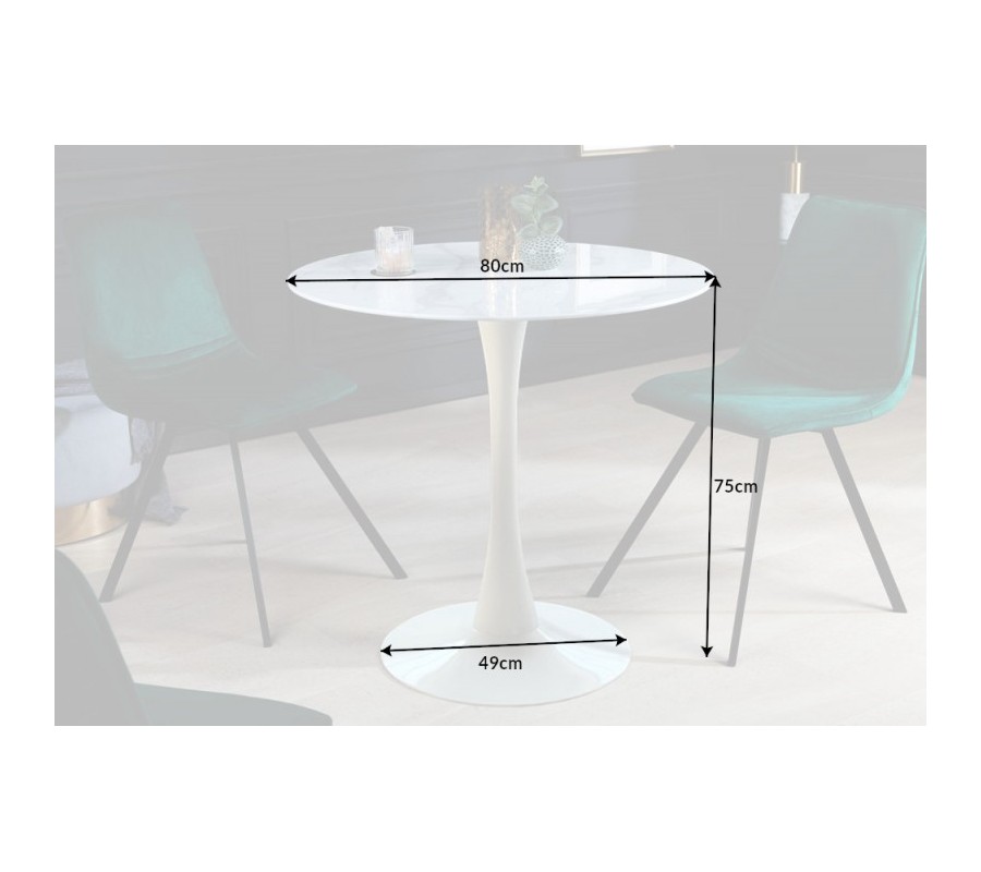 Exkluzívny jedálenský stôl Velma predstavuje elegantný kúsok vhodný na zariadenie každej modernej či art deco ladenej jedálne, kuchyne alebo obývačky. Zaujme vás svojím elegantným kruhovým tvarom a povrchovou doskou z kvalitného tvrdeného skla s elegantným mramorovým efektom. Doska sa nesie v bielej farbe so štruktúrou v sivých odtieňoch, k čomu príjemne ladí aj biela kovová podstava. Krásnu kombináciu vytvoríte napríklad doplnením jedálenských stoličiek s výrazným zamatovým čalúnením alebo ďalším jedálenských nábytkom z kovu či skla. Univerzálna farebnosť robí stôl Velma výborne kombinovateľným kúskom, ktorý zažiari v monochromaticky ladených, ale aj pestrejších interiéroch. Ideálne doplní najmä väčšie a priestrannejšie miestnosti, kde môže vyniknúť. Pre dokonalý elegantný efekt odporúčame miestnoť doladiť s doplnkami vo výrazných farbách, napríklad v zlatej, tmavozelenej či tmavomodrej. Jedálenský stôl Velma je ideálny pre stolovanie 2-3 ľudí.
