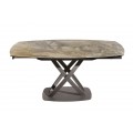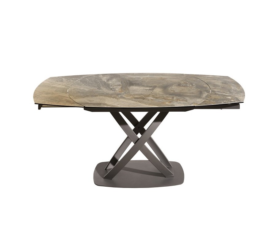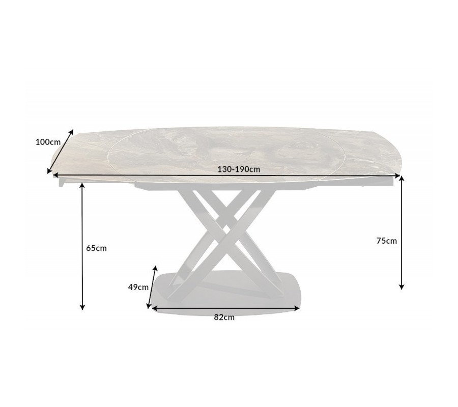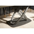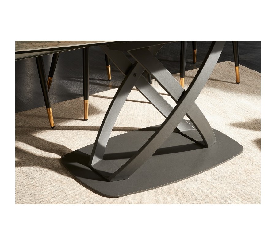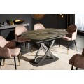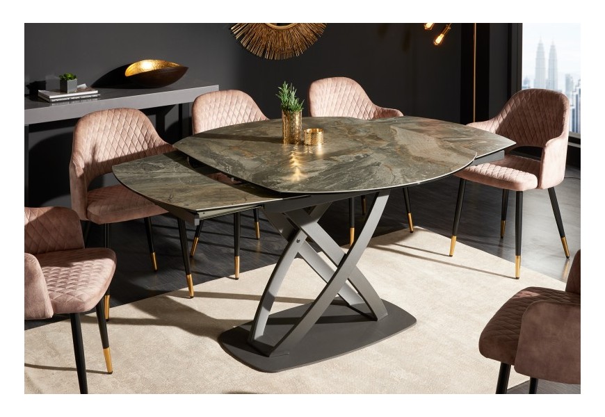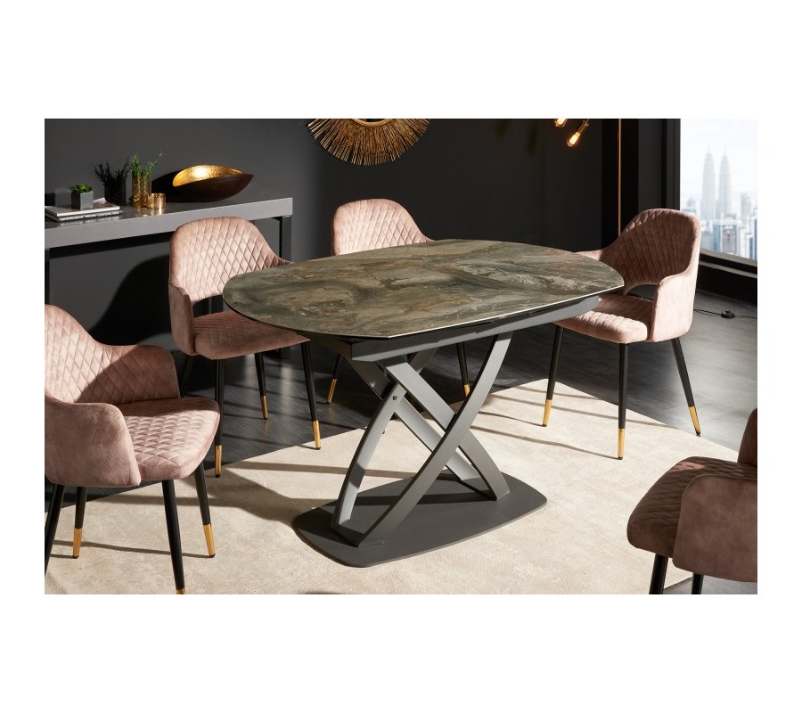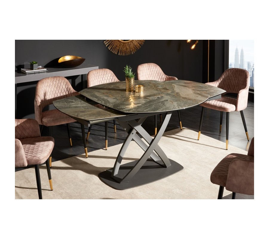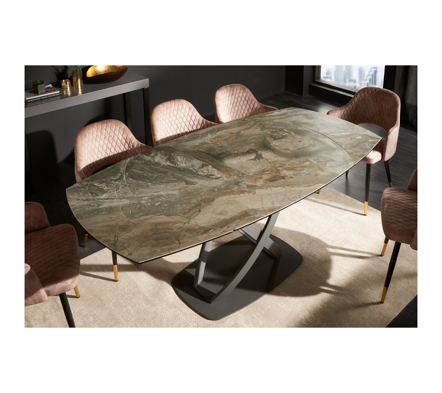 Na prvý pohľad vás zaujme unikátna konštrukcia moderného jedálenského stola Lutz II, ktorý prichádza okrem stabilných prekrížených dvojitých nožičiek v čiernom matnom dizajne aj s ďalším štýlovým prvkom. Vrchná keramická doska oválneho tvaru imituje mramorovú kresbu v krásnej tmavej sivej farbe doplnená olivovo zelenou. Jedálenský stôl dokonale vystihuje modernú praktickosť a funkčnosť nábytku. Vrchnú dosku je možné vysúvať a zasúvať pomocou otočného mechanizmu, ktorý umožňuje rozkladať stôl z pôvodných 130cm na 190cm, a tak si prispôsobiť šírku stola Lutz II presne podľa vašich aktuálnych potrieb. Stôl v modernom dizajne sa bude výnimočne hodiť do svetlých a priestanných interiérov ako napríklad do jedální s veľkými francúzskymi oknami zabezpečujúcimi výbornú sveteľnosť. Jedálenský stôl sa stane dominantou vašej jedálne a jeho dizajnový potenciál je vhodné rozvinúť svetlými nude béžovými jedálenskými stoličkami čalúnenými či už zamatom alebo kožou.