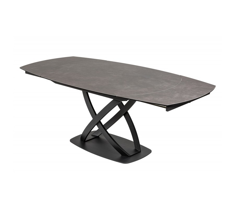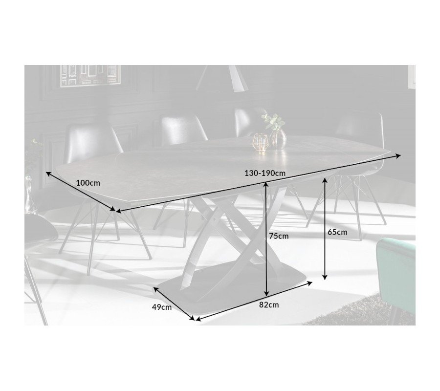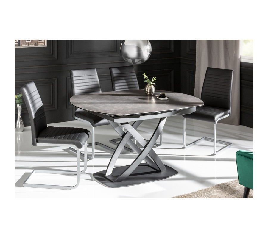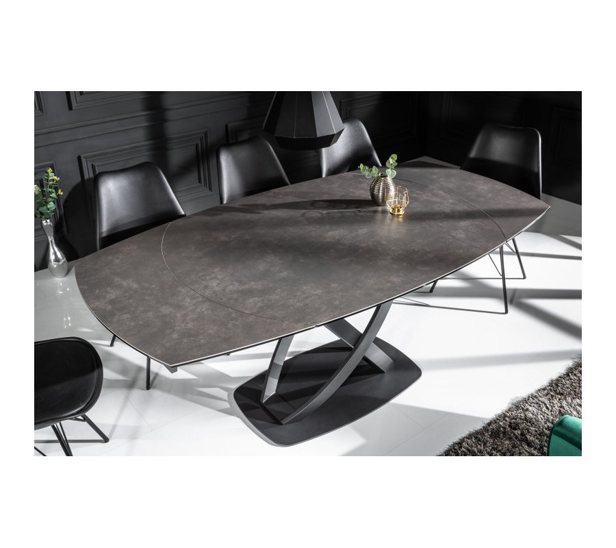 Dizajnový kúsok v podobe moderného jedálenského stola v krásnych elegantných tmavých odtieňoch sivej a čiernej vám poskytne ideálny základný kameň pre zariadenie vašej jedálne v modernom či industriálnom štýle. Konštrukcia stola Lutz je vyrobená z kovu s čiernou matnou povrchovou úpravou a jej originálne vyhotovenie v podobe prekrížených dvojitých nožičiek na podstavci dodáva nenapodobiteľný nádych funkčnosti, noblesy a v neposlednom rade zabezpečuje stolu dokonalú stabilitu a pevnosť. Jedálenský stôl má vsadenú oválnu keramickú vrchnú dosku do kovovej konštrukcie, navyše je vrchná doska obohatená o otočný mechanizmus, ktorý umožňuje stolu rozloženie z pôvodných 130cm až na 190cm, kde pohodlne usadíte aj mnohočlennú rodinu či priateľov. Moderný jedálenský stôl Lutz sa bude vymínať v jedálňach ladených do neutrálnych sivých tónov či k žiarivo bielym jedálenským stoličkám či príborníkom v modernom štýle. Rovnako sa nestratí ani v kombinácii s industriálnym čiernym zariadením v podobe vysokého regálu, komody či závesného svietidla.