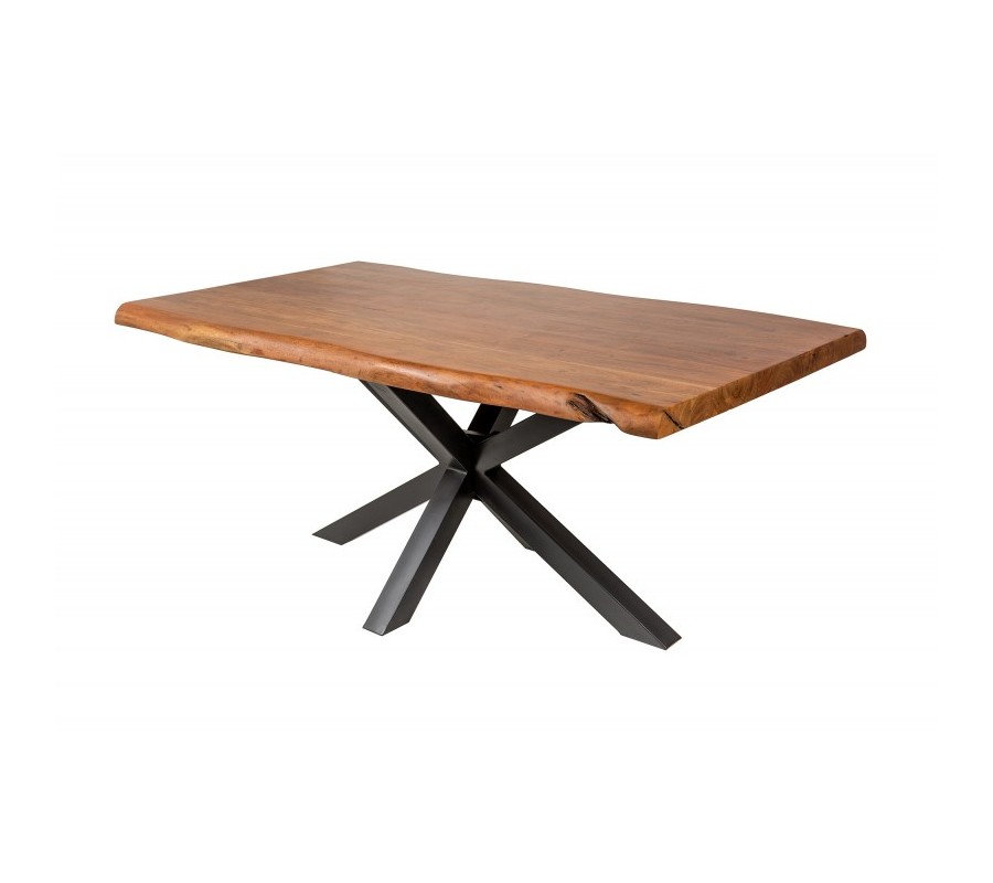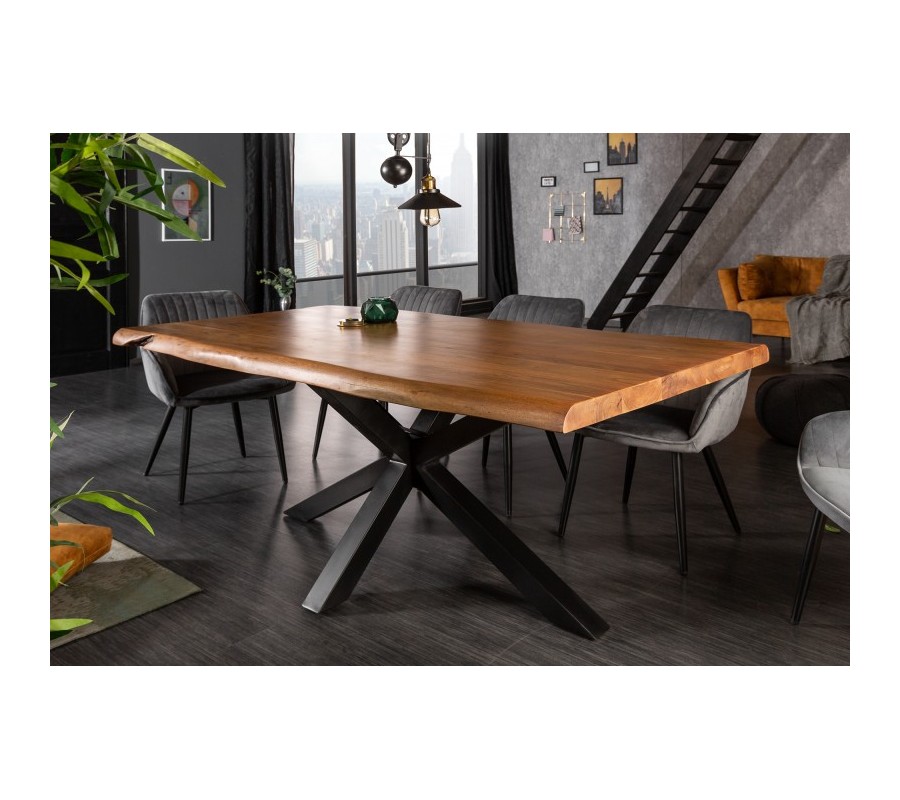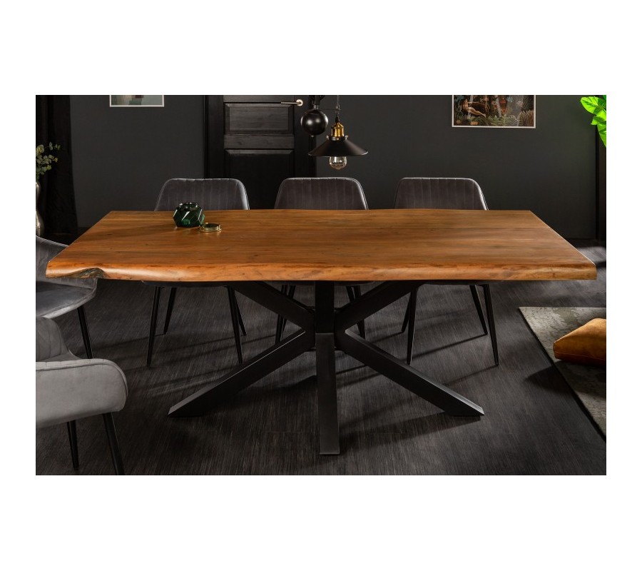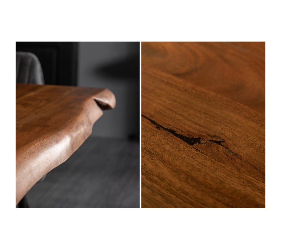 Luxusný jedálenský stôl z našej kolekcie nábytku Mammut je štýlovým kúskom, ktorý vynikne najmä v industriálne alebo moderne ladených priestoroch jedální, obývačiek či luxusných zasadacích miestností. Vo vašich priestoroch vytvorí jemný industriálny nádych vďaka kombinácii masívneho dreva s kovovou konštrukciou. Povrchová doska je vyrobená z kvalitného akáciového dreva s prírodnou hnedou povrchovou úpravou, ktorá u vás doma navodí naturálny dojem. Pispieva k nemu tiež organický tvar nepravidelných hrán. Naturálnej doske kontrastujú kovové nohy v čiernej farbe, ktoré sa v strede prekrižujú a vytvárajú industriálny vzhľad. Jedálenský stôl Mammut skvelo poslúži v moderných a industriálne ladených priestoroch. Dokonale ho doplnia kovové či masívne čalúnené stoličky a príborník či vitrína z rovnakých materiálov.