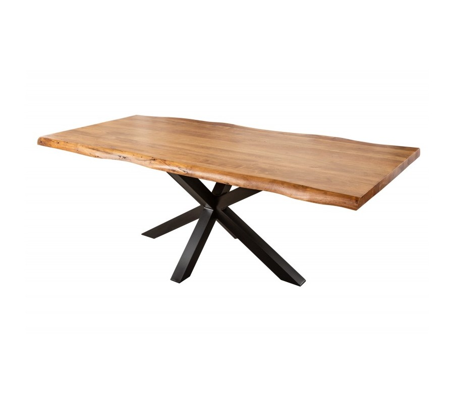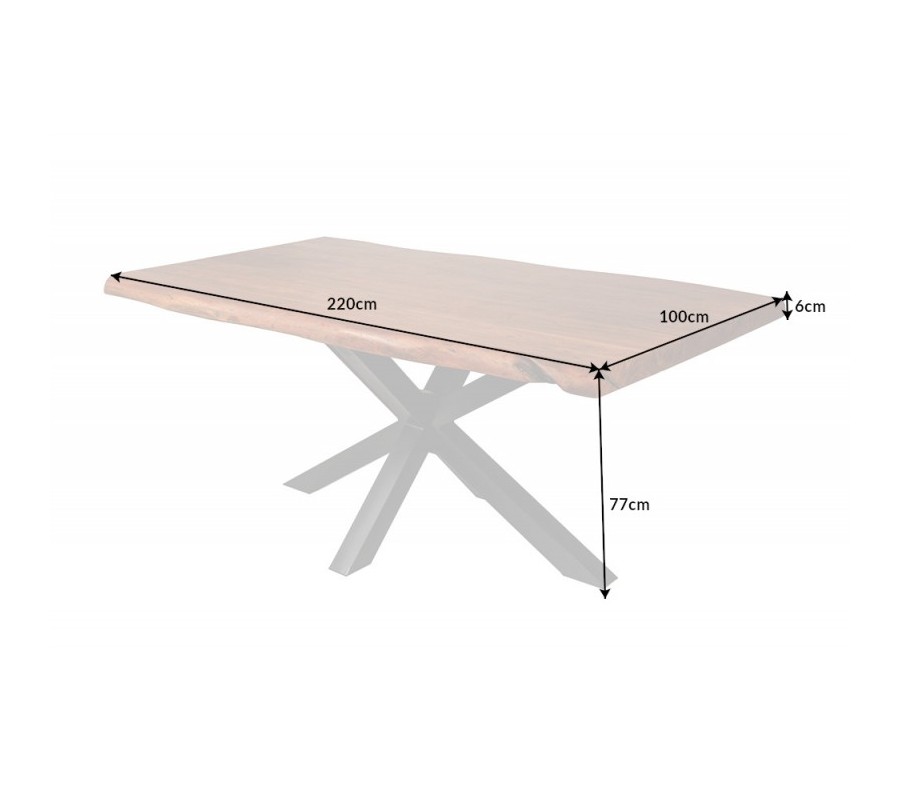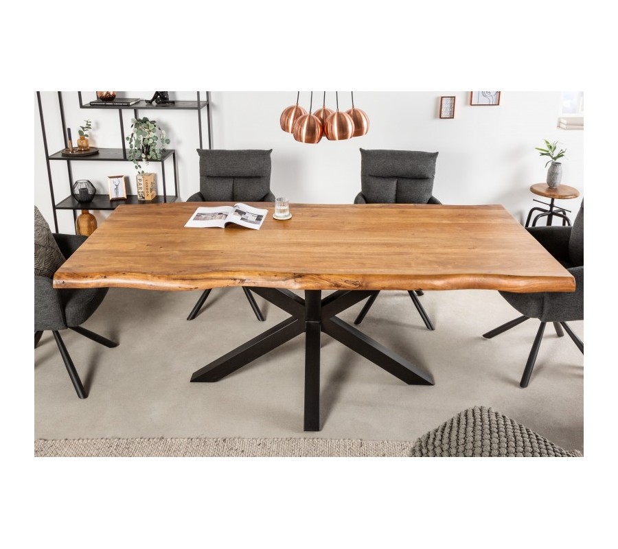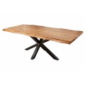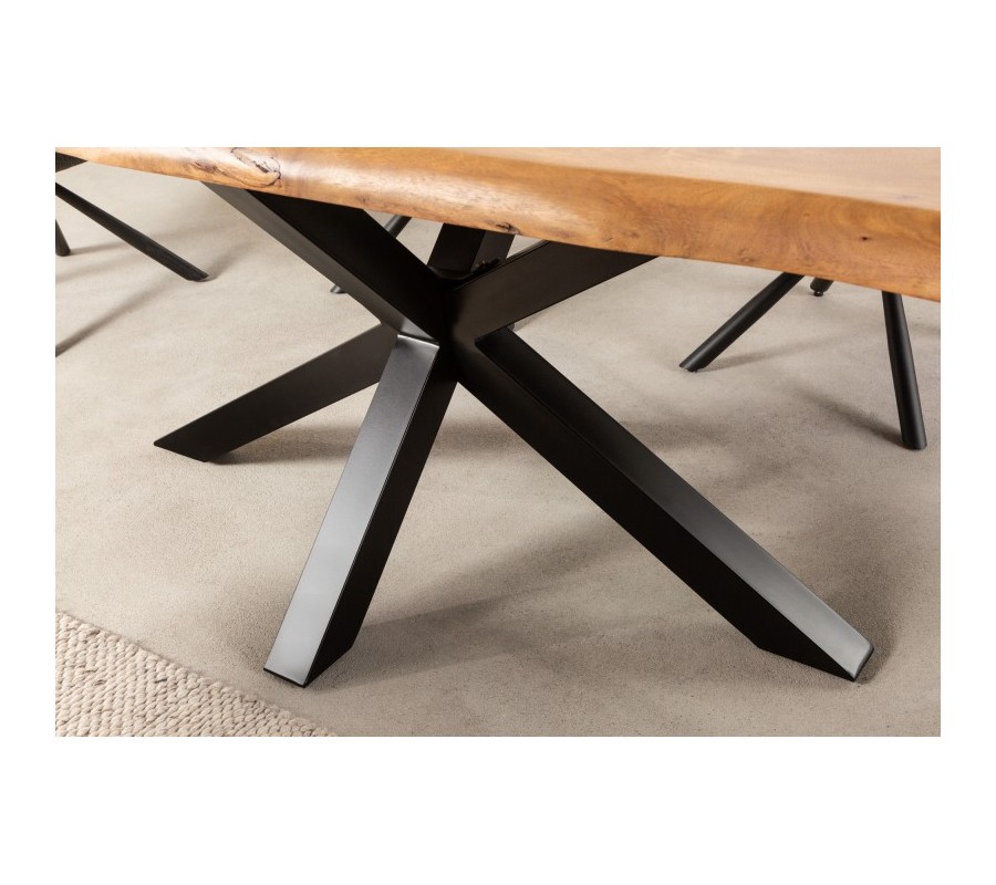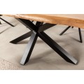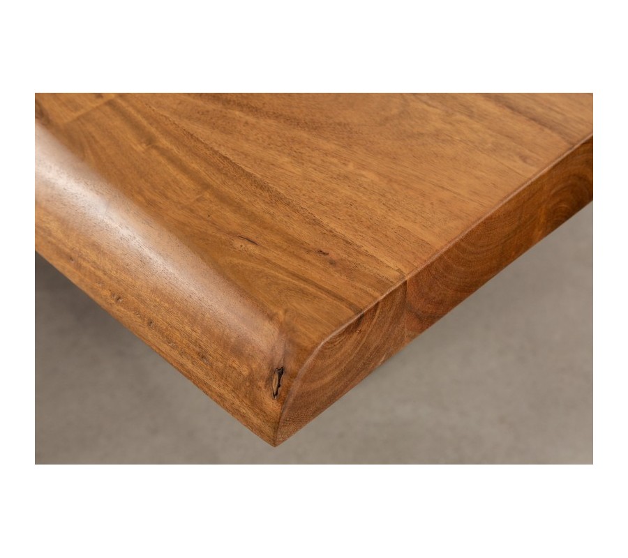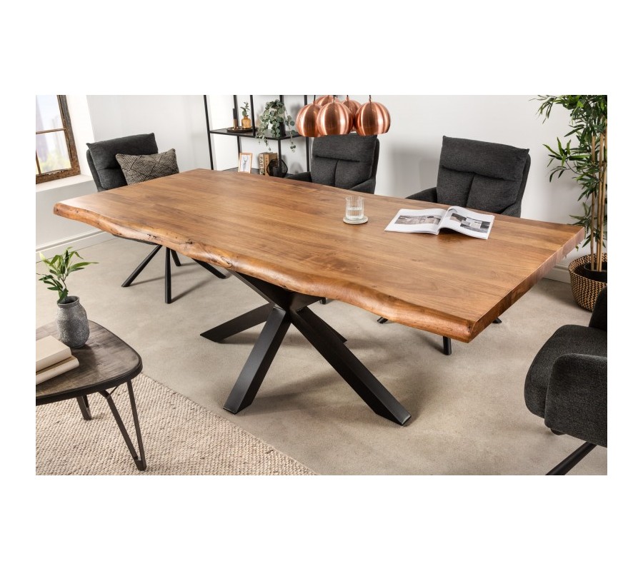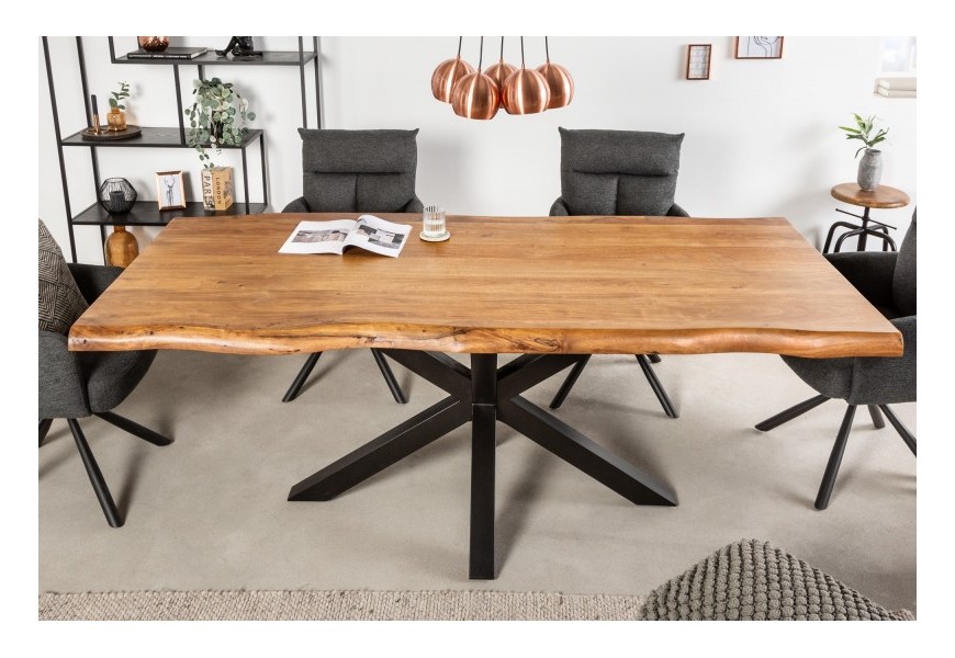Jedálenský stôl z našej štýlovej kolekcie Mammut je skvelým doplnkom pre početné rodiny či všetkých, ktorí milujú obedné posedenie s väčším množstvom hostí. Stôl okrem svojej veľkosti zaujme aj príjemným dizajnom. Je vyrobený z kvalitného masívneho akáciového dreva, pričom povrchová úprava necháva vyniknúť jeho prirodzenú kresbu. Dostáva tak krásny naturálny vzhľad, ku ktorému prispieva aj prírodná hnedá farba a organický tvar dosky s nepravidelne zaoblenými hranami. K prírodnému masívu vytvárajú kontrast mohutné čierne nohy z kovu, ktoré sa v strede križujú a vytvárajú tak zaujímavý moderný efekt. Táto materiálová aj farebná kombinácia zároveň dodáva stolu nádych industriálneho štýlu, ktorý štýlovo obohatí všetky moderné priestory. Jedálenský stôl Mammut odporúčame kombinovať s čalúnenými koženými alebo kovovými stoličkami a masívnou vitrínom či príborníkom. Je vhodný pre stolovanie až 8-10 ľudí.