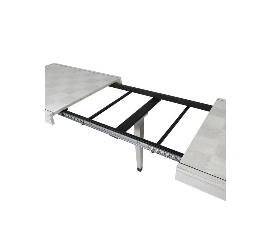 Jedálenský stôl z kolekcie moderného nábytku Quadria Blanca je kúskom vhodným do nadčasových jedální, obývačiek či kuchýň. Zaujme svojím prevedením v bielej off white farbe, vďaka čomu vaše priestory presvetlí a rozžiari. Disponuje obdĺžnikovou povrchovou doskou z masívneho dubového dreva, ktorej povrch zdobí štvorcový vzor tvorený precíznym ukladaním jednotlivých kúskov dreva s rôznymi smermi letokruhov. Jedálenský stôl tiež poteší možnosťou rozloženia na dĺžku ať 356 centimentrov, čo umožní pohodlné stolovanie pre 12-14 ľudí. Je tak vhodným aj pre väčšie rodiny či všetkých, ktorí doma radi privítajú hostí. Elegantnú vrchnú dosku dopĺňajú jednoduché zužujúce sa nožičky zdobené čiernymi prvkami na spodnej časti. Jedálenský stôl Quadria Blanca vkusne doplní moderne ladené priestory v kombinácii s drevenými čalúnenými stoličkami a kovovými doplnkami v čiernej či inej výraznej farbe, ktoré dotvoria štýlový moderný kontrast!