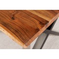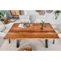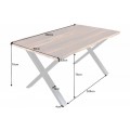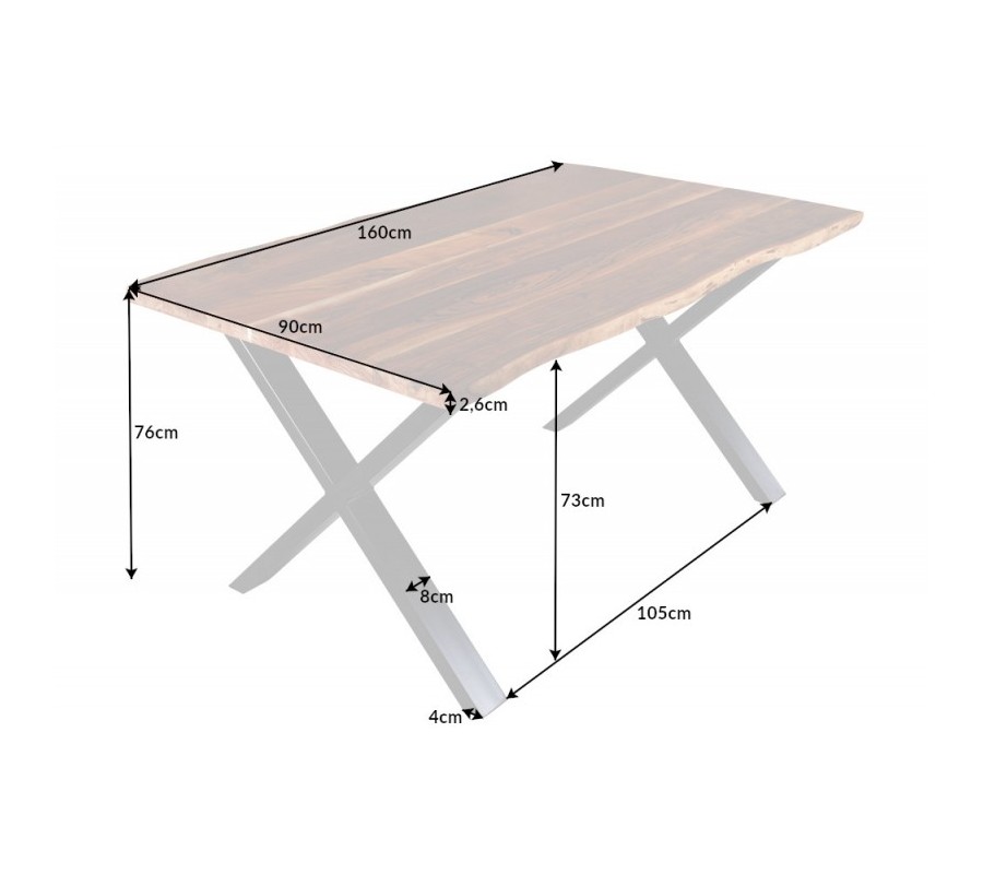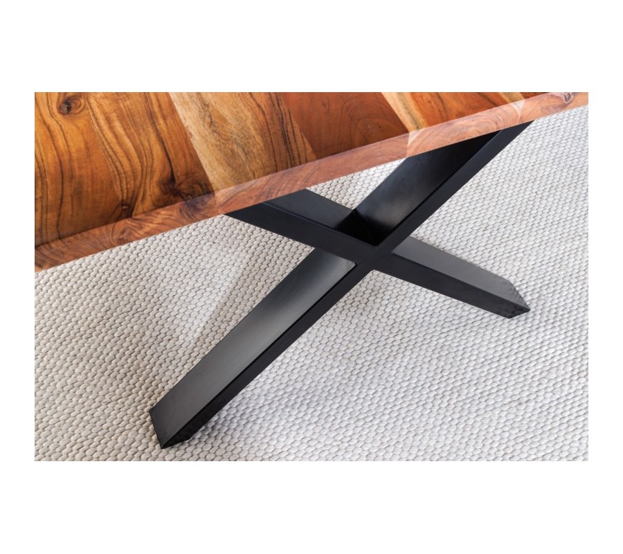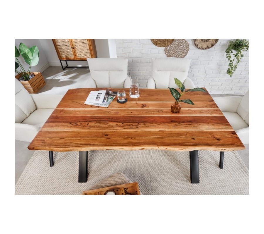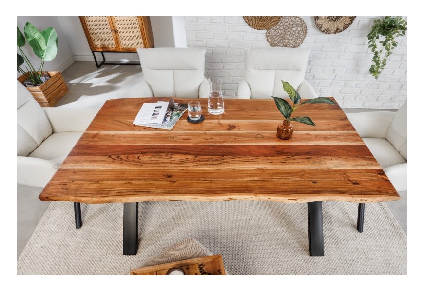 Masívny jedálenský stôl Mammut vkusne doplní moderné a industriálne ladené jedálne, kuchyne či obývačky. Tento priestranný stôl sa vyznačuje svojím elegantným naturálnym vzhľadom tvoreným obdĺžnikovou vrchnou doskou z masívneho akáciového dreva prírodnej hnedej farby. Dosku zdobí prirodzená kresba dreva, ktorá k vám domov vnesie nádych prírody. Kontrastne k svetlohnedému masívu pôsobia mohutné nohy z kovu prekrížené do tvaru X, ktoré zabezpečujú výbornú stabilitu a zároveň dotvárajú originálny industriálny vzhľad stola. Jedálenský stôl Mammut je tak dokonalým kúskom na doplnenie industriálne, moderne či alternatívne ladených priestorov, či už sa jedná o súkromné interiéri alebo verejné priestory reštaurácií, firiem či zasadacích miestností. Stôl vhodne doplnia kovové alebo kožené čalúnené stoličky v kontrastných farbách a doplnky z prírodných materiálov. Stôl Mammut je vhodný pre pohodlné stolovanie až 8 ľudí.