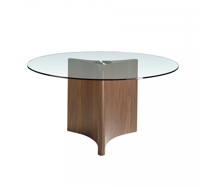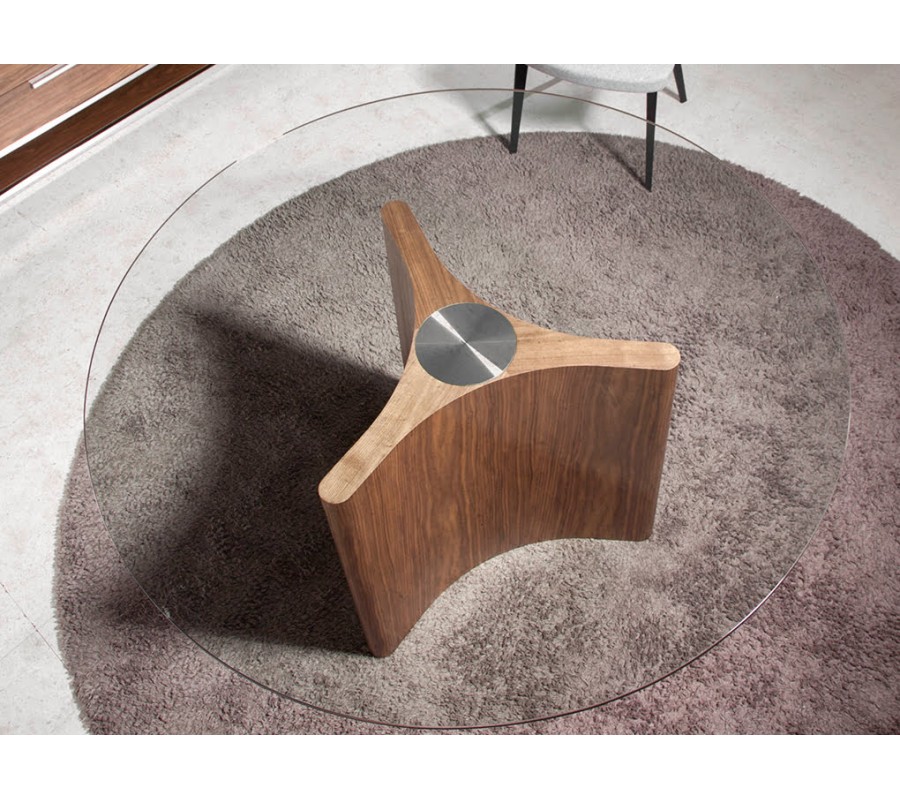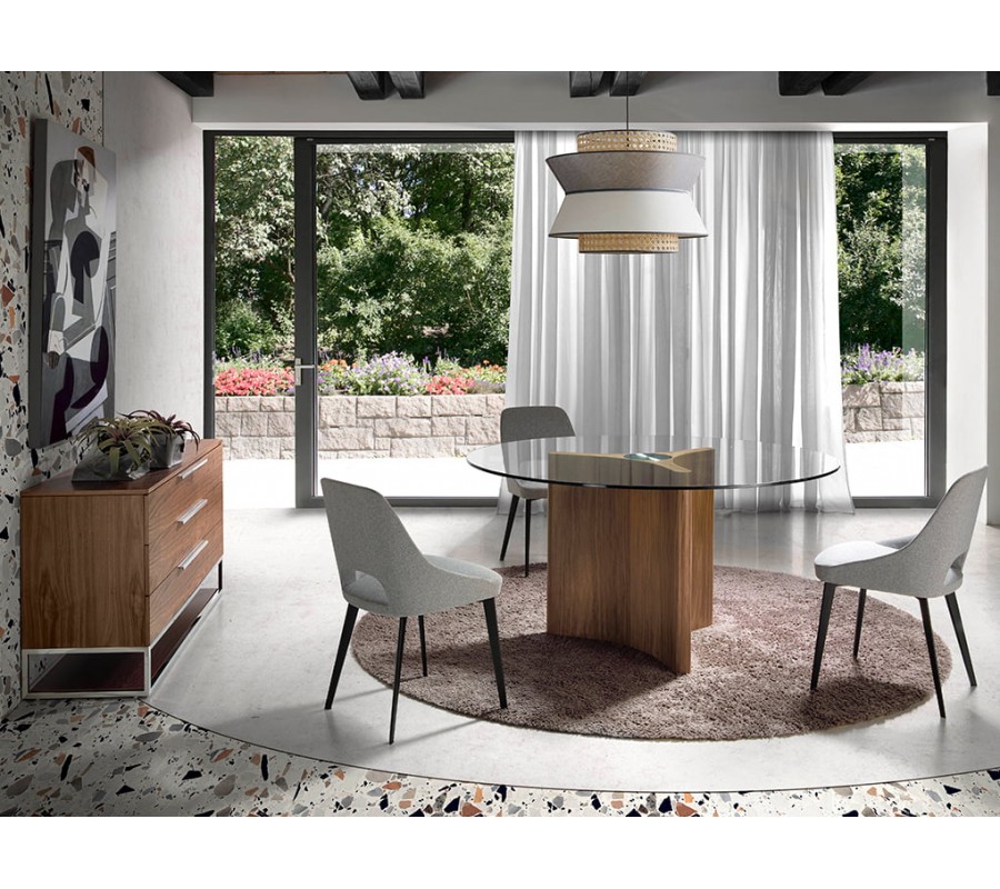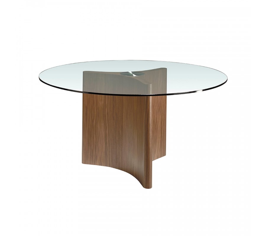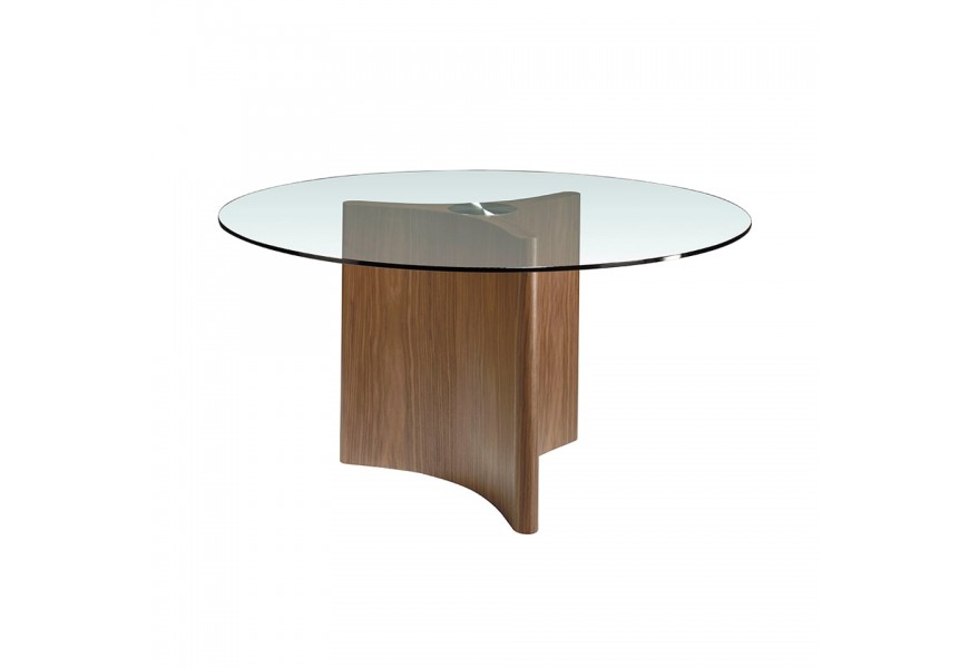 Unikátne prevedenie jedálenského stola Vita Naturale zaručuje jeho okrúhla vrchná doska z 10mm hrubého tvrdeného skla, ktorá je zárukou odolnosti a funkčnosti. Vzdušná vrchná doska jedálenského stola je zasadená do sofistikovane navrhnutej podstavy v elegantných líniách s tromi zaoblenými hranami, vďaka čomu vzniká luxusný avantgardný dizajn, ktorý obohatí vzhľad Vášho interiéru. Podstava je vyrobená z hnedého borovicového masívneho dreva, obohatené o kvalitné orechové dyhovanie, ktoré prinesie prírodný a zároveň veľmi moderný vzhľad do Vášho domova. Troj