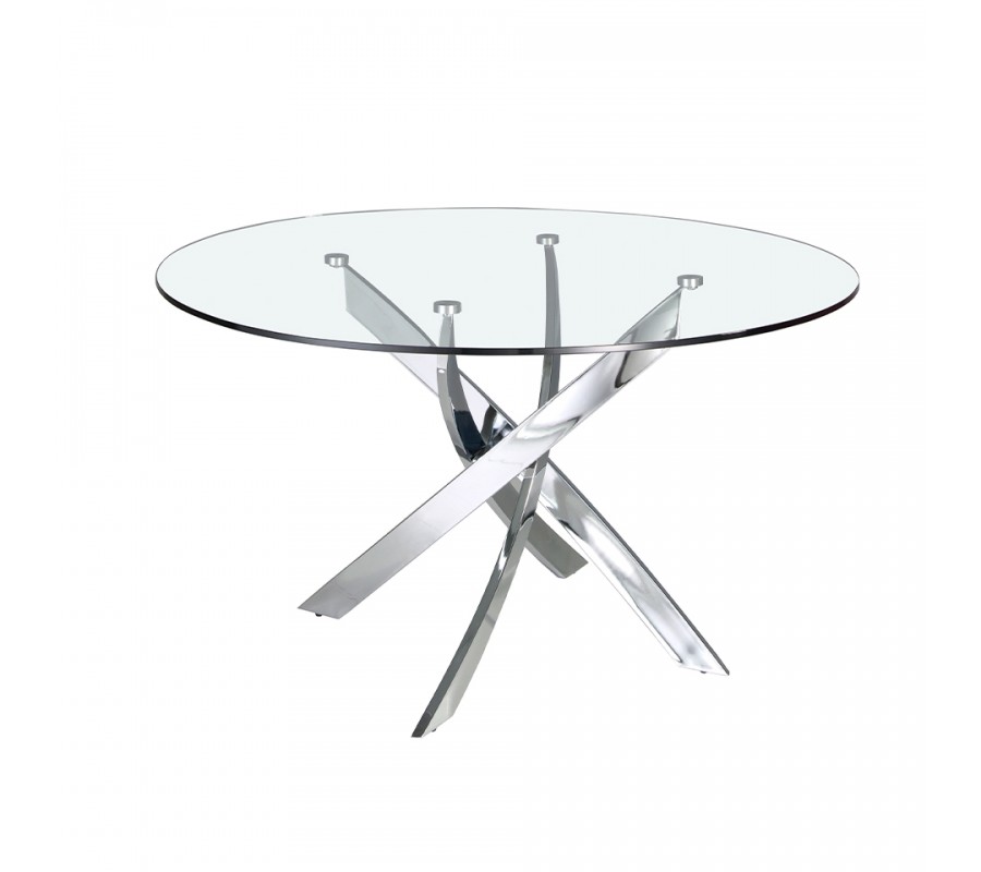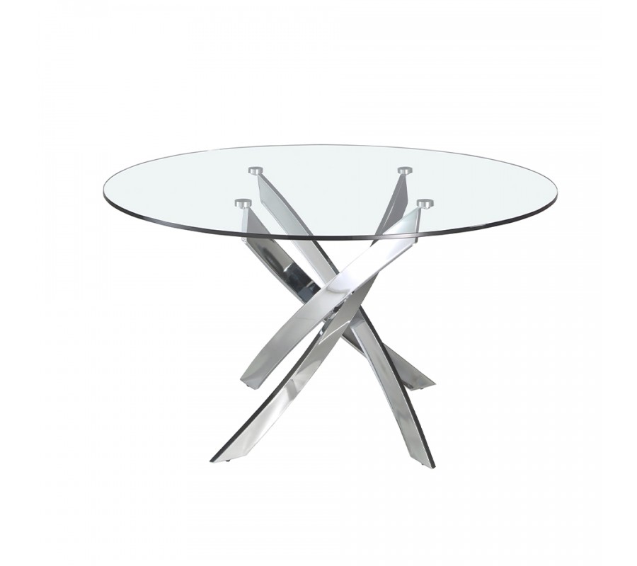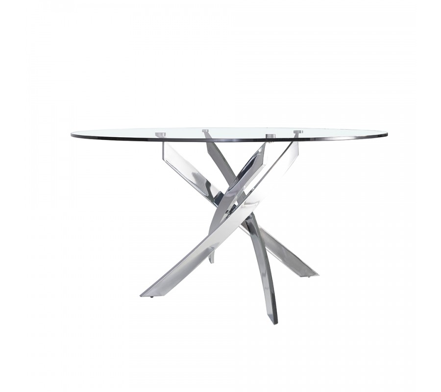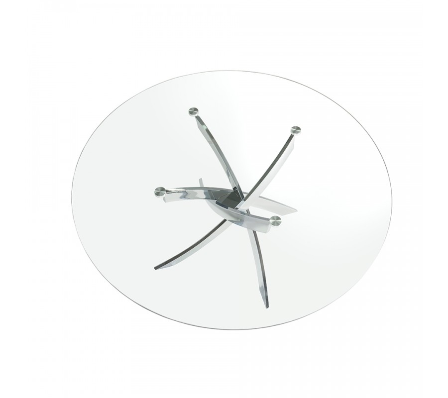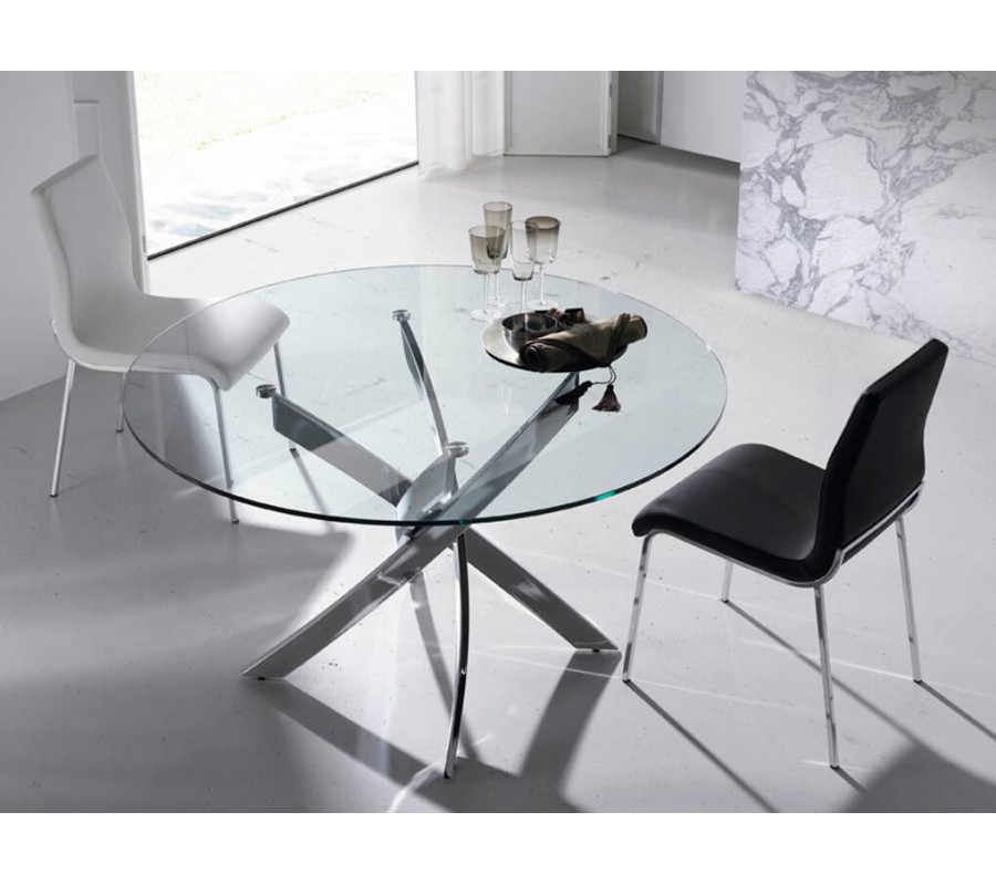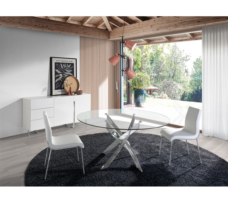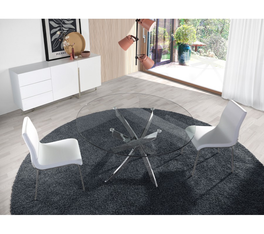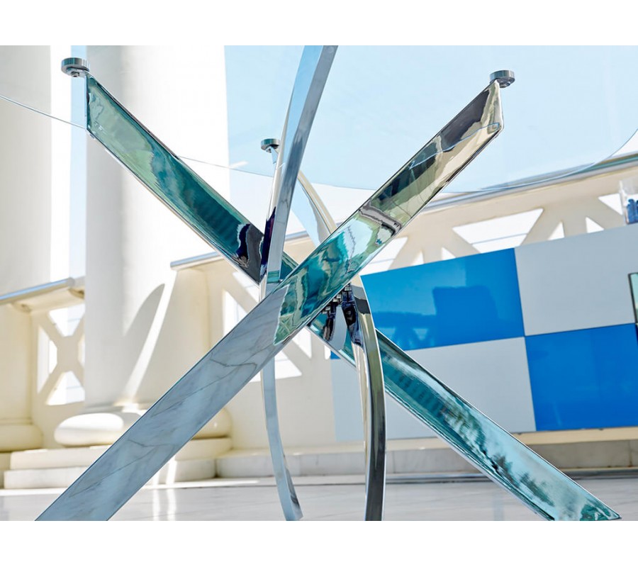Okrúhla vrchná doska jedálenského stola Urbano disponuje vyhotovením z 12mm hrubého tvrdeného skla, obohateného o fazetové okraje. Sklenené vyhotovenie opticky zväčší Váš priestor a taktiež ho dokáže osveliť, čo umocní moderný vzhľad Vášho interiéru. Vrchná doska je zasadená do dizajnovej podstavy z pochrómovanej nehrdzavejúcej ocele, ktorá je jedinečným štýlovým a pútavým prvkom. Jej sofistikovaný vzhľad krásne kombinuje rôzne geometrické tvary, čo vytvorí nádych avantgardného štýlu.
