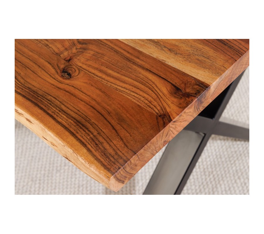 Jedálenský stôl Mammut z našej rovnomennej kolekcie je dominantným kúskom vhodným na zariadenie modernej či industriálne ladenej jedálne, obývačky alebo kuchyne. Predstavuje štýlový kúsok s prírodným nádychom, ktorý poskytuje kvalitné spracovanie, originálny vzhľad a dlhú životnosť. Dominantným prvkom dizajnu sú mohutné čierne nohy z kovu prekrížené do tvaru písmena X, ktoré vytvárajú nezameniteľný industriálny vzhľad. Podstavu dopĺňa vrchná doska z masívneho dreva, ktorá zjemňuje celkový dizajn svojimi organickými líniami a prírodnou hnedou farbou. Jemné zaoblenie hrán a krásna prirodzená kresba dreva vnášajú do dizajnu jedinečný nádych prírody, ktorý vaše priestory príjemne zútulní. Jedálenský stôl Mammut si svoje miesto nájde v svetlejšie i tmavšie ladených priestoroch, kde ho vhodne doplnia čalúnené stoličky s kovovými nožičkami. Pre umocnenie industriálneho vzhľadu odporúčame tiež kombináciu s kovovými doplnkami ako sú nástenné poličky či dizajnové svietidlá. Stôl je vhodný pre komfortné stolovanie 6-8 ľudí.