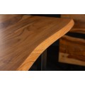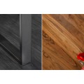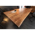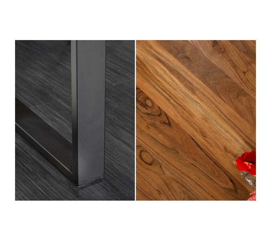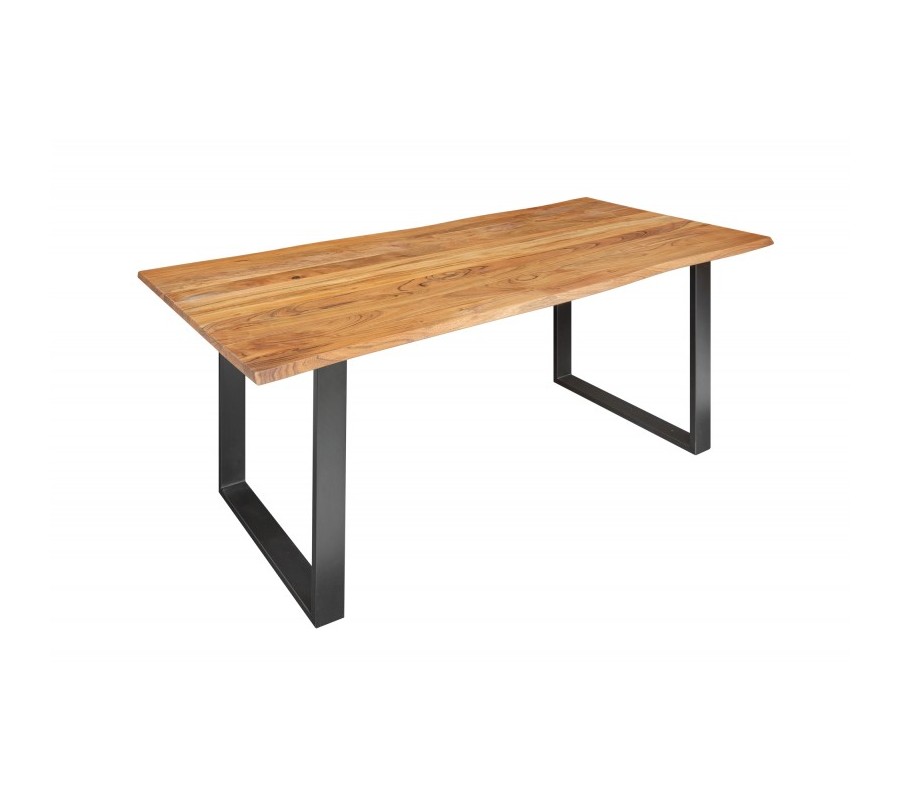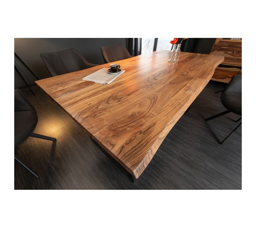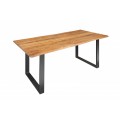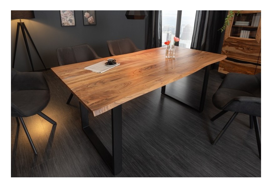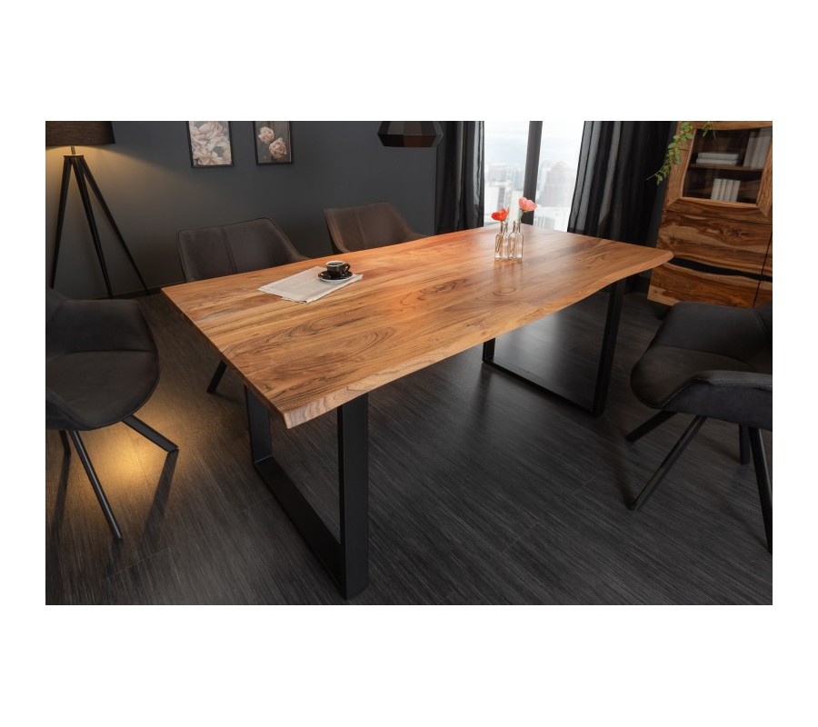 Kombinácia kvalitného dreva a pevnej kovovej konštrukcie reprezentujúcej industriálny štýl je základným kameňom jedálenského stola z kolekcie Mammut. Vrchná doska tvoriaca dominantnú časť stola je vyrobená z exotického akáciového masívu v krásnej prírodnej hnedej farbe v svetlom odtieni. Na prvý pohľad zaujme jej tvar obdĺžnika s nepravidelným okrajom s výbežkami, ktoré umocňuje naturálnosť akáciového stromu spolu s uzlami a letokruhmi prirodzene sa vyskytujúcimi v použitom dreve. Stabilitu a pevnosť konštrukcie zabezpečujú kovové nohy štýlovo spojené v spodnej časti do dvoch celkov. Kovové nohy majú čiernu farbu s matným efektom, čo príjemne ladí so svetlo hnedým drevom a vo vašej jedálni si nájde miesto popri industriálne ladených stoličkách na čiernych nožičkách či regáloch z kovu. Ako doplnok sú vhodné industriálne lustre geometrických tvarov. Jedálenský stôl Mammut otvára veľké množstvo možností na výber farebnosti vašej jedálne - či už si zvolíte výrazné pastelové alebo tlmené zemité farby - rozhodne krok vedľa neurobíte! Pohodlne zaň usadíte 4 - 6 osôb.
