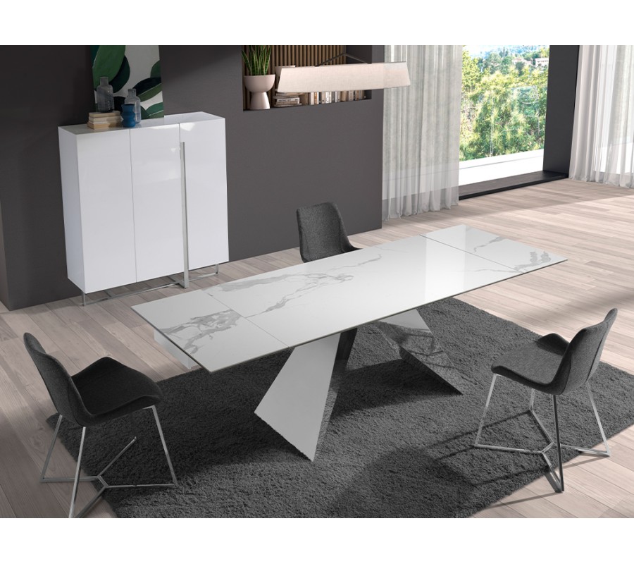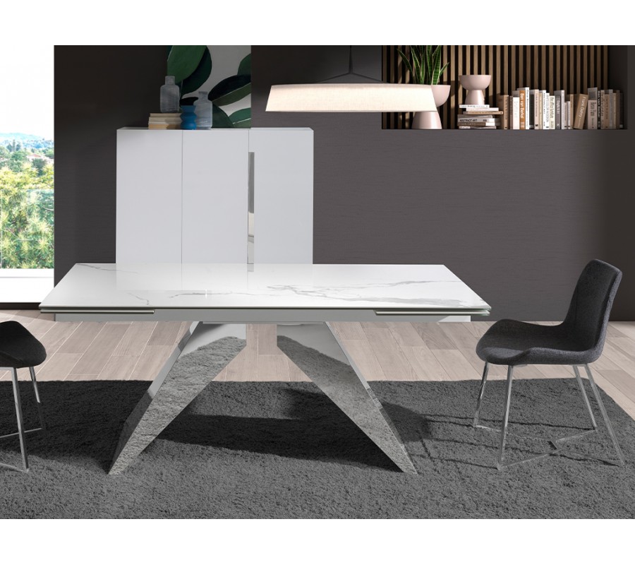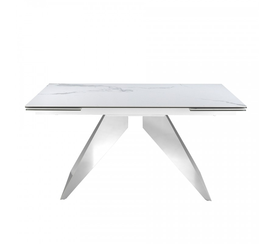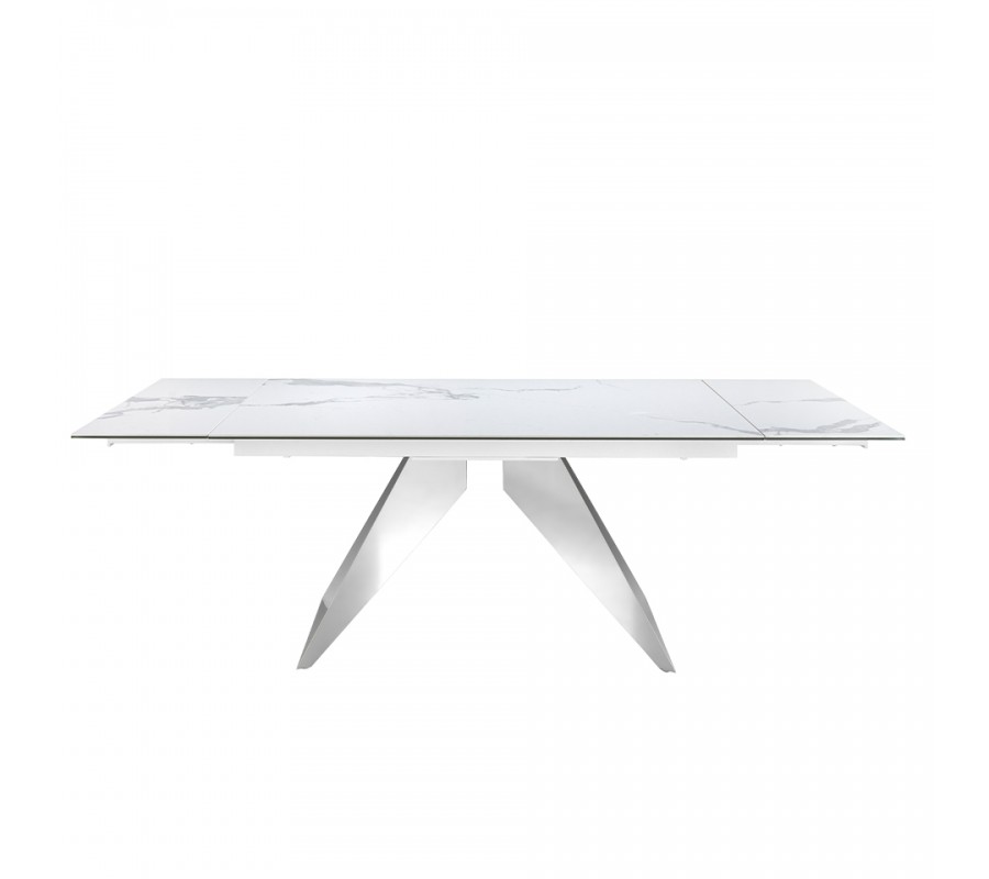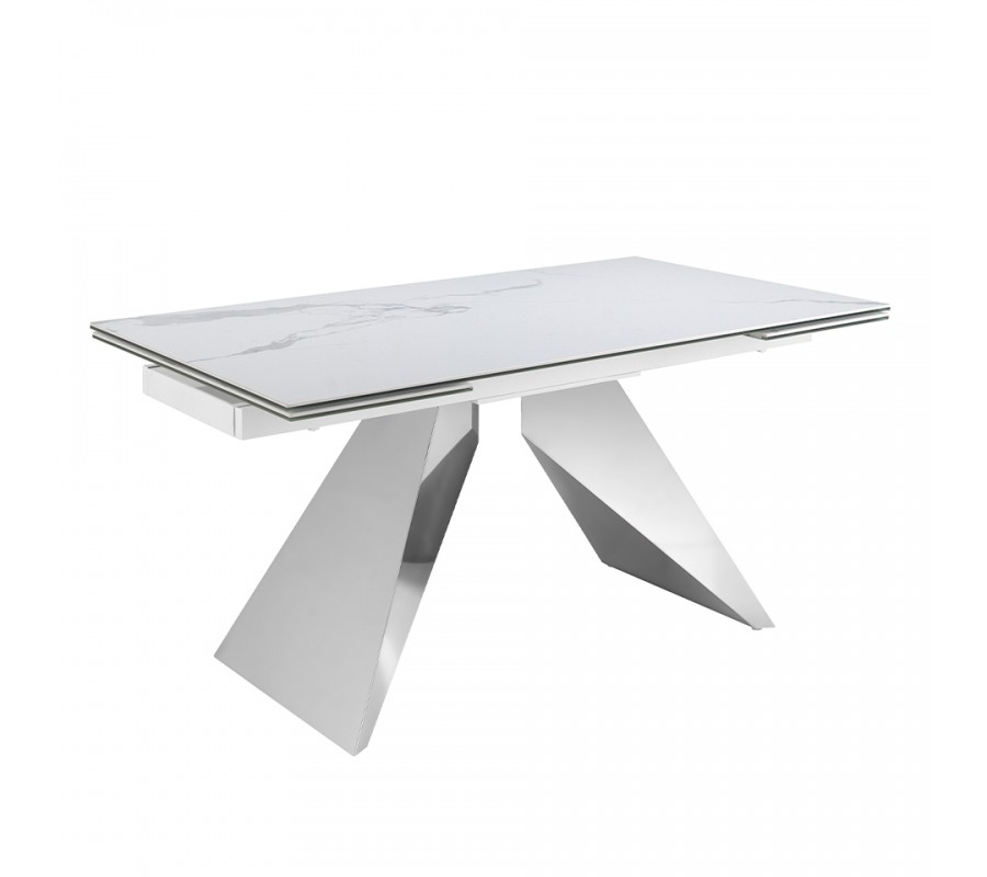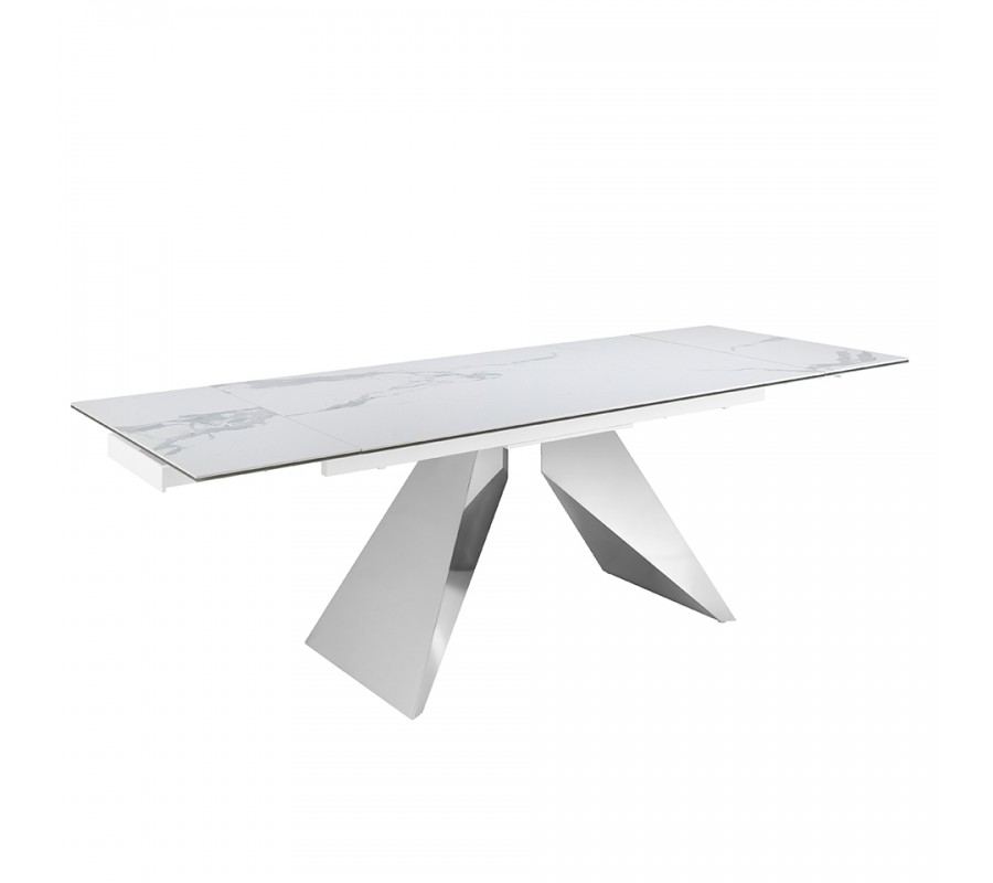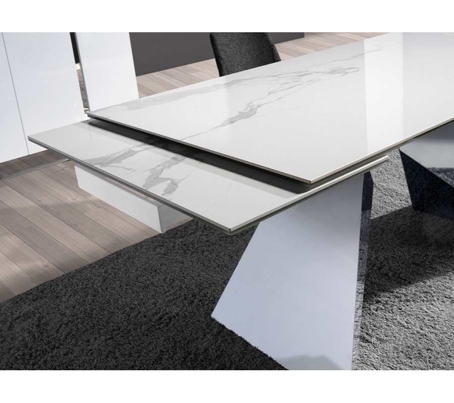 Vrchná doska má exkluzívny dizajn bieleho mramoru s jemnou sivou kresbou, ktorý dodáva stolu luxusný vzhľad. Je vyrobená z porcelánu a poskytuje pevný povrch s nenáročnou údržbou. Lesklý finiš zdôrazňuje eleganciu mramoru a výborne korešponduje s chrómovým prevedením podstavy.