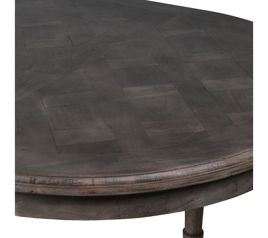 Luxusný oválny jedálenský stôl Marqueta vo vidieckom štýle s vrchnou doskou s parketovým dizajnom sivá 230 cm