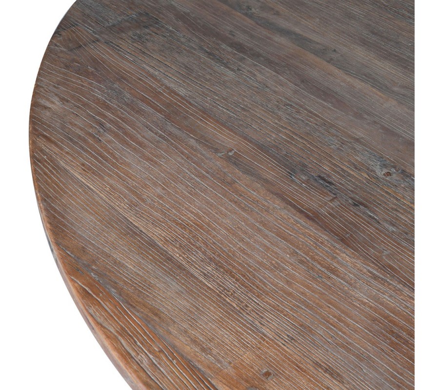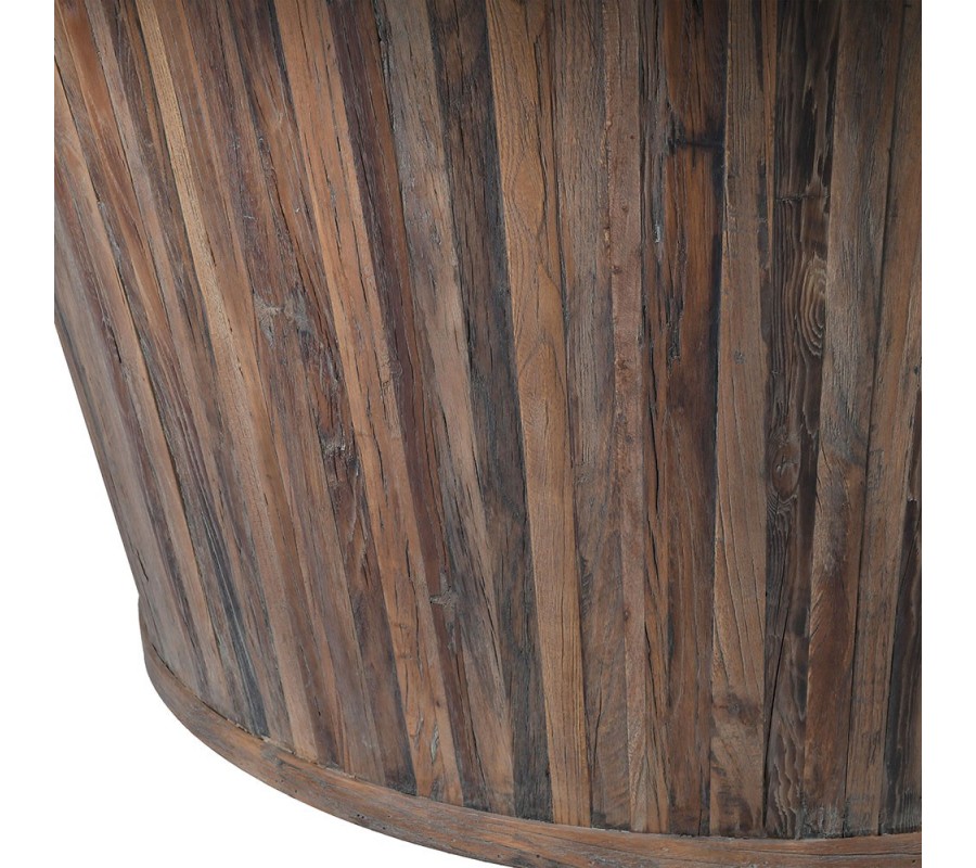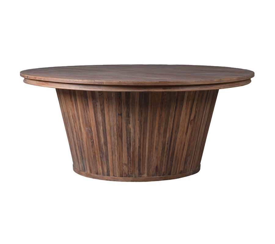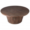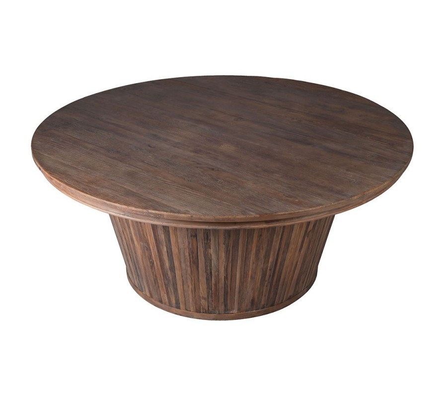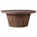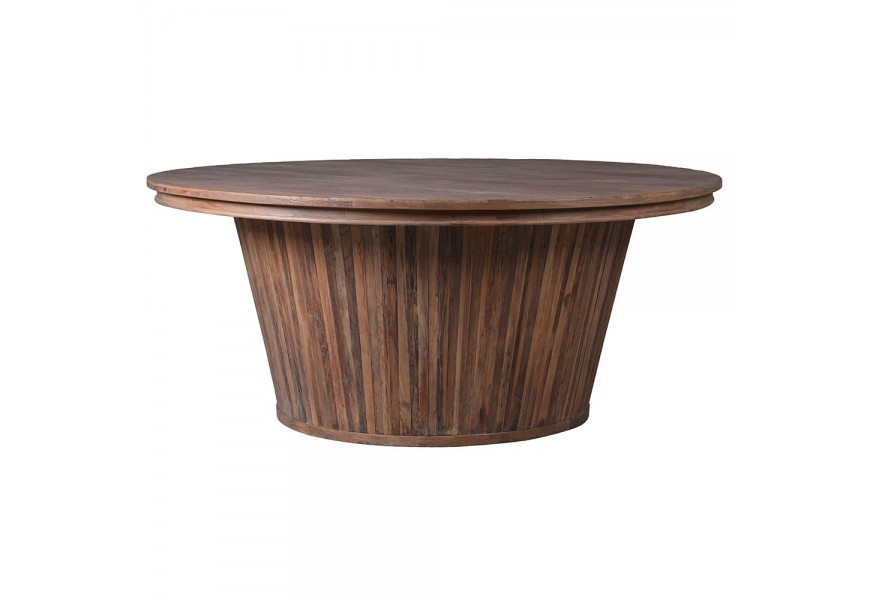 Luxusný okrúhly jedálenský stôl Tambour so širokou nohou s vertikálnym vzorom z brestového dreva vo vintage štýle hnedá 180 cm