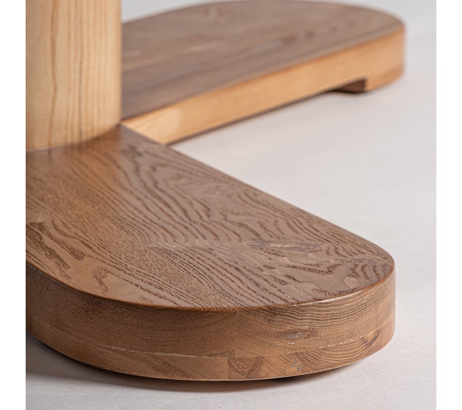 Luxusný jedálenský stôl Budhir disponuje mohutnou nohou, vyrobenou z kombinácie dubového masívu a borovice vo svetlo hnedej farbe, vďaka čomu vznikne moderný a teplý prírodný vzhľad. Noha jedálenského stola ponúka stabilitu pre okrúhlu vrchnú dosku v čiernom kamennom prevedení, ktorá vynikne svojou odolnosťou a kontrastným vzhľadom.