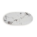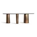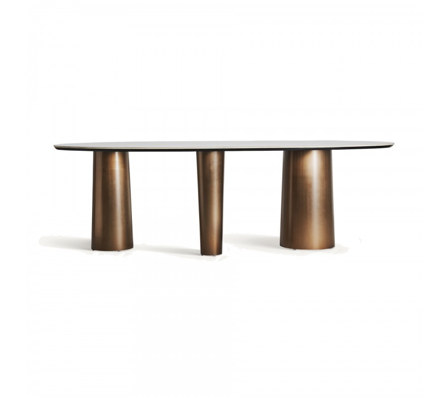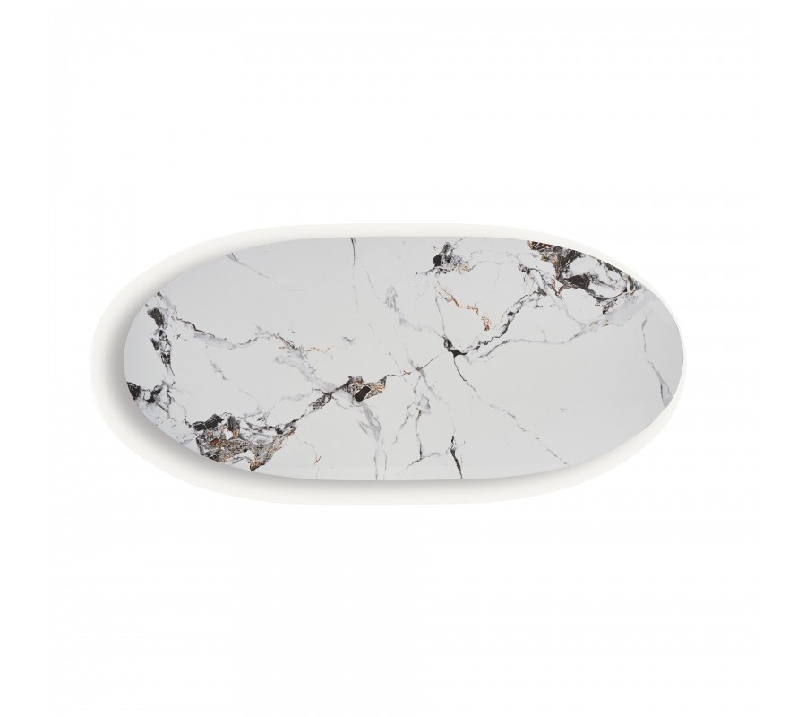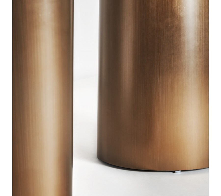 Jedálenský stôl Marinna vás očarí svojou jedinečnou siluetou a bude honosným stredobodom vašej jedálne. Kombinácia bieleho mramoru a zlatej farby pôsobí luxusný dojmom a navodzujú atmosféru éry art-deco. Dizajnu dominujú tri nohy, ktoré svojím atypickým tvarom prinášajú do art-deco estetiky charakteristickej geometrickou symetriou skulpturálny avantgardný prvok. Ich hrúbka a masívny vzhľad poskytujú stabilnú podstavu pre oválnu dosku zo syntetického bieleho mramoru. Tento materiál je u návrhárov nábytku nesmierne obľúbený, nakoľko je možné pri výrobe ovplyvniť vizuálne vlastnosti podľa potrieb dizajnu, no zároveň vďaka zloženiu obsahujúce mramorový prach, disponuje rovnakou pevnosťou a odolnosťou ako prírodný kameň. Na kresbe vrchnej dosky sa striedajú odtiene sivej a hnedožltej, ktoré skvele korešpondujú s farbou podstavy. Stôl môžete doplniť jedálenskými stoličkami so zlatými nožičkami a zamatovým alebo buklé čalúnením, alebo stoličkami Marinna, ktoré nájdete v našej ponuke. Svetlá farba mramoru dodáva stolu elegantnú a sofistikovanú jemnosť, ktorú ešte môžete podčiarknuť doladením jedálne do svetlých odtieňov, no zároveň vám umožňuje pridať aj výraznejšie sýte farby a vzory. Túto extravagantnú glamour estetiku môžete tiež doplniť lesklými metalickými dekoráciami či opulentným lustrom.