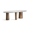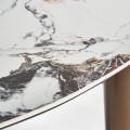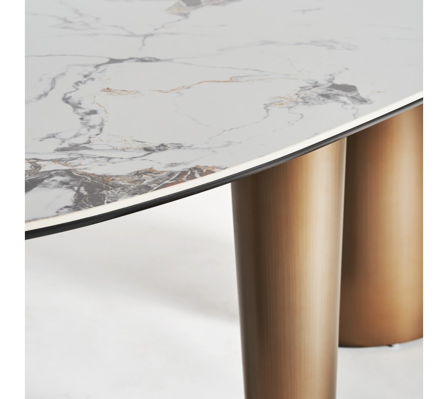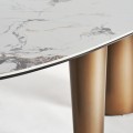 Luxusný oválny jedálenský stôl Marinna v art deco štýle s asymetrickými zlatými nohami a bielou mramorovou doskou 240 cm