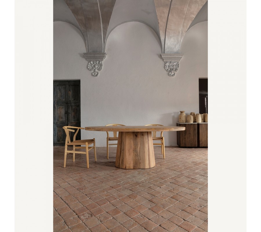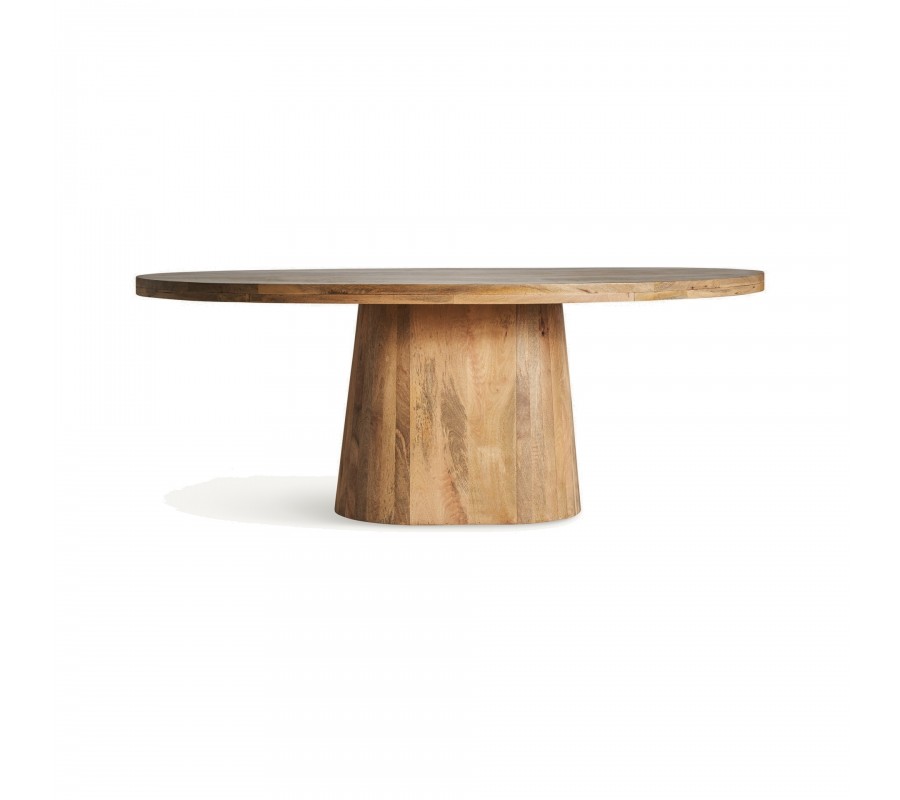 Luxusný moderný jedálenský stôl Malen v oválnom tvare predstavuje spojenie elegantného moderného dizajnu s príjemným vidieckym šarmom. Vyrobený z masívneho dreva v hlbokom odtieni hnedej farby, tento stôl vyžaruje pocit tepla a prirodzenosti, čo dodáva miestnosti útulnú atmosféru.