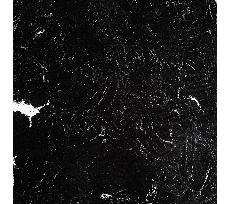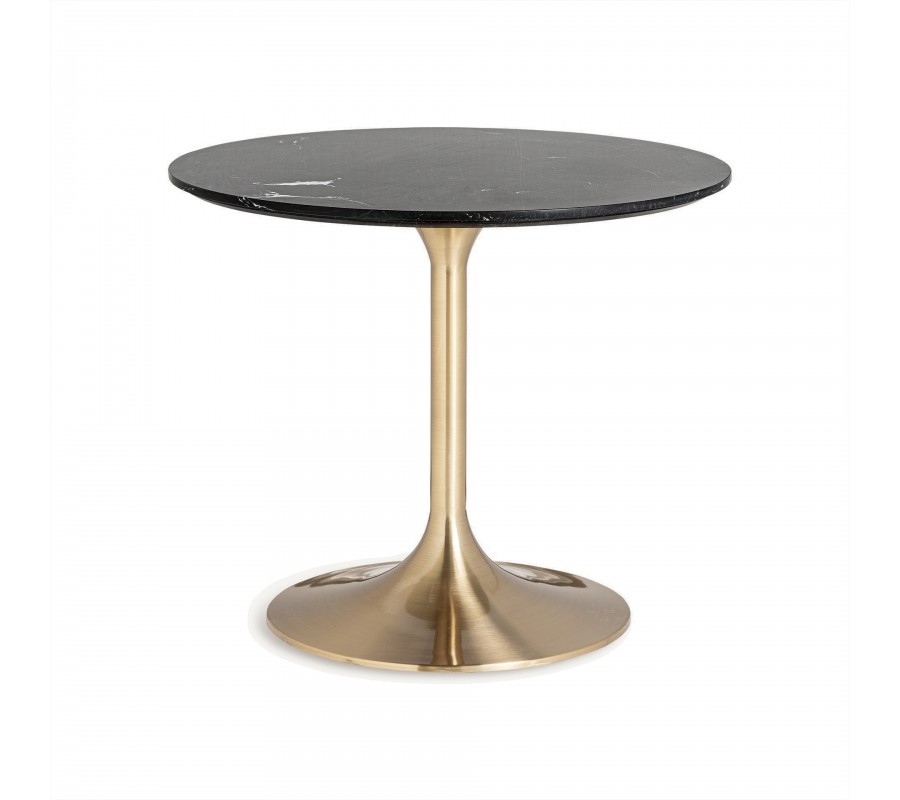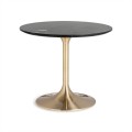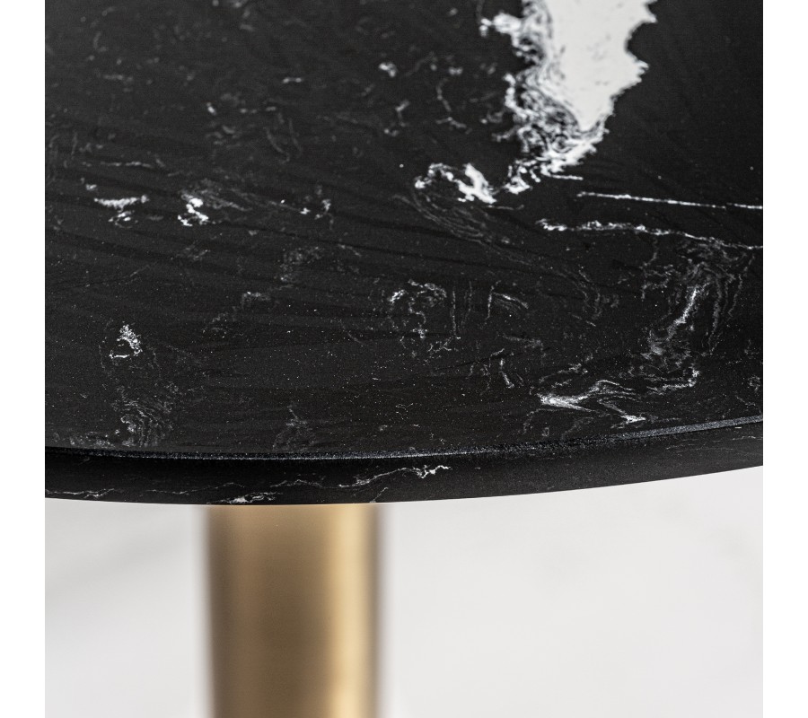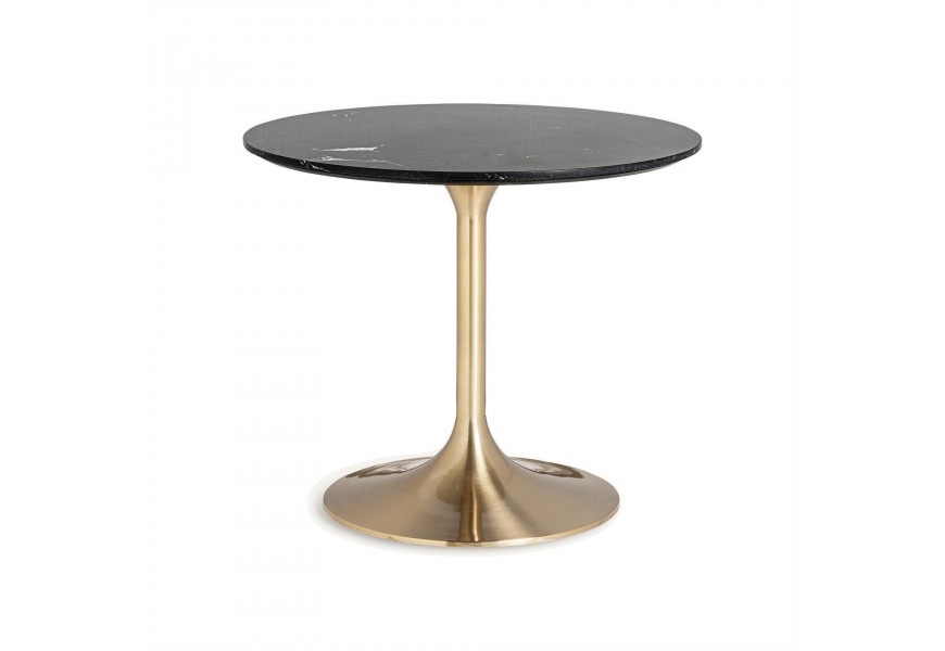 Luxusný art deco okrúhly jedálenský stôl Brilon s čiernou vrchnou doskou s mramorovým dizajnom a zlatou nohou 90 cm