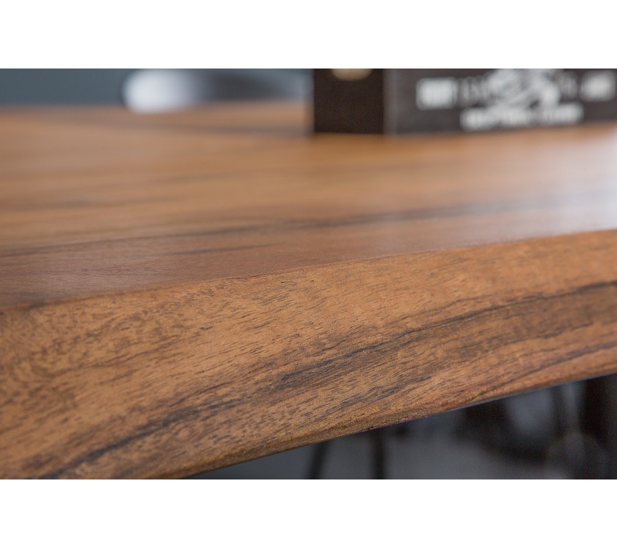 Vrchná doska má obdĺžnikový tvar, ktorý na dlhších hranách kopíruje prírodné štruktúry materiálu a dodáva stolu originálny asymetrický vizuálny prvok. Je vyrobená z masívneho akáciového dreva v teplom medovom odtieni hnedej.
